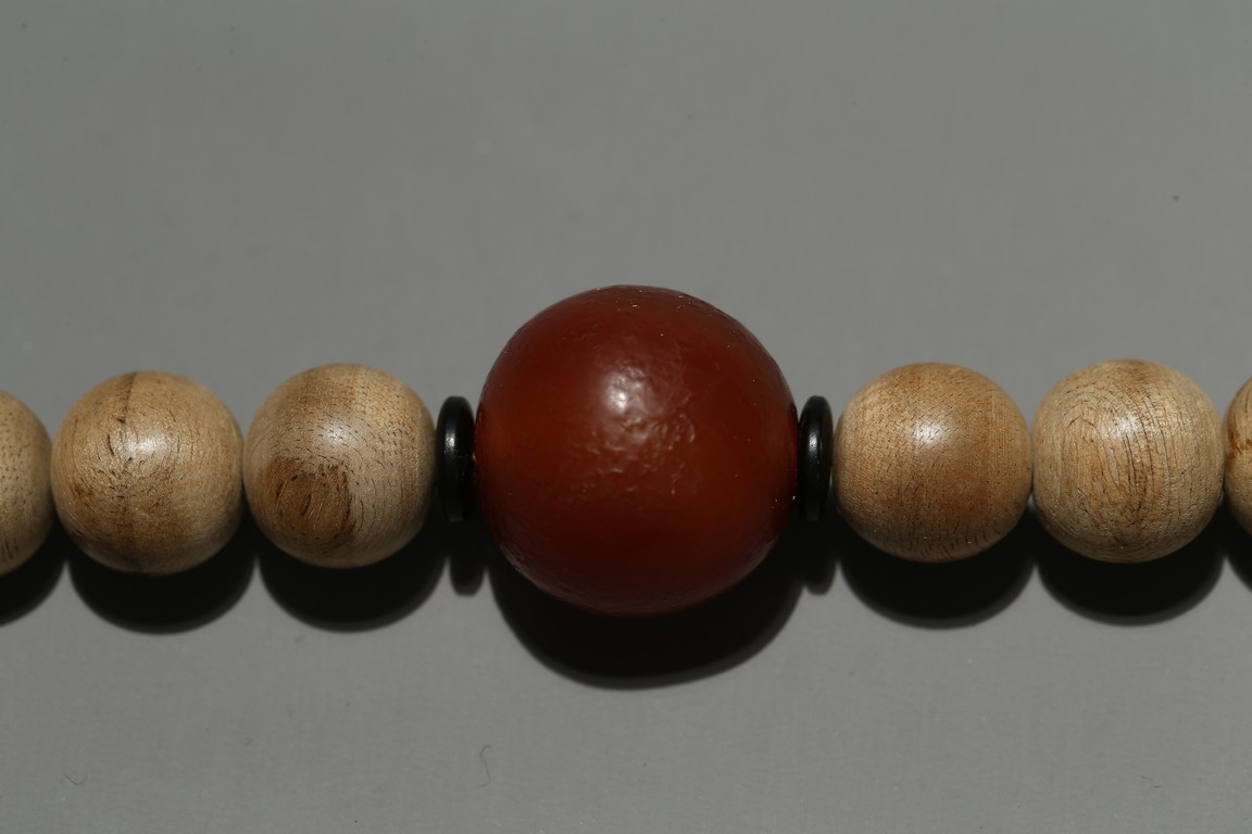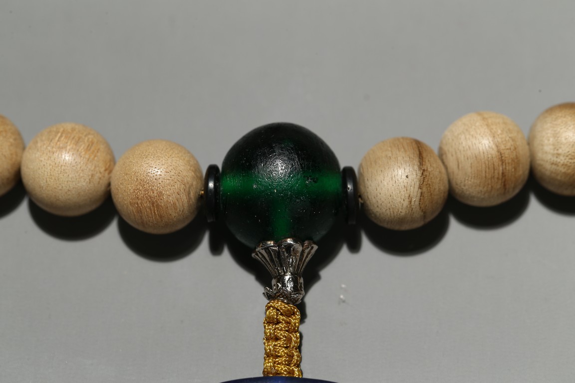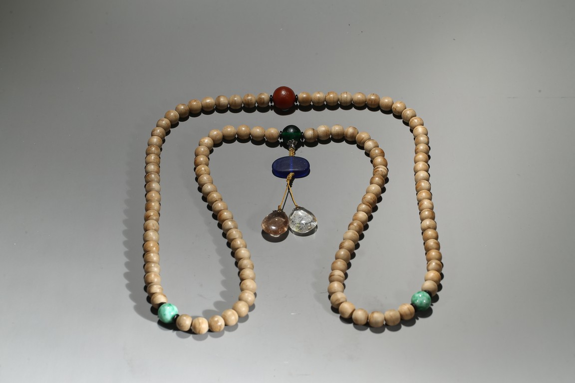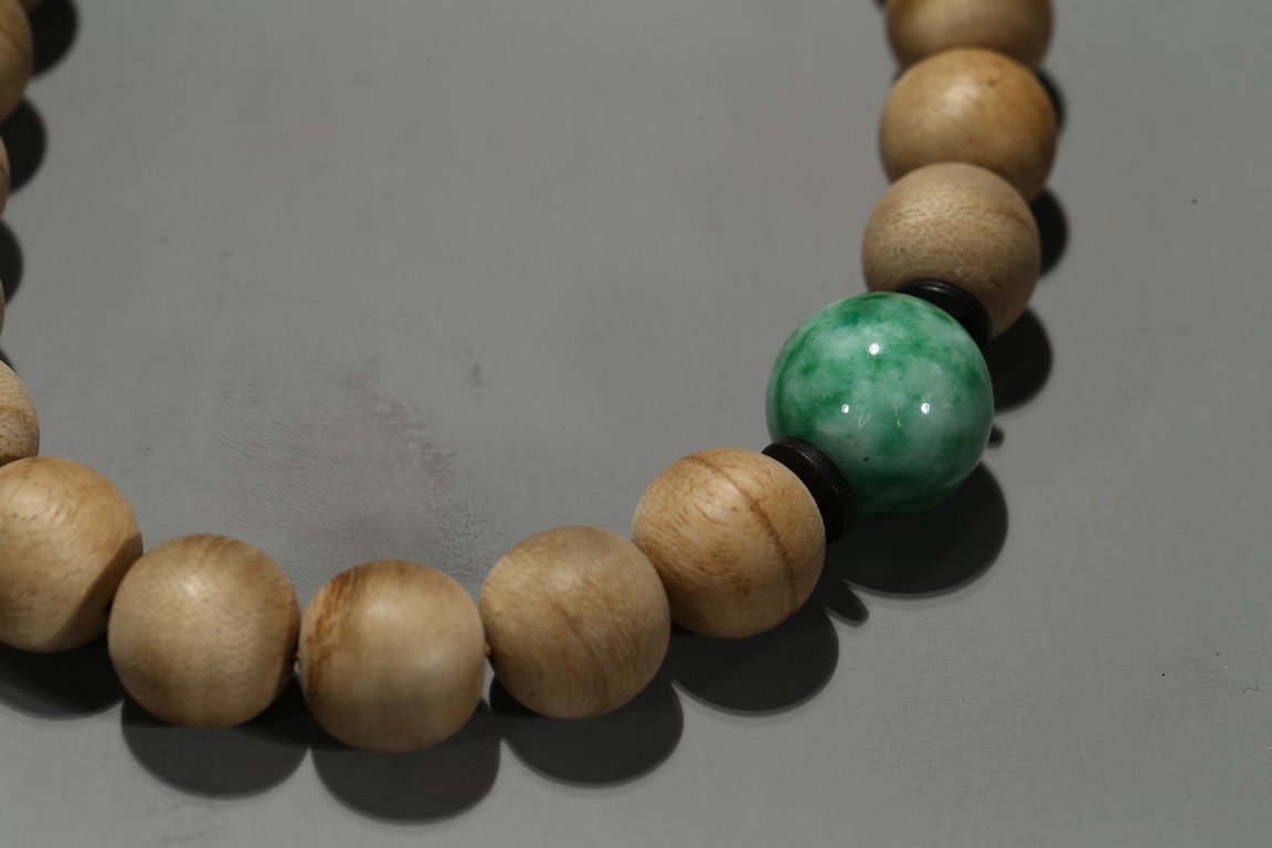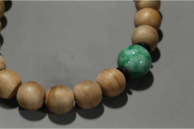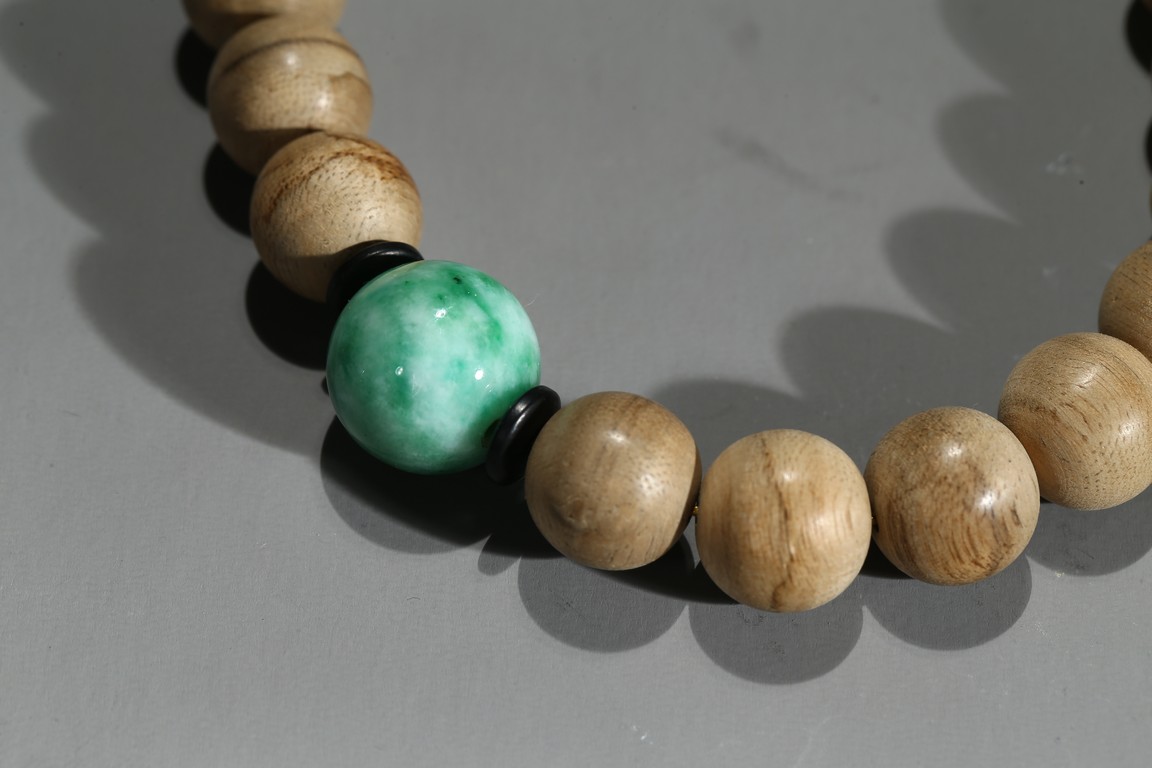 Consisting of 108 rounded natural aloeswood and jadeite beads, with characteristic aroma.