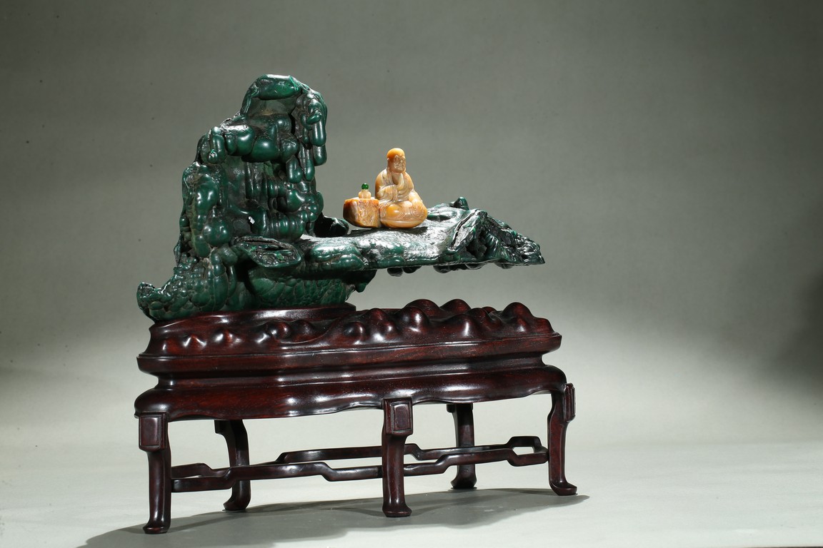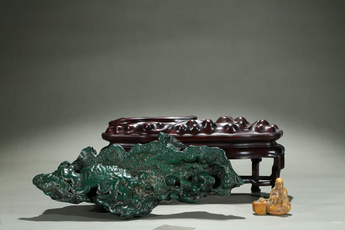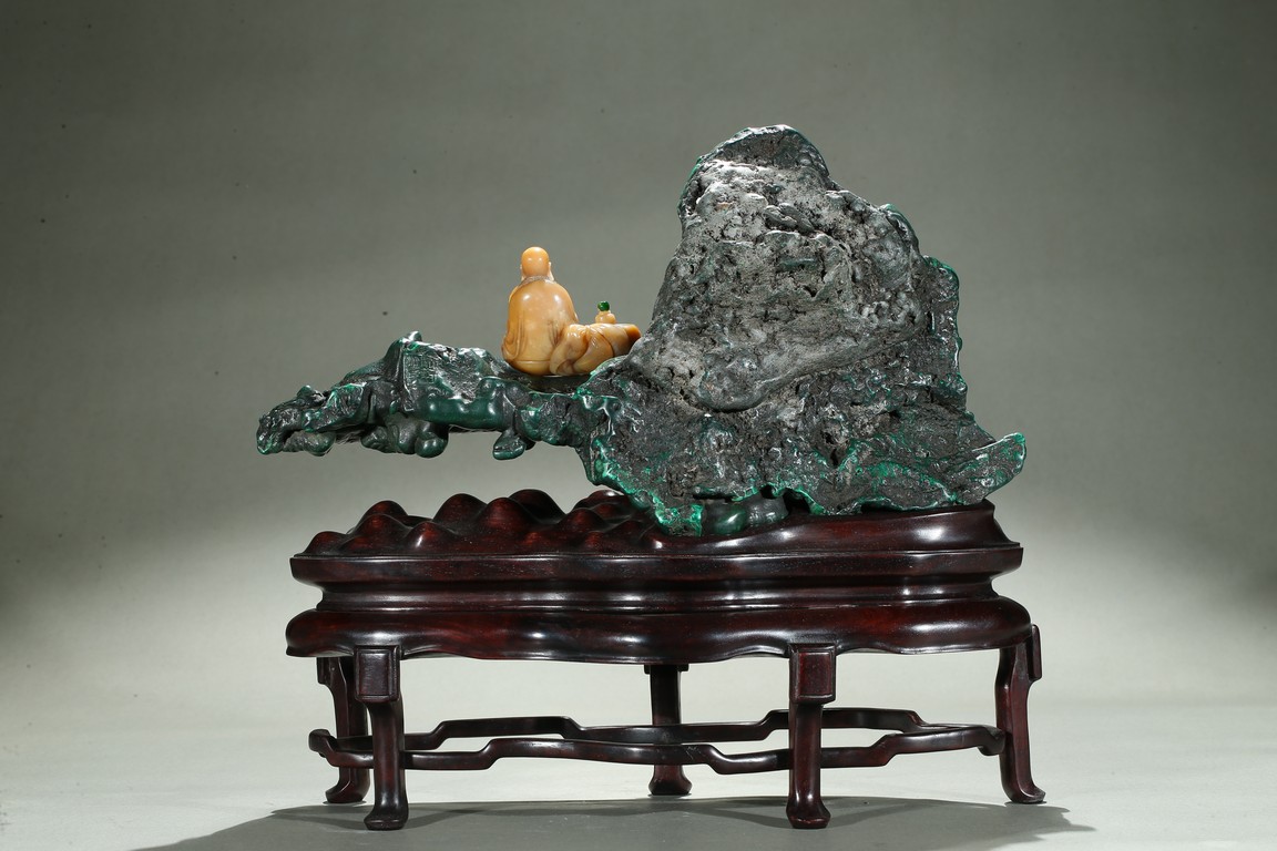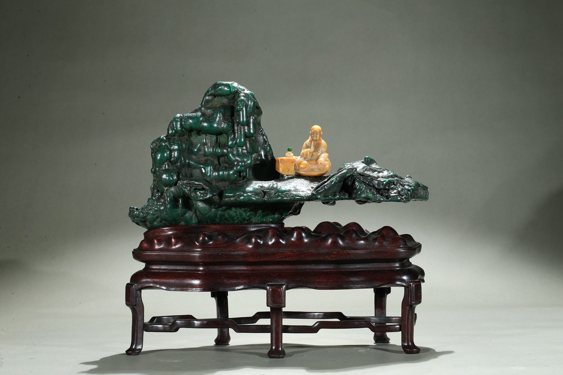 The malachite is modelled naturalistically with a horizontal overhang supporting a small shoushan soapstone carved arhat, all fitted on a hardwood stand. Qing Dynasty