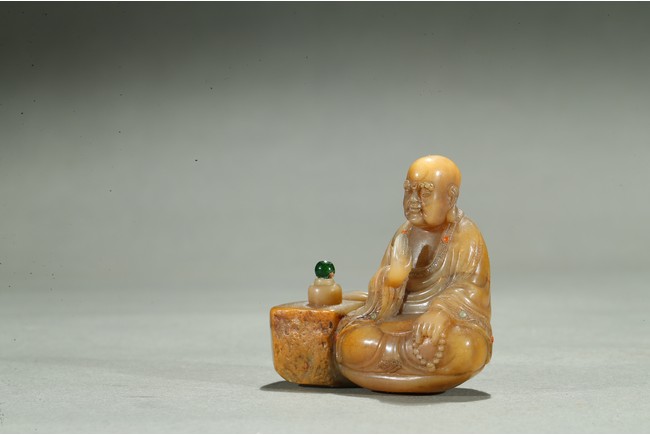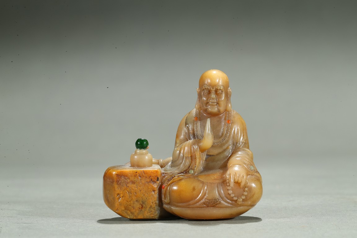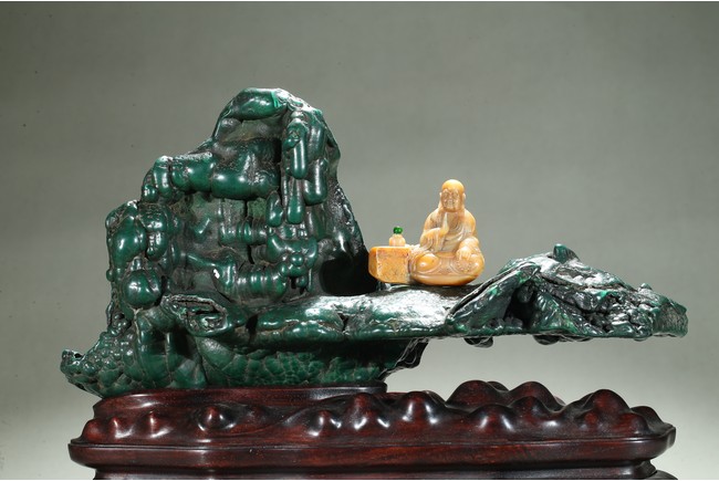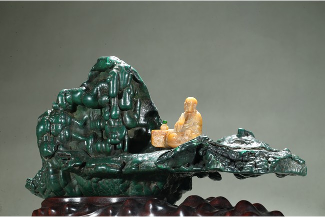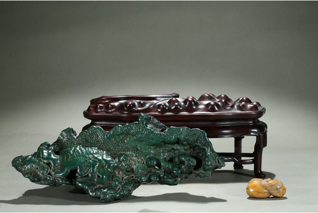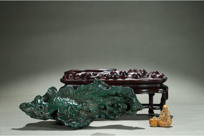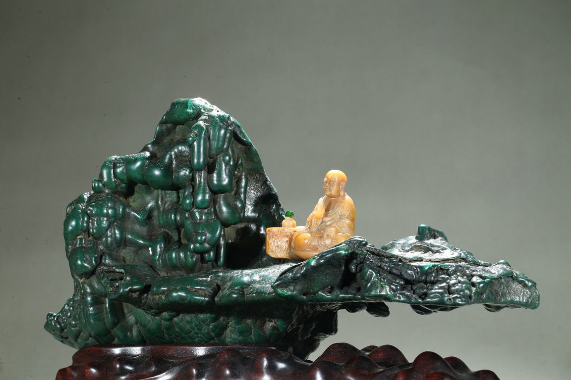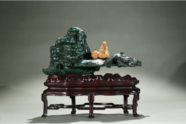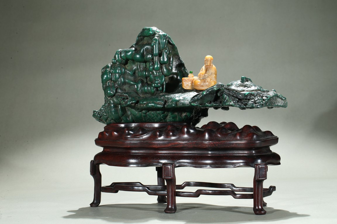 The malachite is modelled naturalistically with a horizontal overhang supporting a small shoushan soapstone carved arhat, all fitted on a hardwood stand. Qing Dynasty