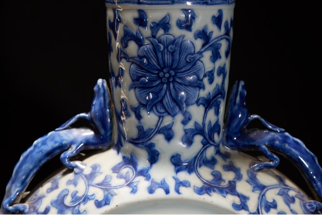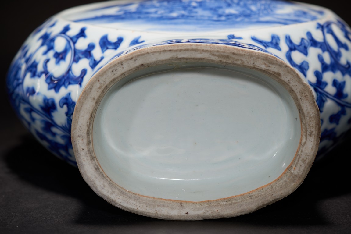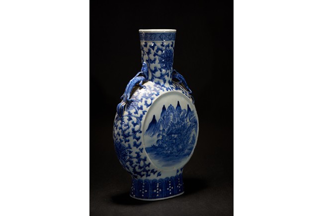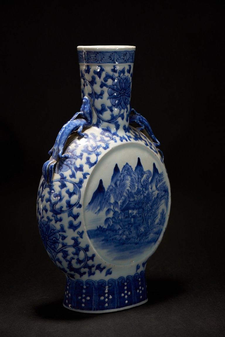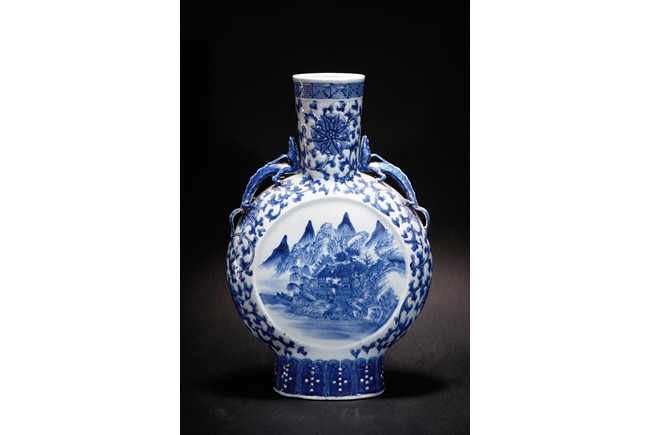 The vase is applied with twin dragon handles to the shoulder, painted to each side with circular panels of riverside and mountain landscape, surrounded by scrolling lotus foliage. Late Qing Dynasty period.