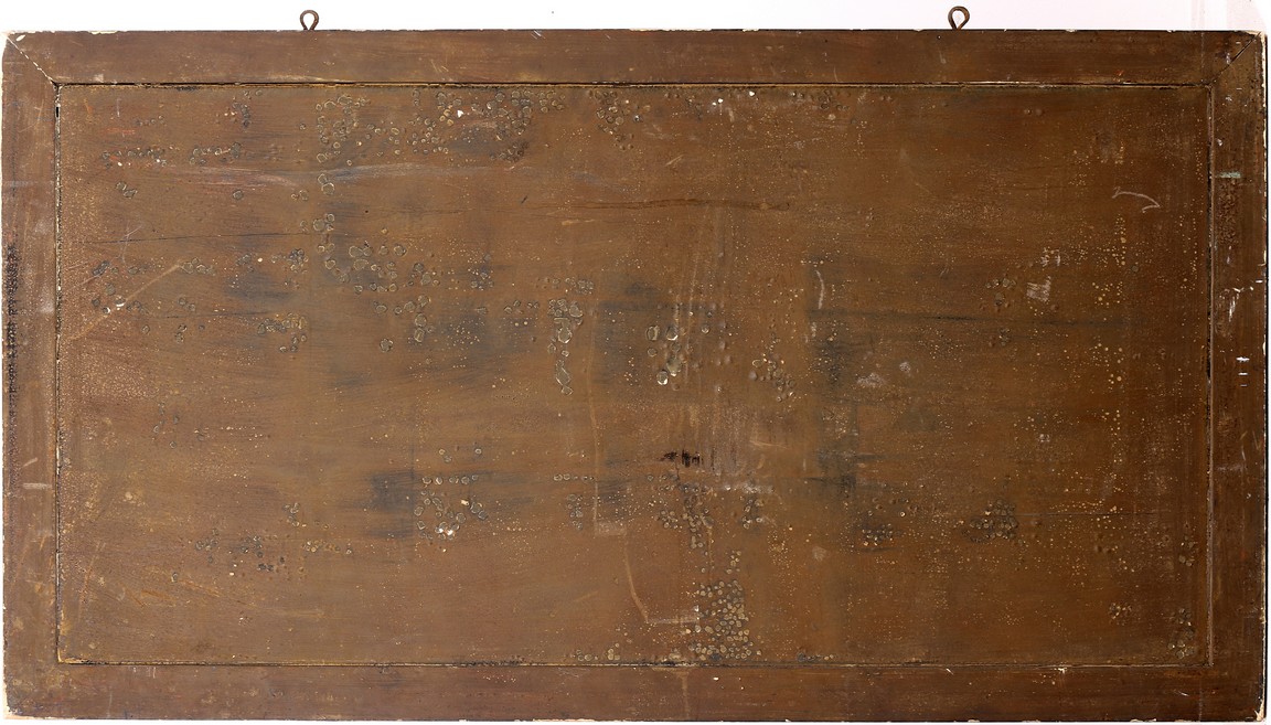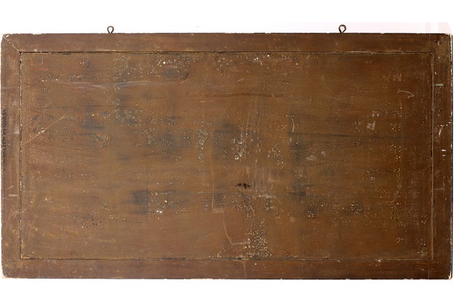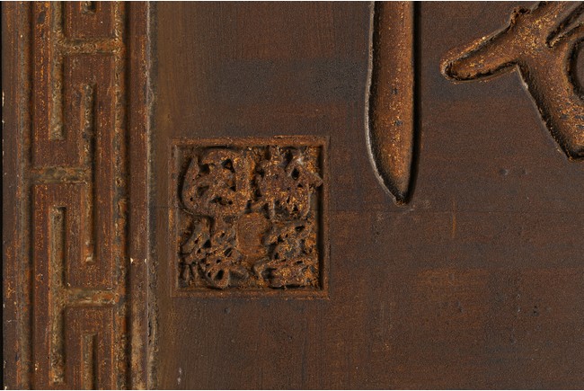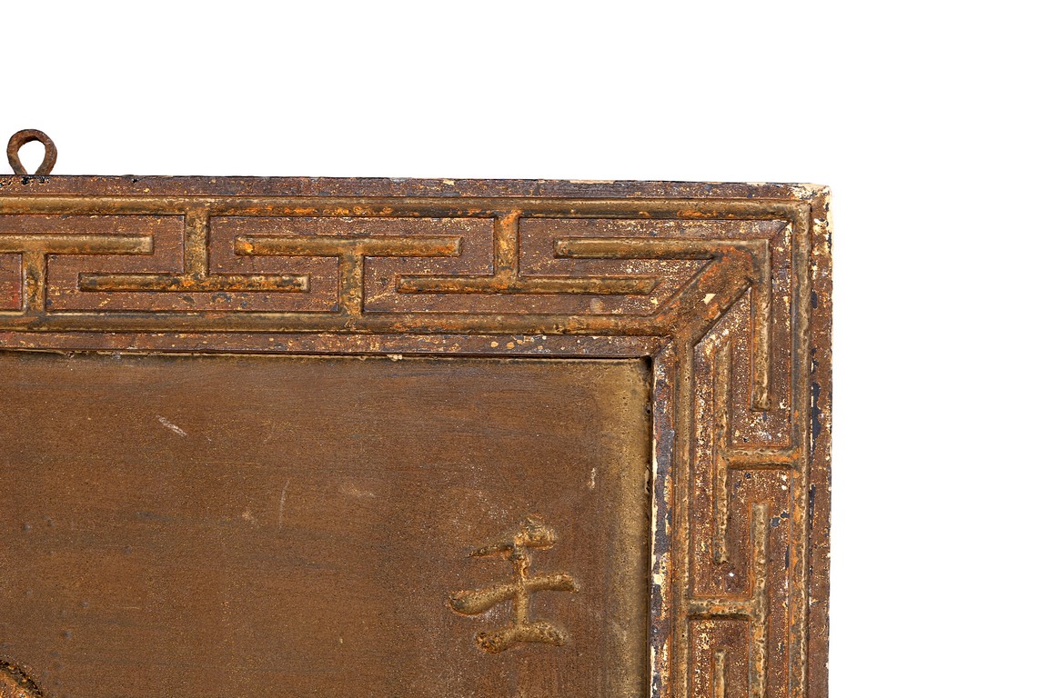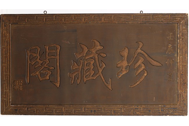 Of rectangle form, carved three large Chinese characters 'Zheng Cang Ge', inscribed on left side, impressed a seal mark on right side. The edges decorated Chinese traditional pattern band in relief.