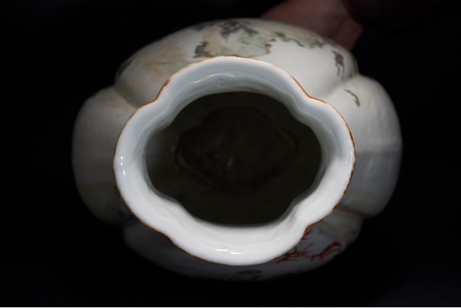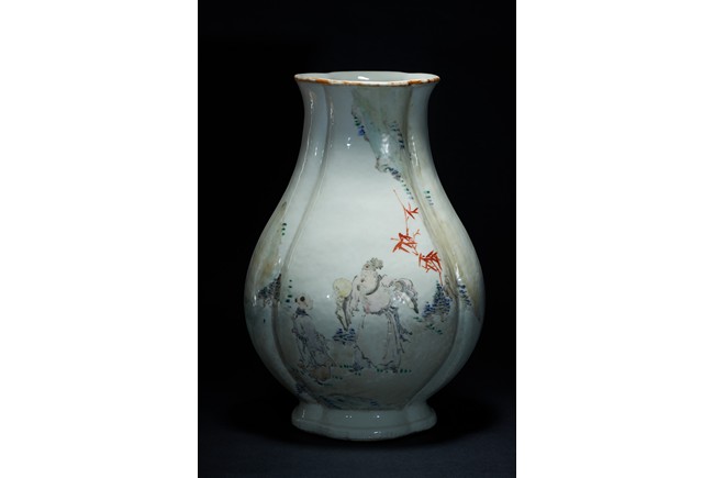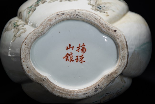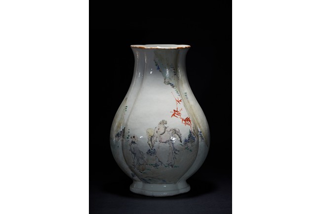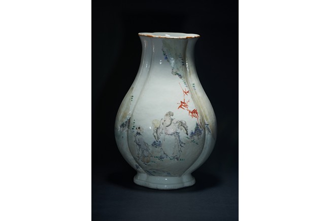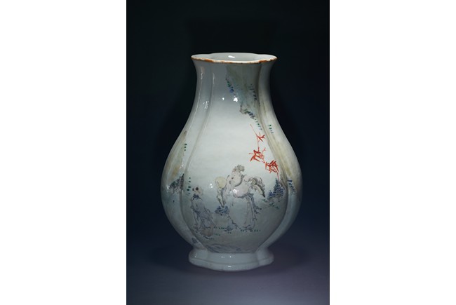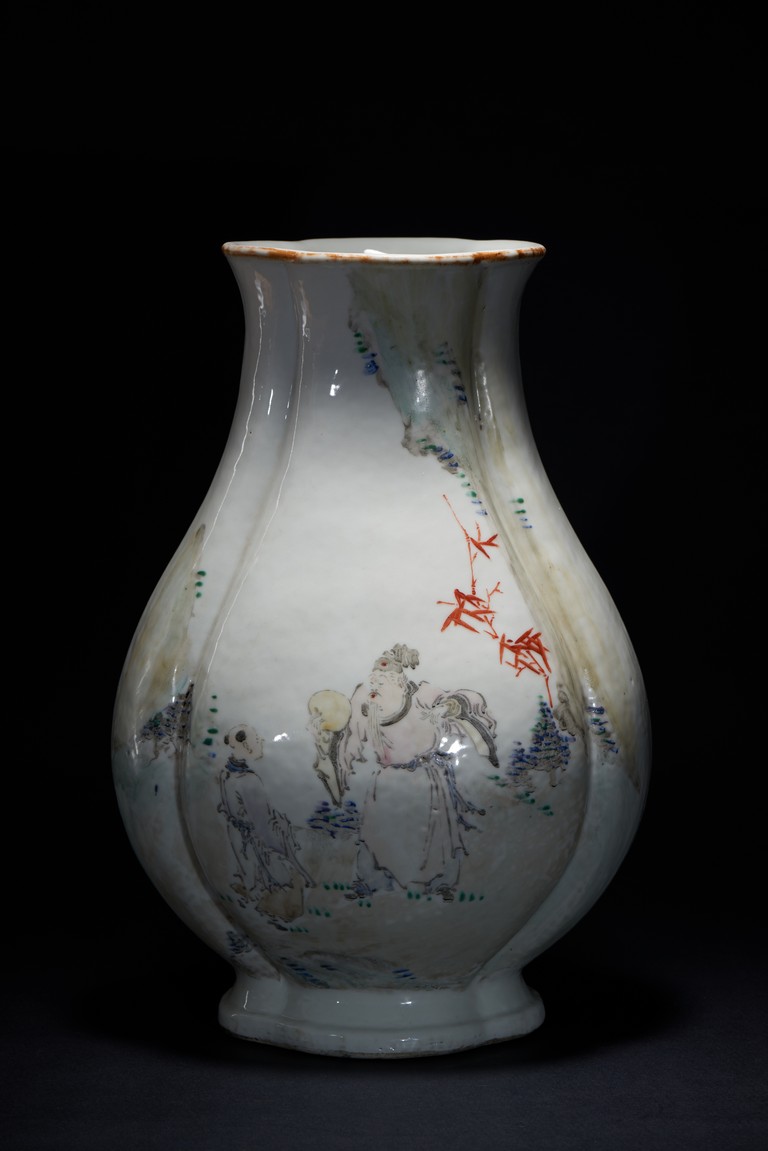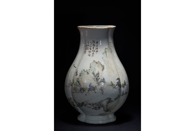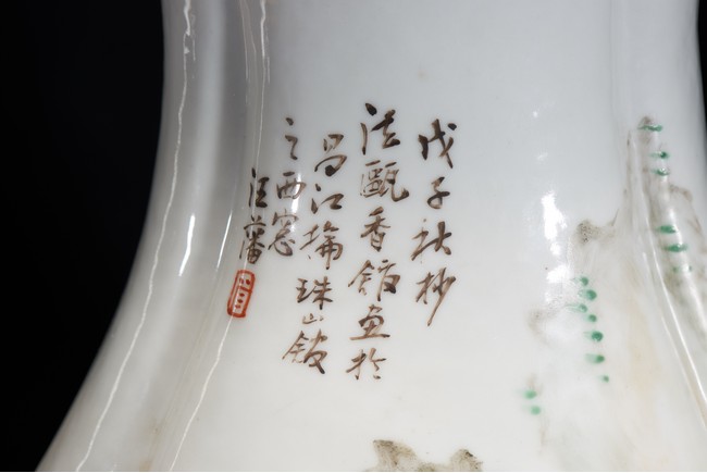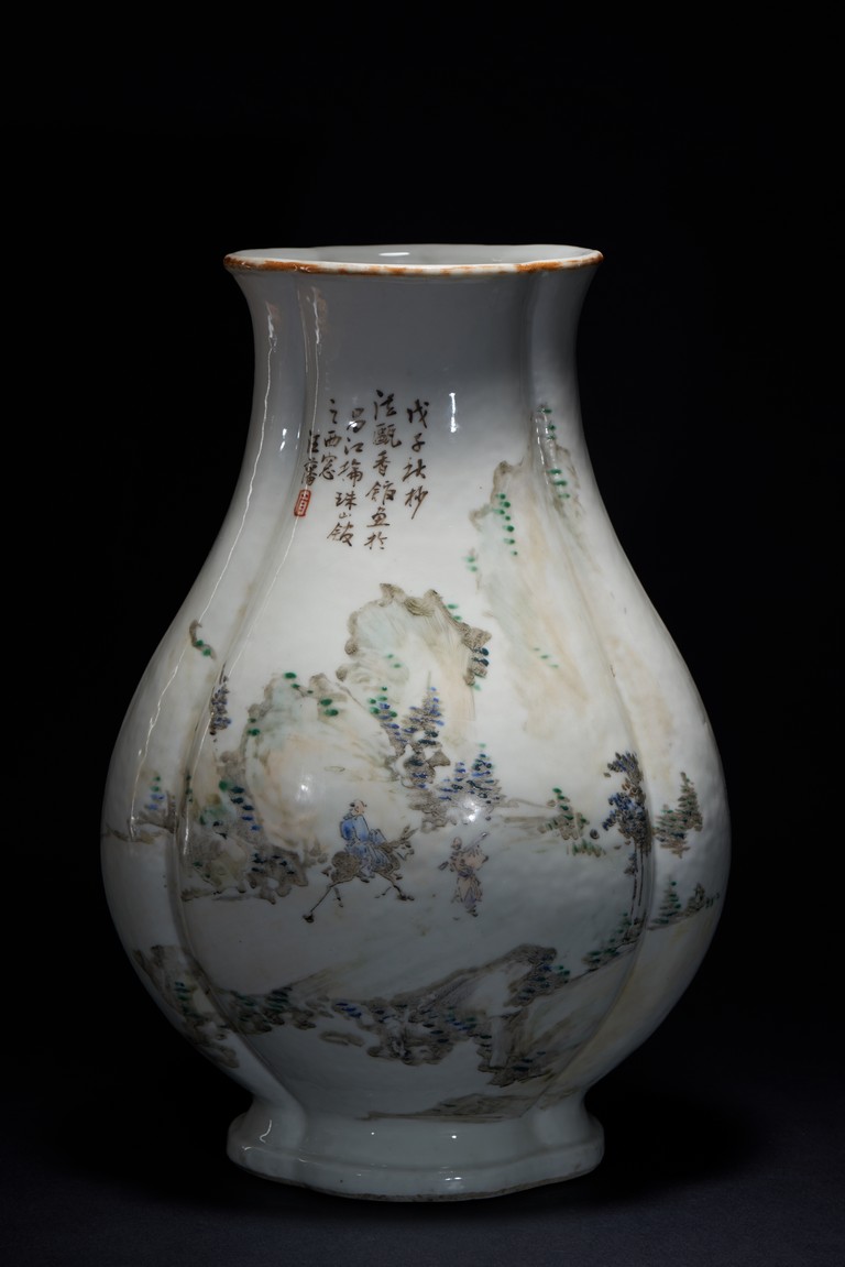 The four-sided body rising from a short spreading foot to a waisted neck, painted to the front face with a deep mountain landscape, and to the other with an elderly scholar and an attendant conversing within a mountainous setting, the neck bears inscription, signature Wang Fan, and a seal mark. The base with four character 'Lun Zhu Shan Guan'. Late Qing Dynasty period.