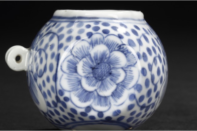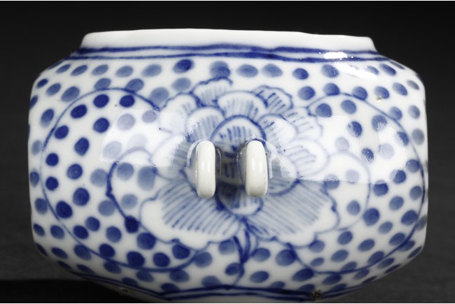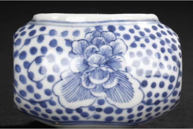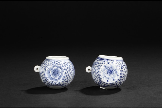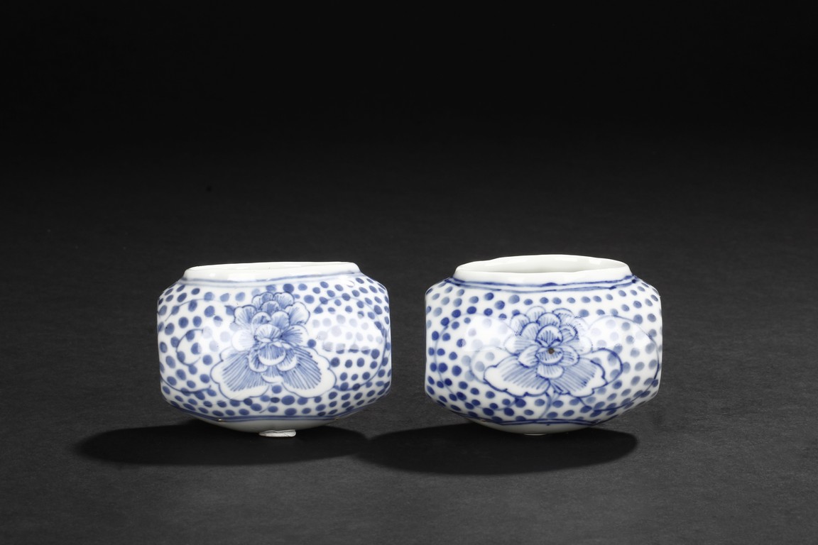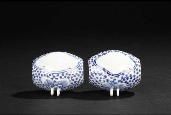 Each bird feeder is enamelled in blue and white with flowers reserved on blue dotted ground. Qing Dynasty period.