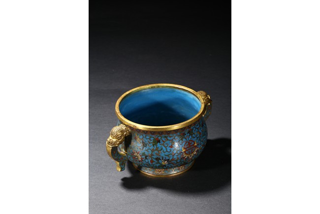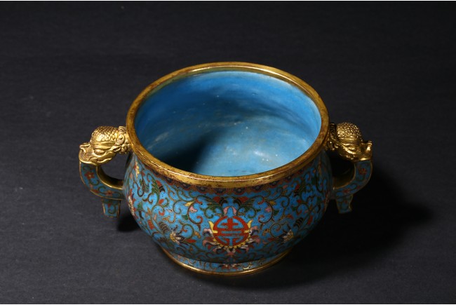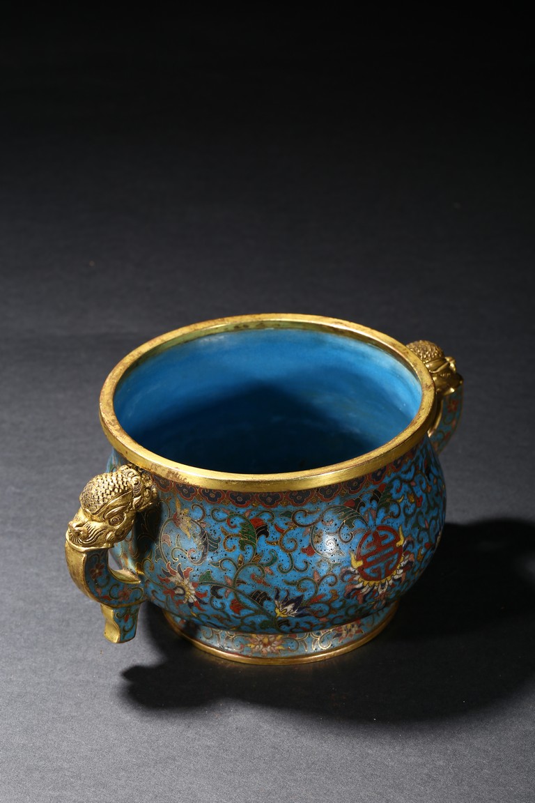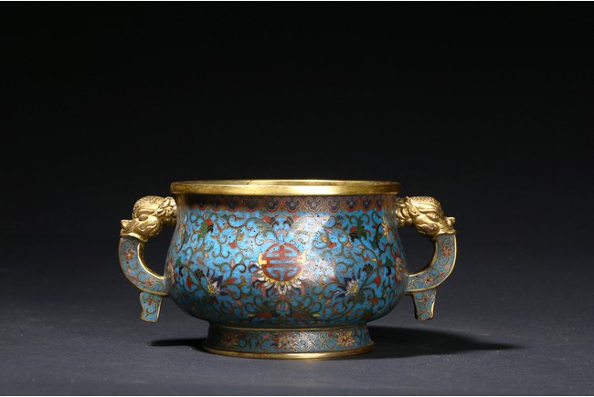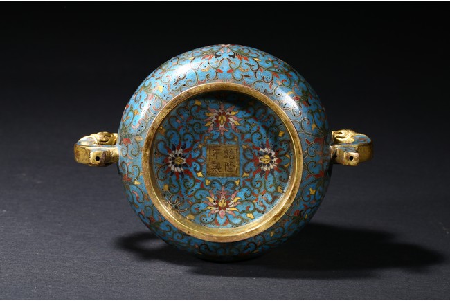The compressed globular body is decorated in vivid enamels with a central band of shou character and lotus foliate scrolls, all below a band of ruyi lappet, and flanked by twin loop handles emerging from elaborate gilt-bronze dragon masks, the base with four character Qianlong reign mark. Qing Dynasty period.