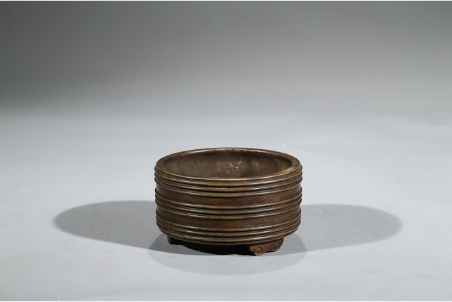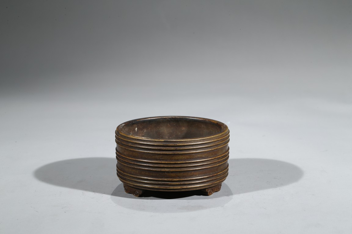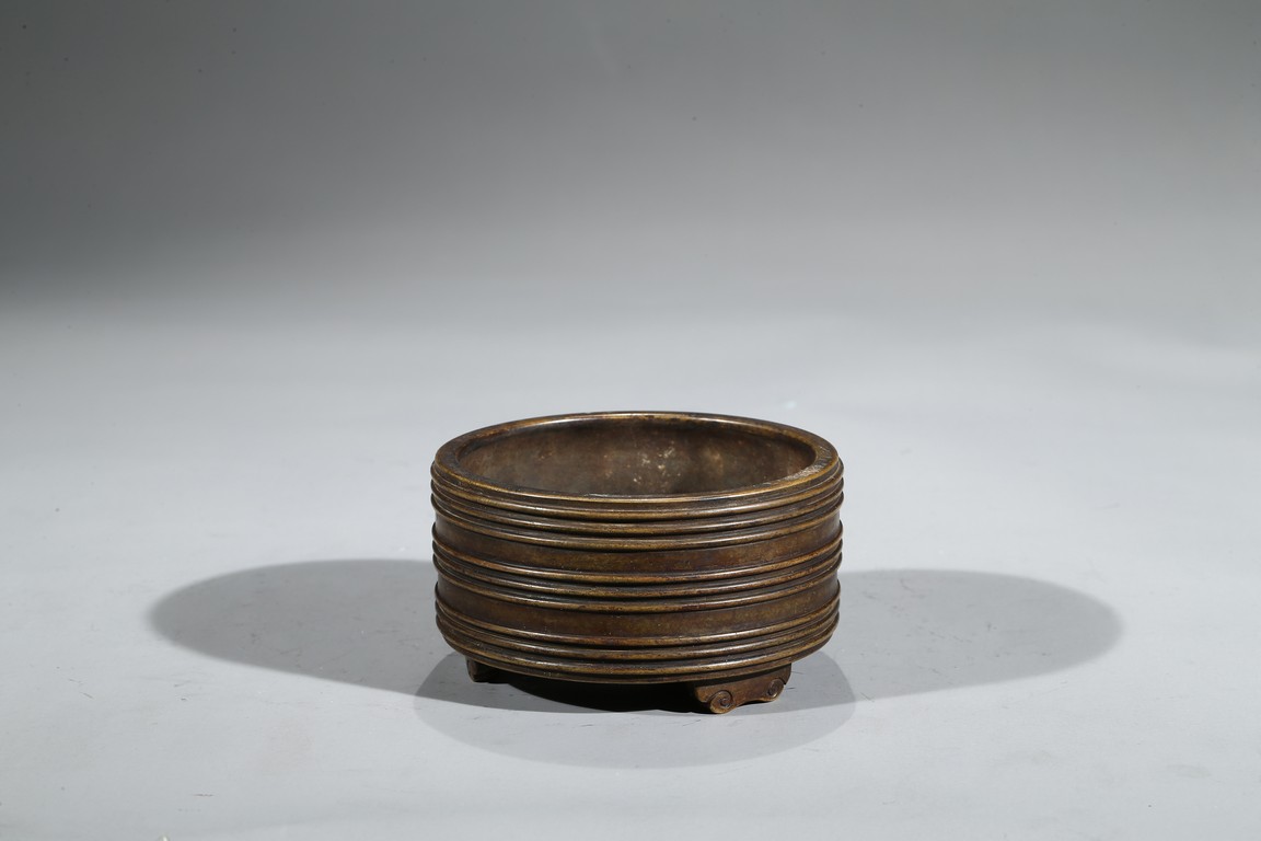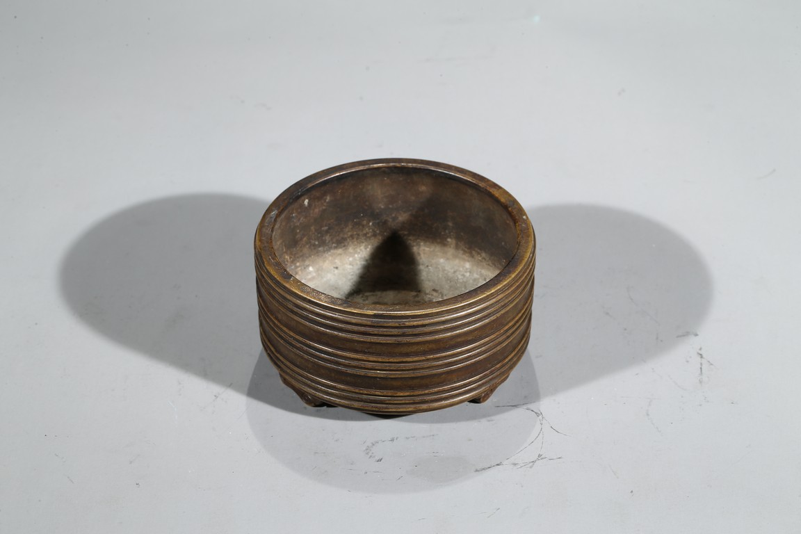 Of cylindrical form, the censer supported on three short feet, the body with nine raised concentric bands, the base with six character Xuande mark.