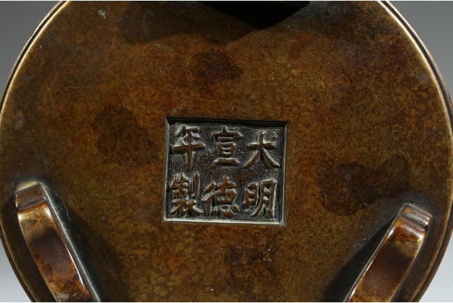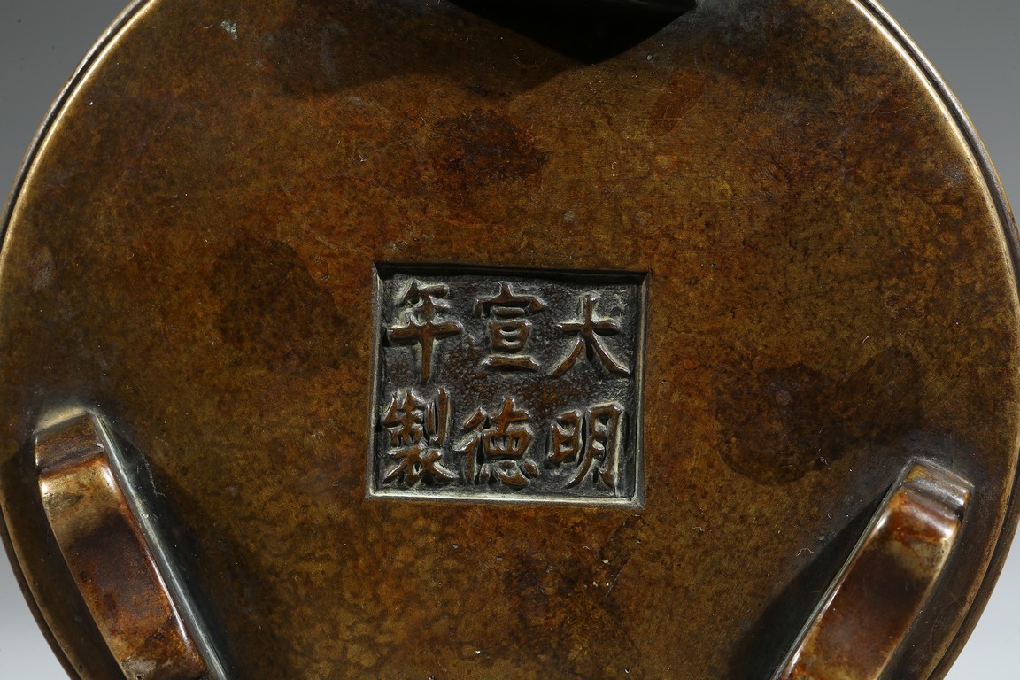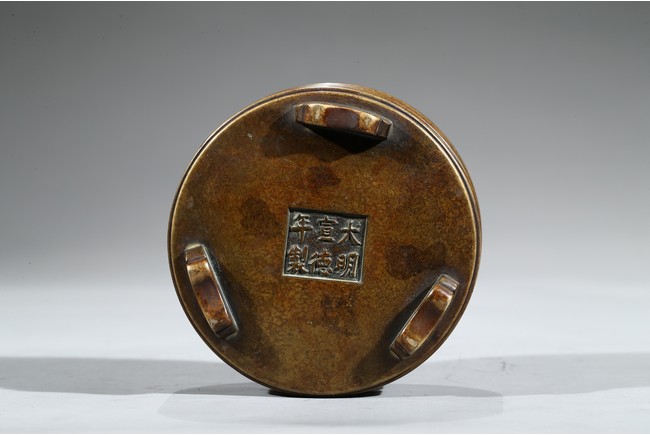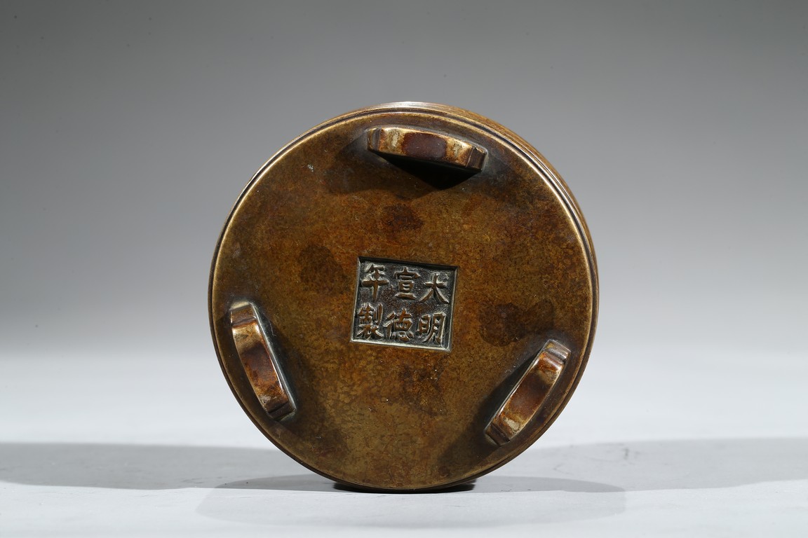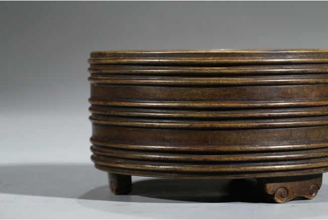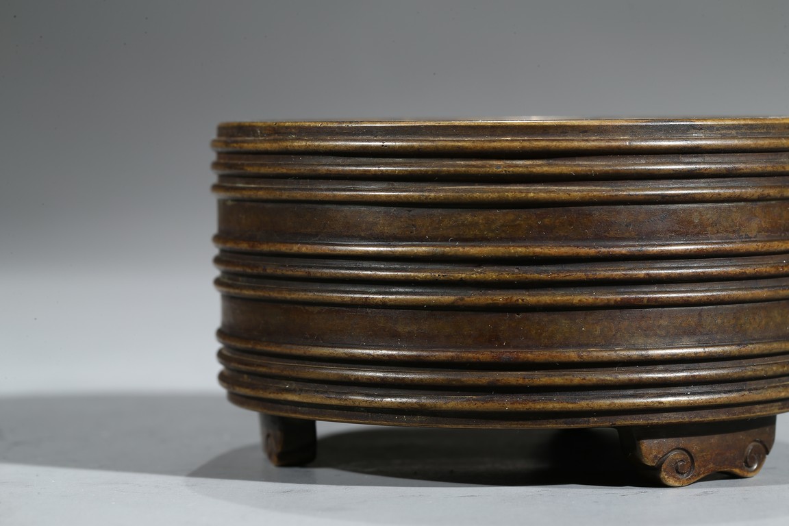 Of cylindrical form, the censer supported on three short feet, the body with nine raised concentric bands, the base with six character Xuande mark.