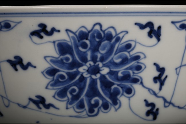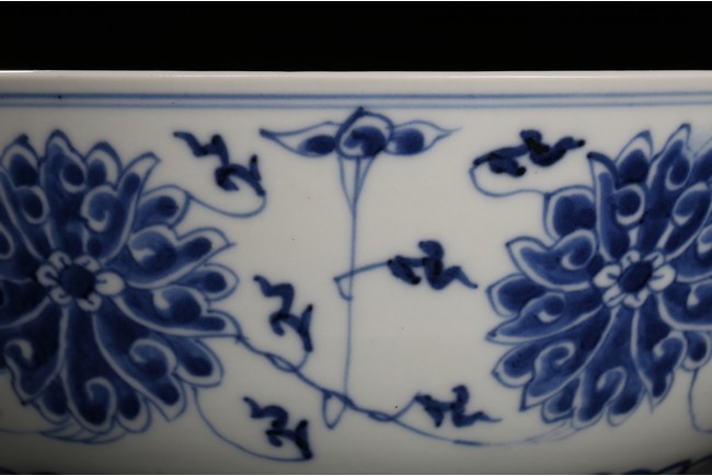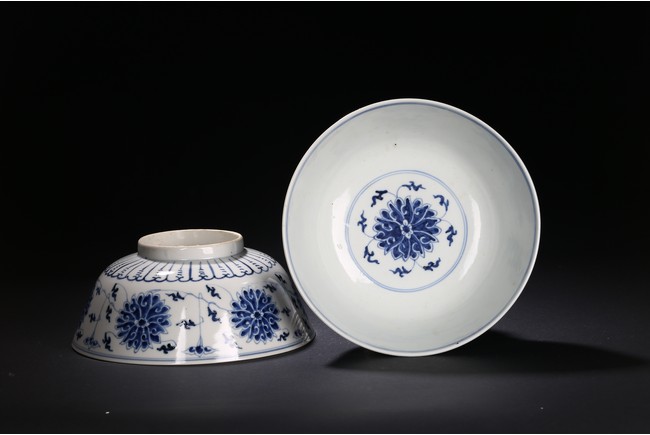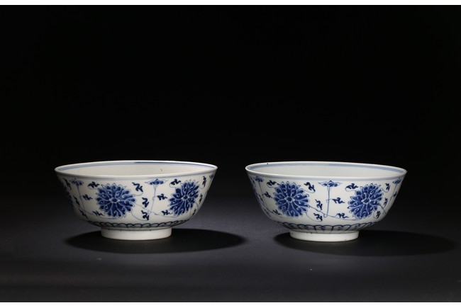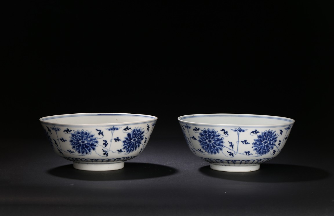 Each bowl is painted around the exterior with scrolling stylised foliage borne on lotus blooms.The interior is decorated with a matching central medallion. Late Qing Dynasty period.
