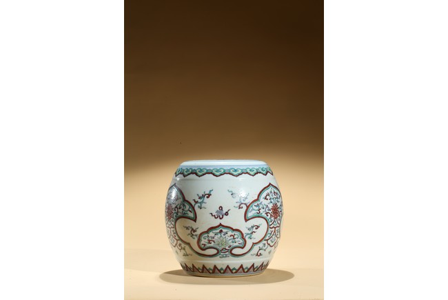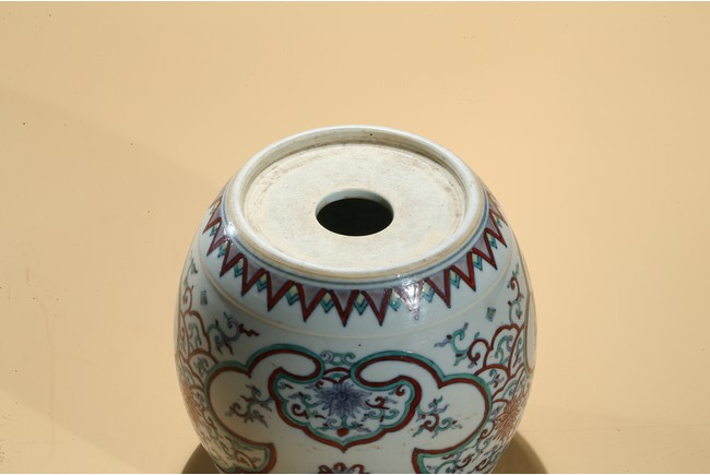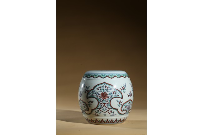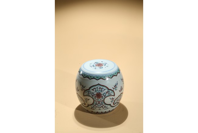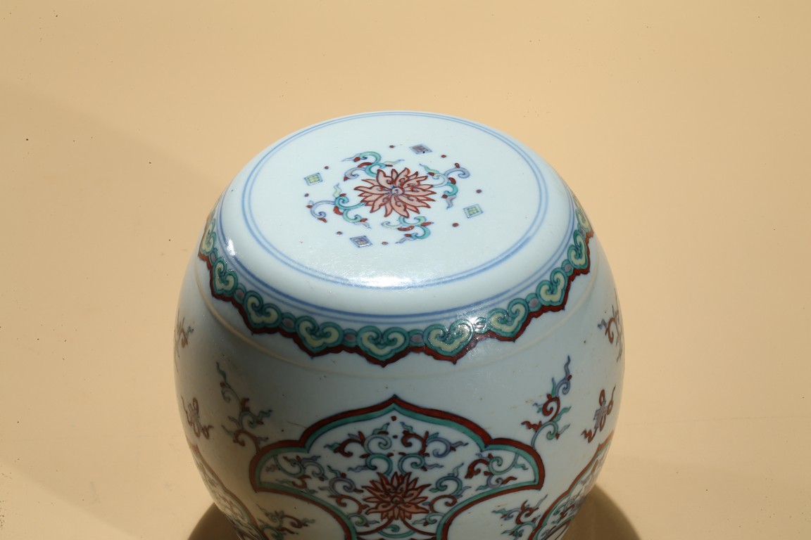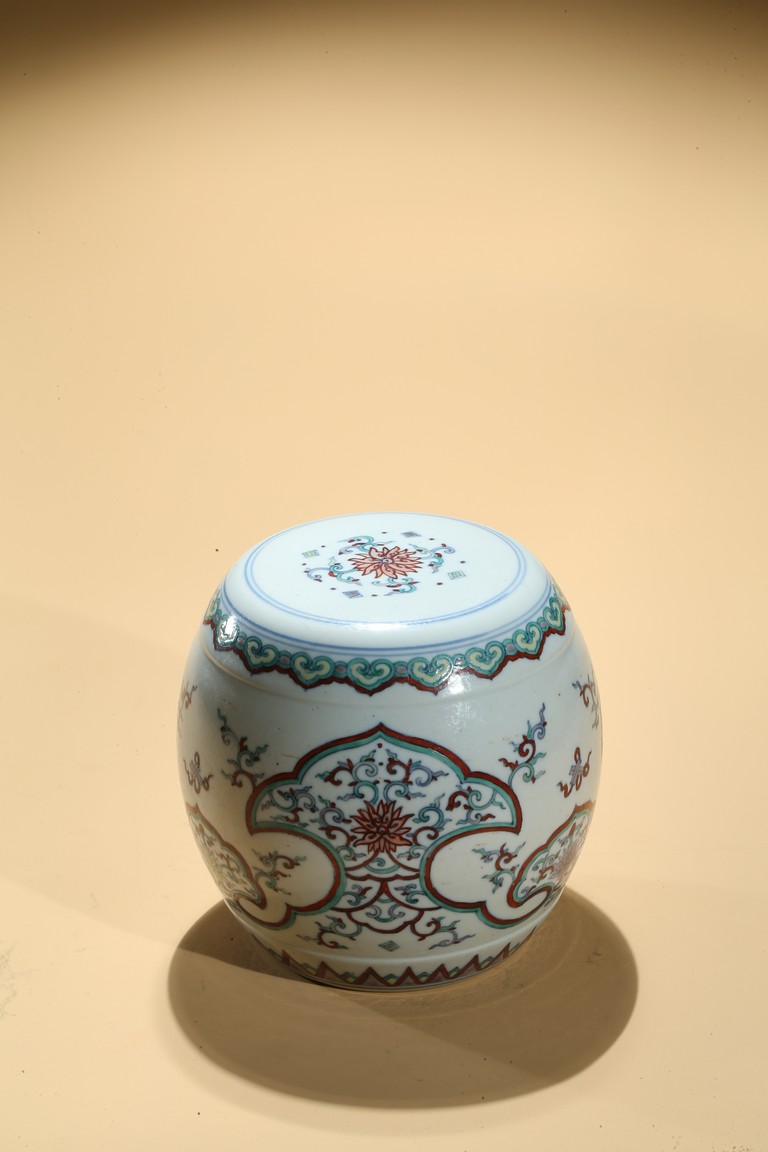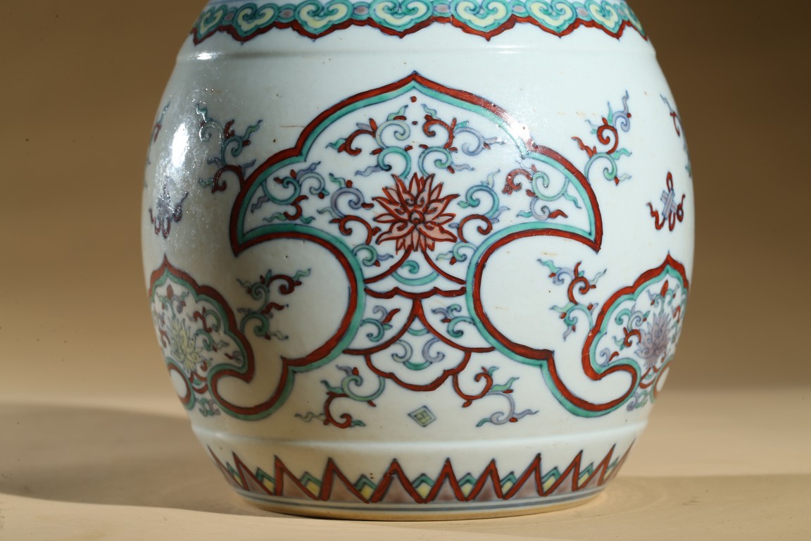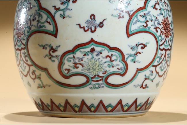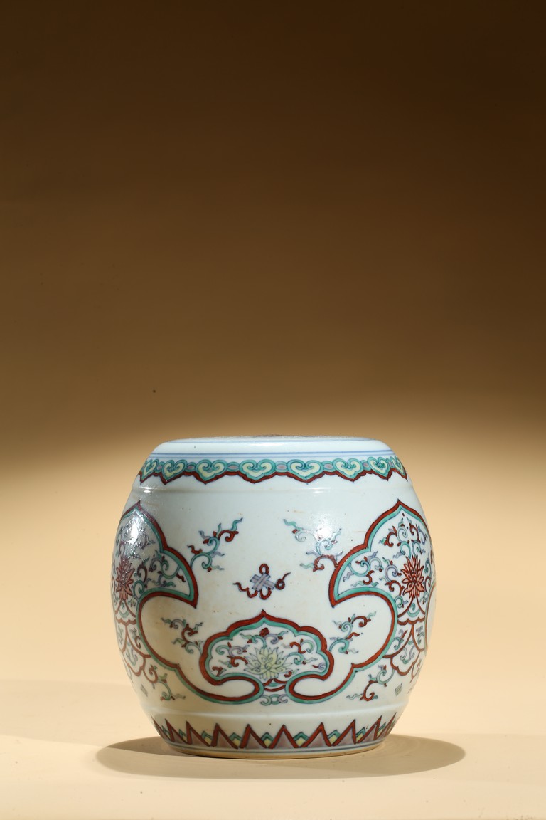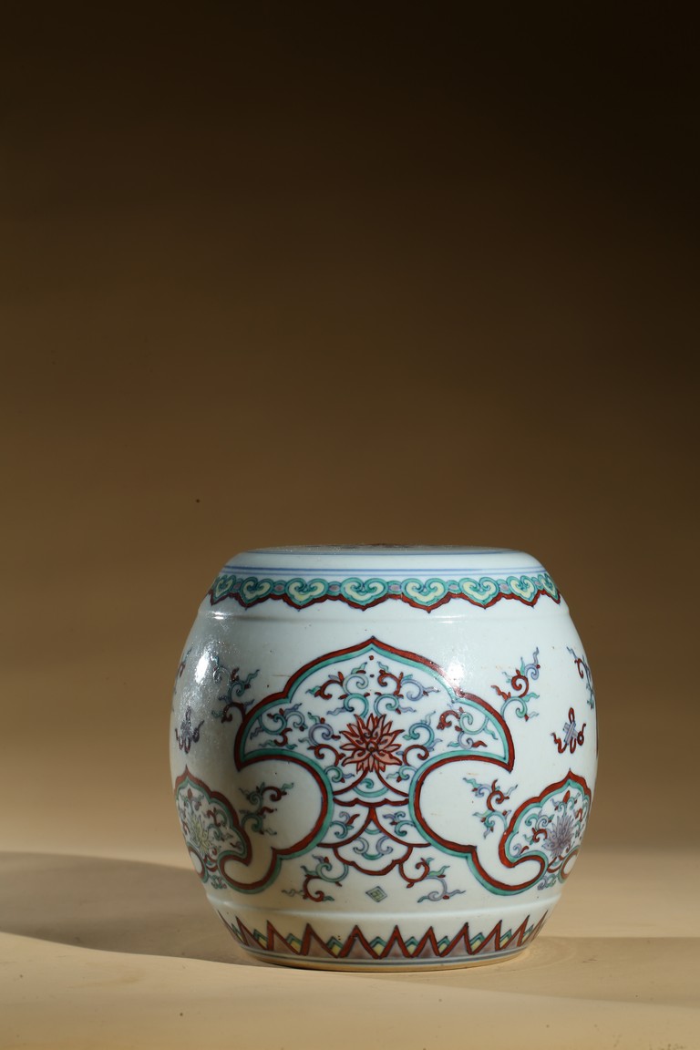 Vividly enamelled in red,green,yellow and aubergine,the gently curving sides decorated with four foliate cartouches each enclosing dense scrolling foliage bearing a lotus flower head,separated by a smaller lotus spray above clusters of billowing clouds,all beneath a continuous band of ruyi heads,the top similarly decorated with a floral cartouche. Qing Dynasty period.
