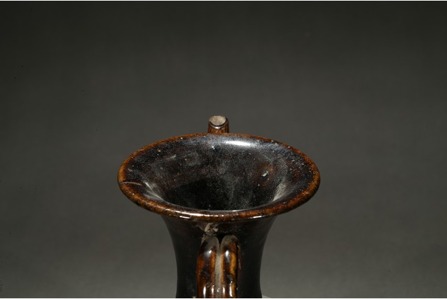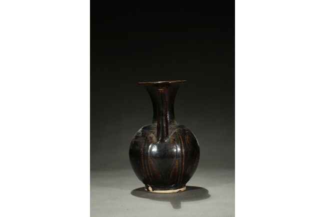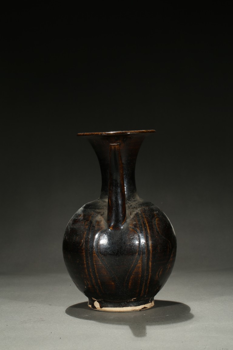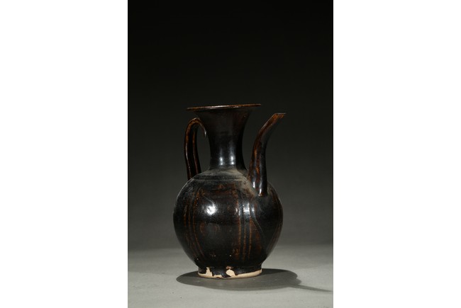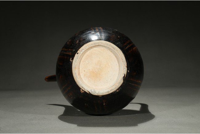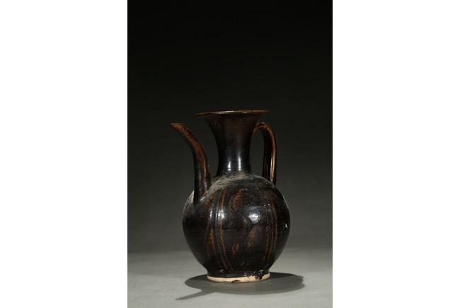 The globular-shaped body applied with a loop handle and serpentine spout,overall painted in dark brown glaze with pattern. Ming Dynasty period.