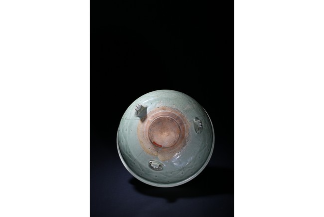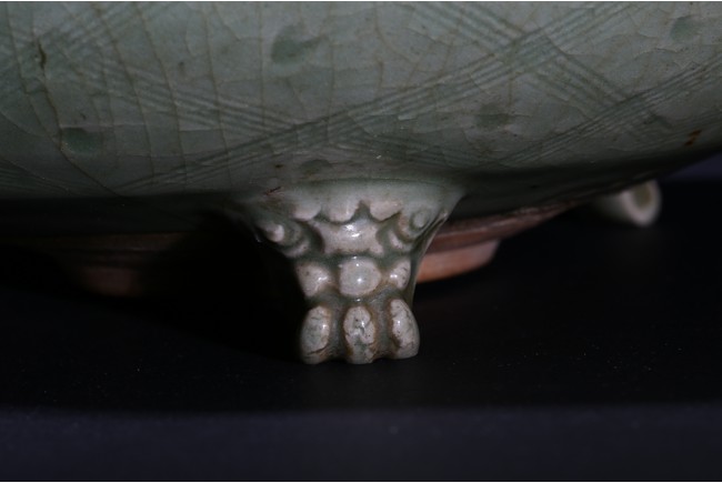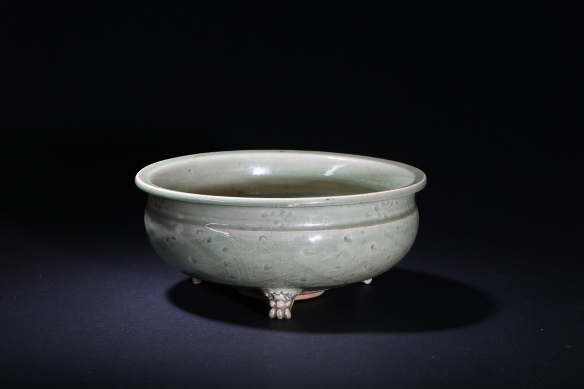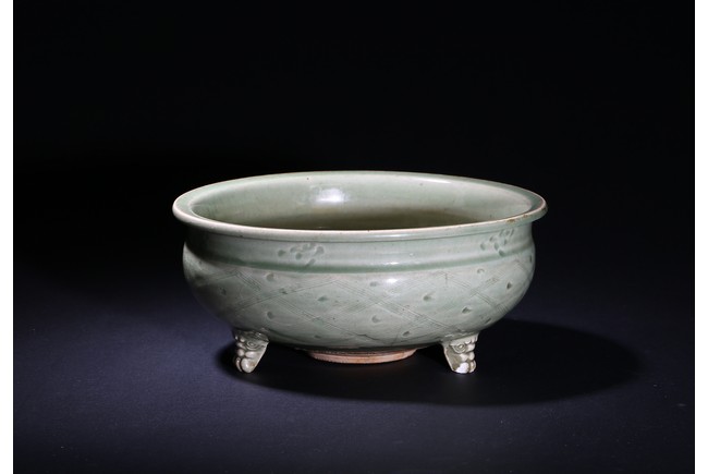 Supported on three beast-form feet, body moulded with repetitive geometric pattern, base unglazed. Ming Dynasty period.