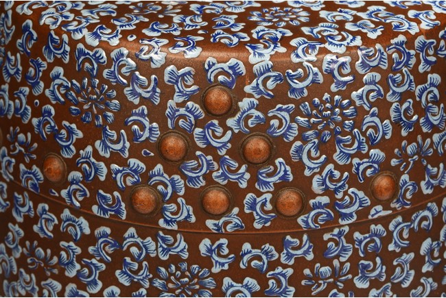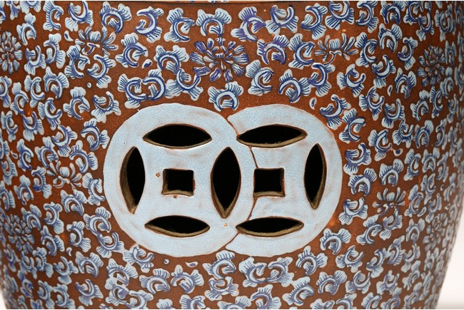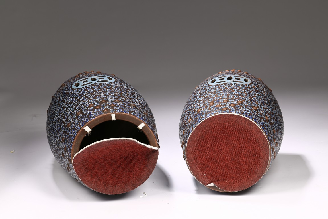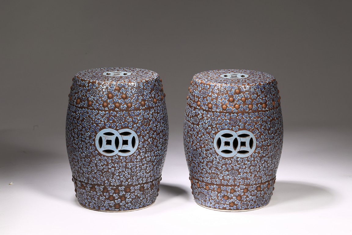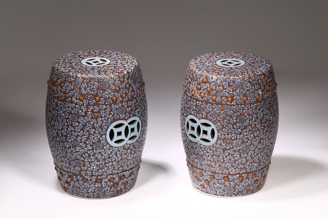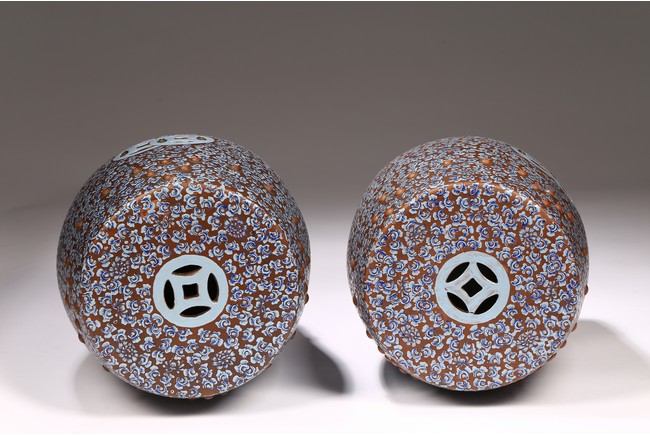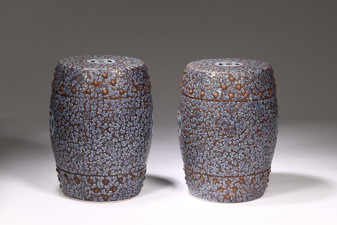 Each of barrel form, painted with a pair of overlapped coin medallions, all reserved on painted dense leafy lotus ground. Republic period.