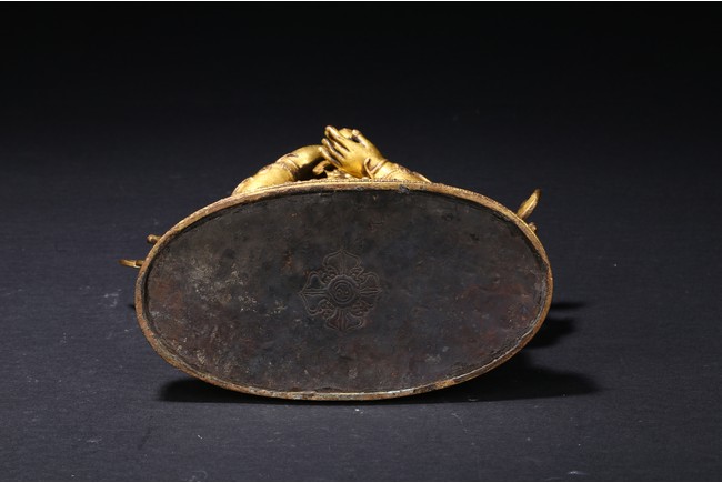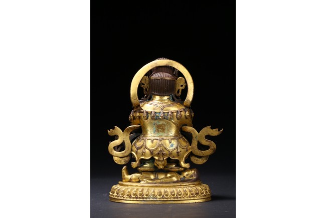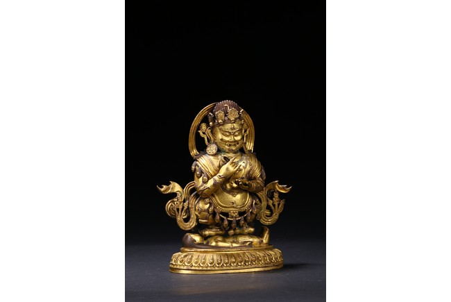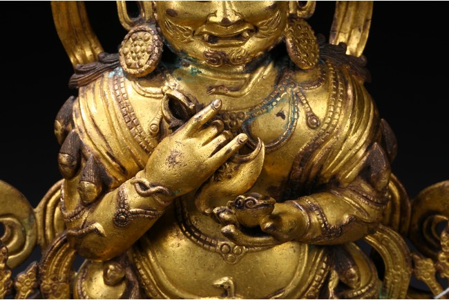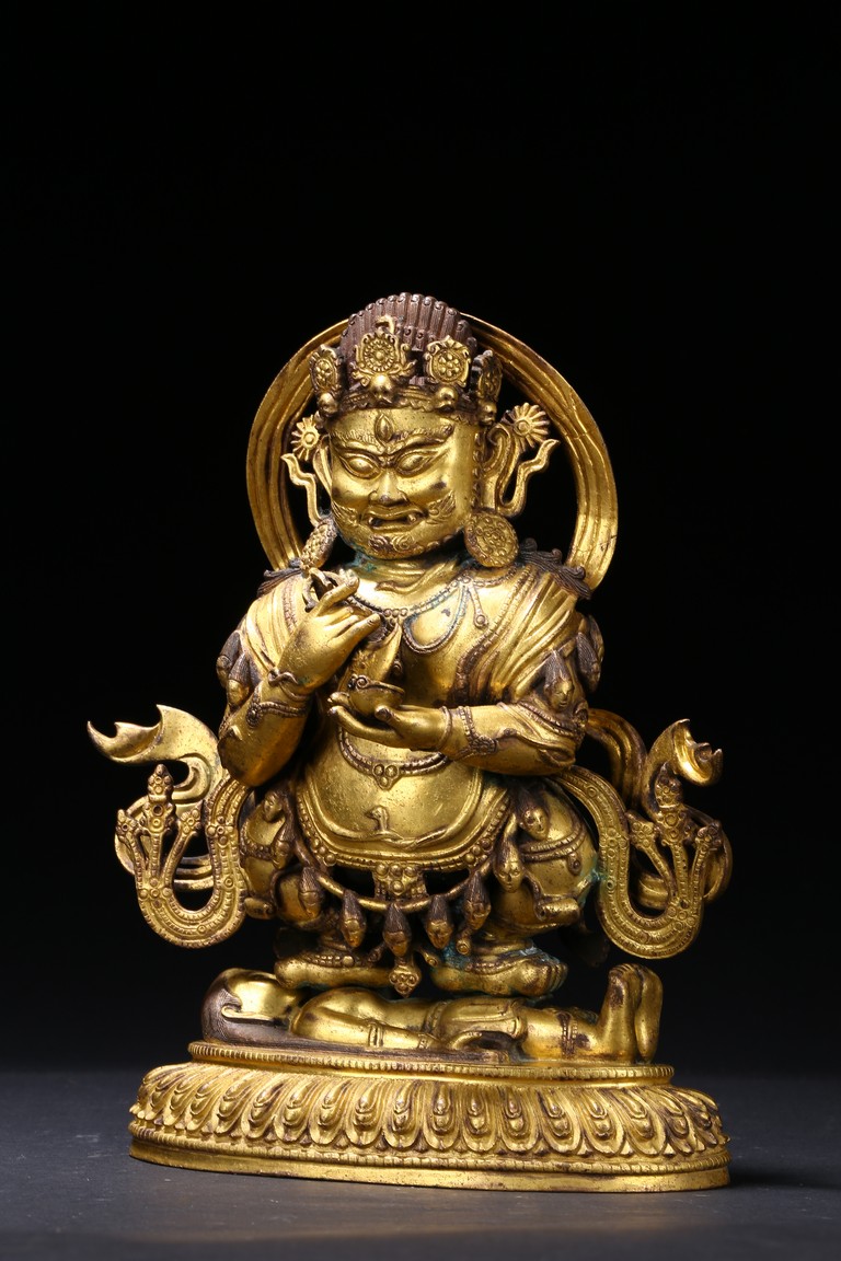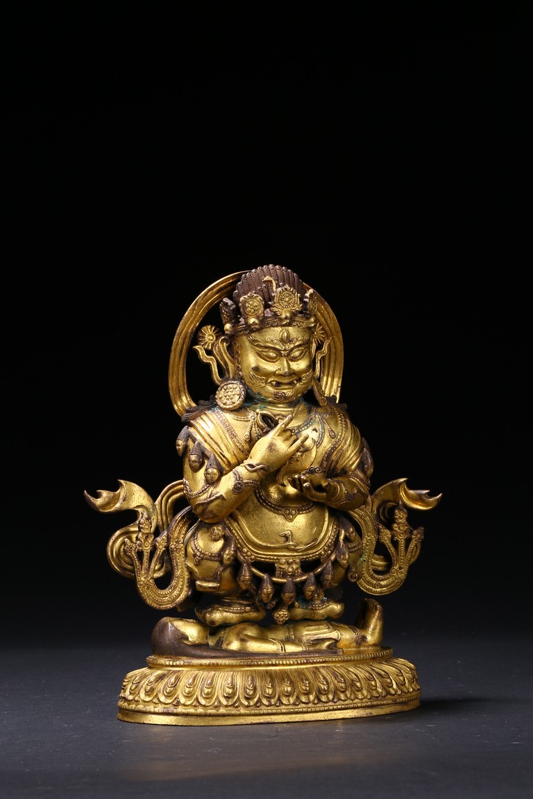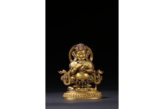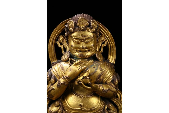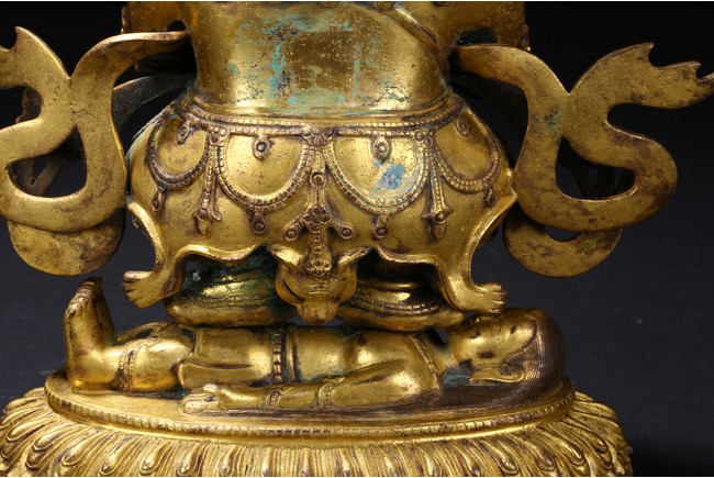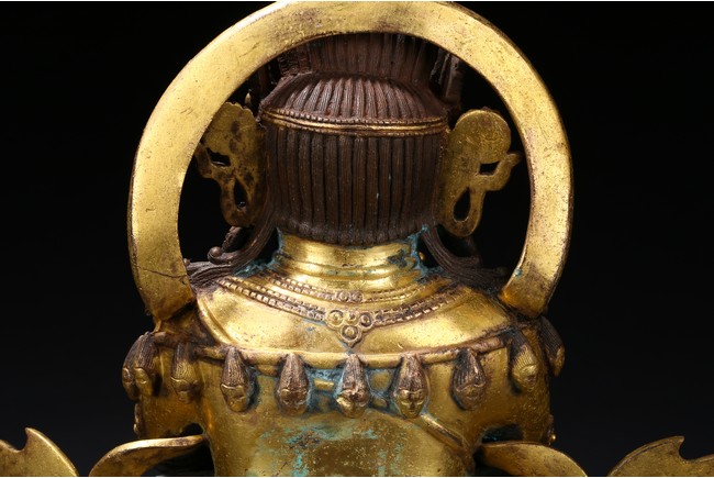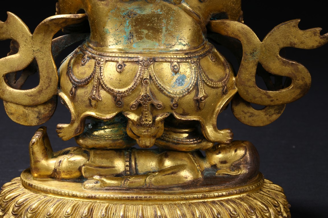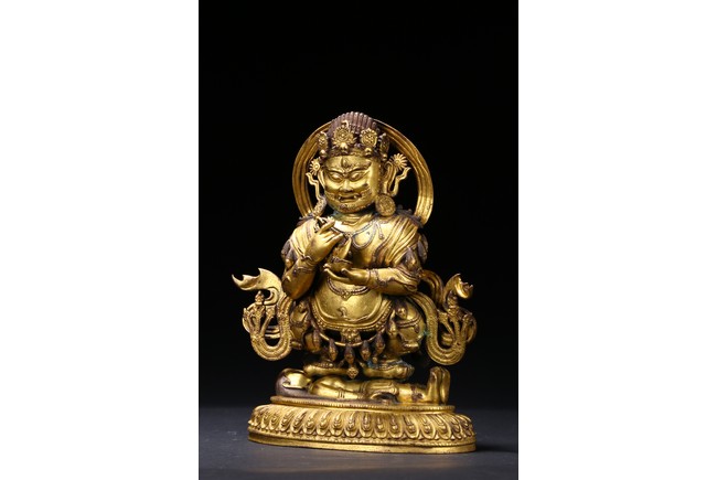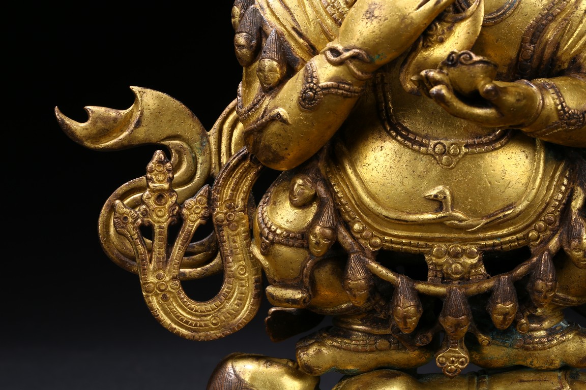 Seated on a crouching human figure, wearing a tiger skin around his waist and a billowing sash around his shoulders, adorned with multiple necklaces, a snake and a garland of severed heads, holding a chopper in his right hand and a skull cup in his left, the face with three bulging eyes and mouth opened in a ferocious expression, the flaming polychromed hair crowned with a skull tiara.18th century.