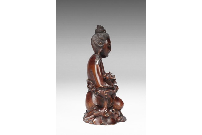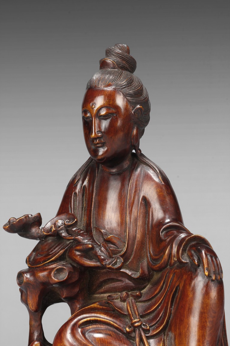 The Guanyin figure is shown seated at ease in peaceful manner. Her left hand rests on left bent knee and right hand holds an Lingzhi ruyi scepter with elbow resting on rock. Wearing an loose and voluminous robe,her face is depicted with an benevolent downcast eyes and her hair is tied in a tall chignon. Qing Dynasty Period.