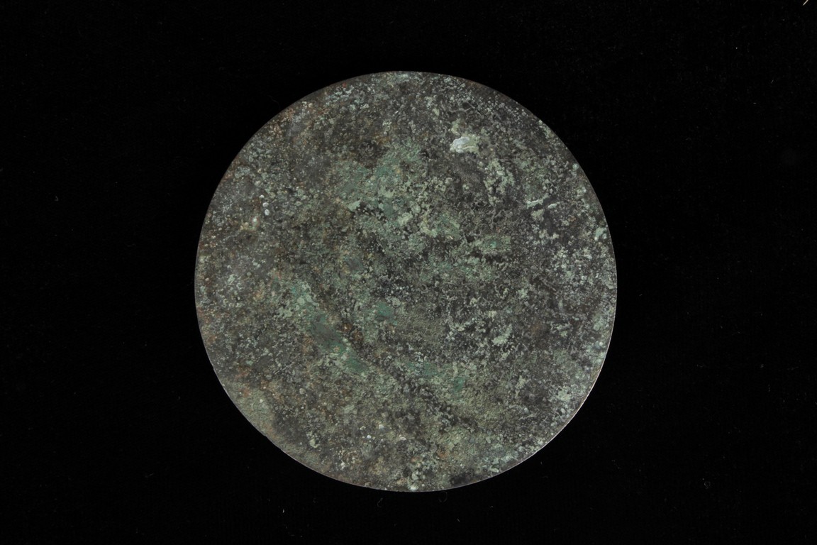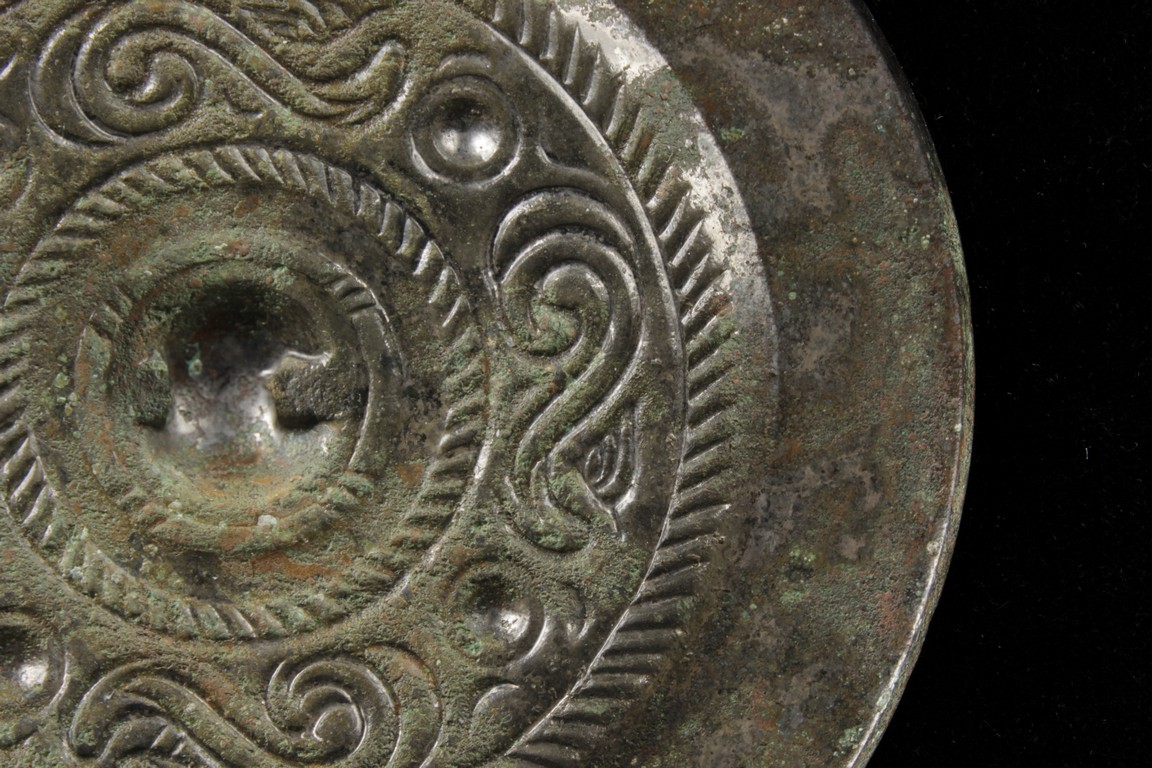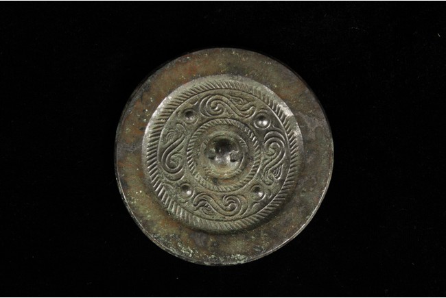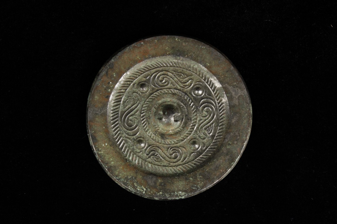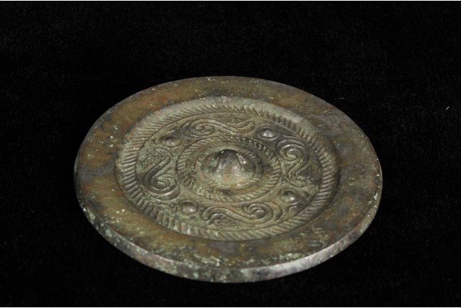 The center cast with a pierced round knob, surrounded by alternating mythical dragon and round dot patterns. Han Dynasty period.