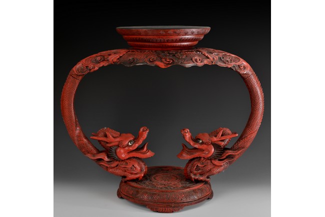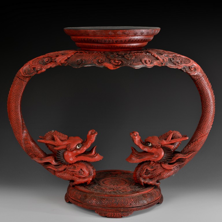A wood carved stand with twin dragons and overall covered with red lacquer. The two dragons have the tail on top, forming support for the top leiwen covered stand, and the heads confronting, with open eyes and mouths, the claws are attached to the bottom base, which is carved with intricate patterns. Qing Dynasty period.
