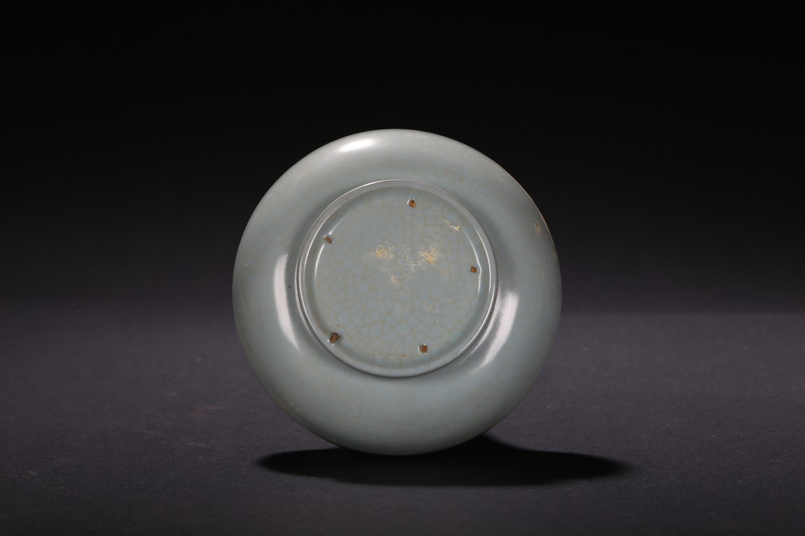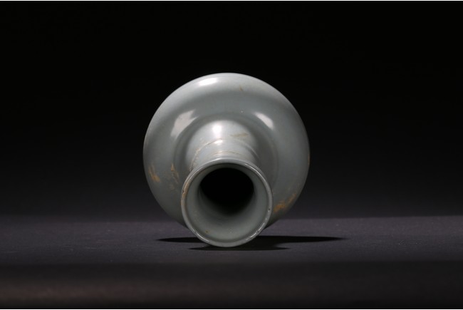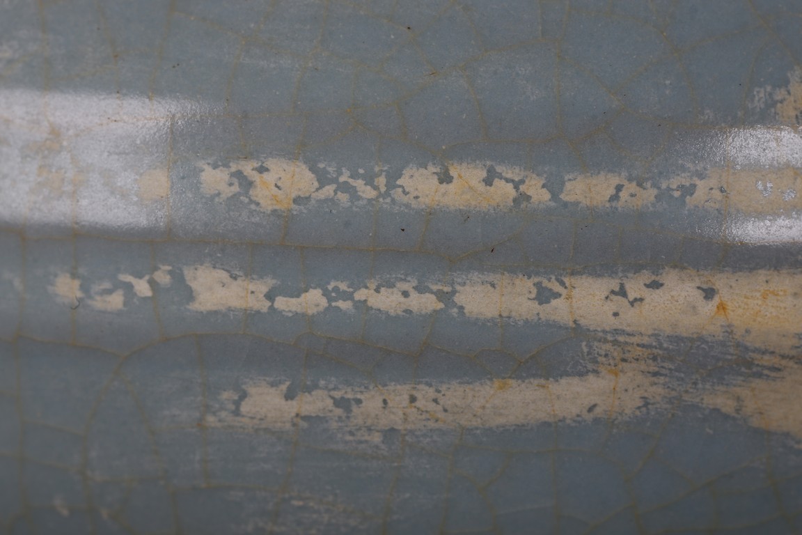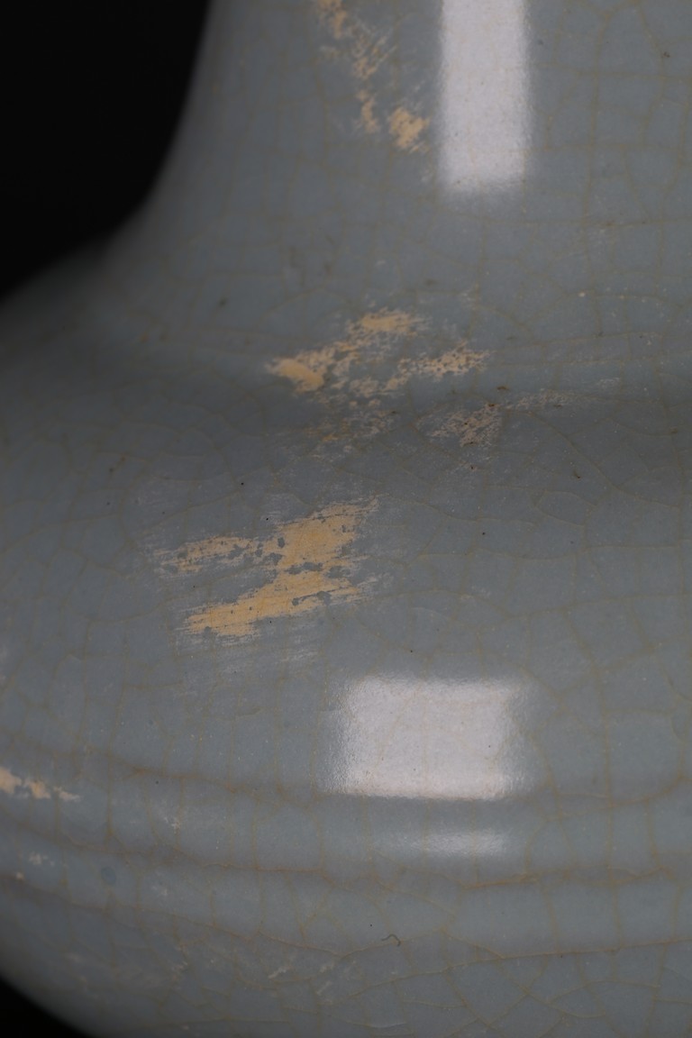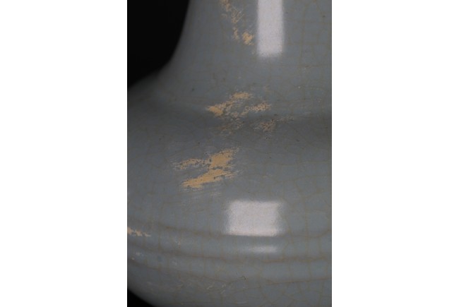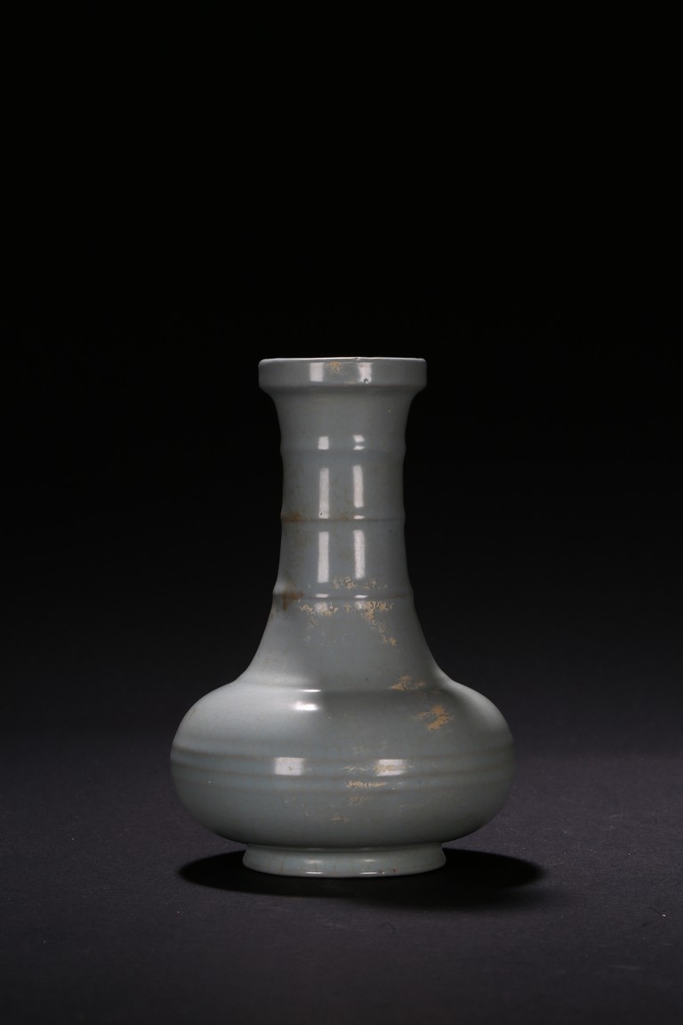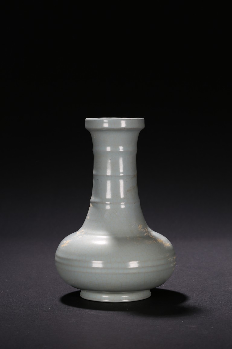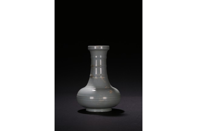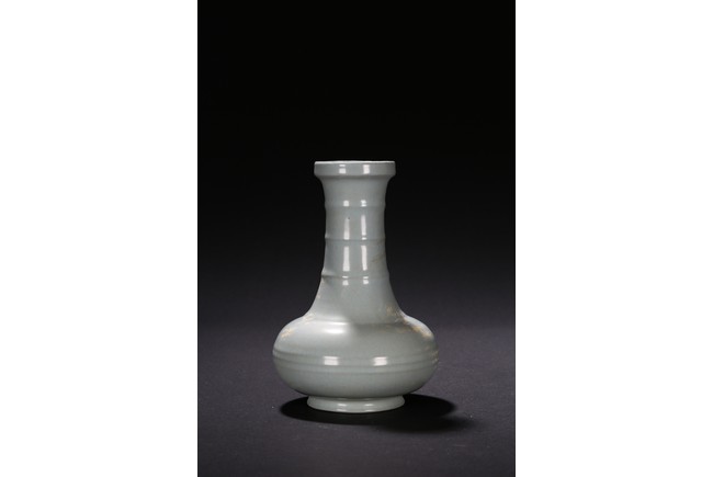 Of compressed globular form body and raised to long neck with protruding encircling ribs,overall glazed in pale celadon glazed.