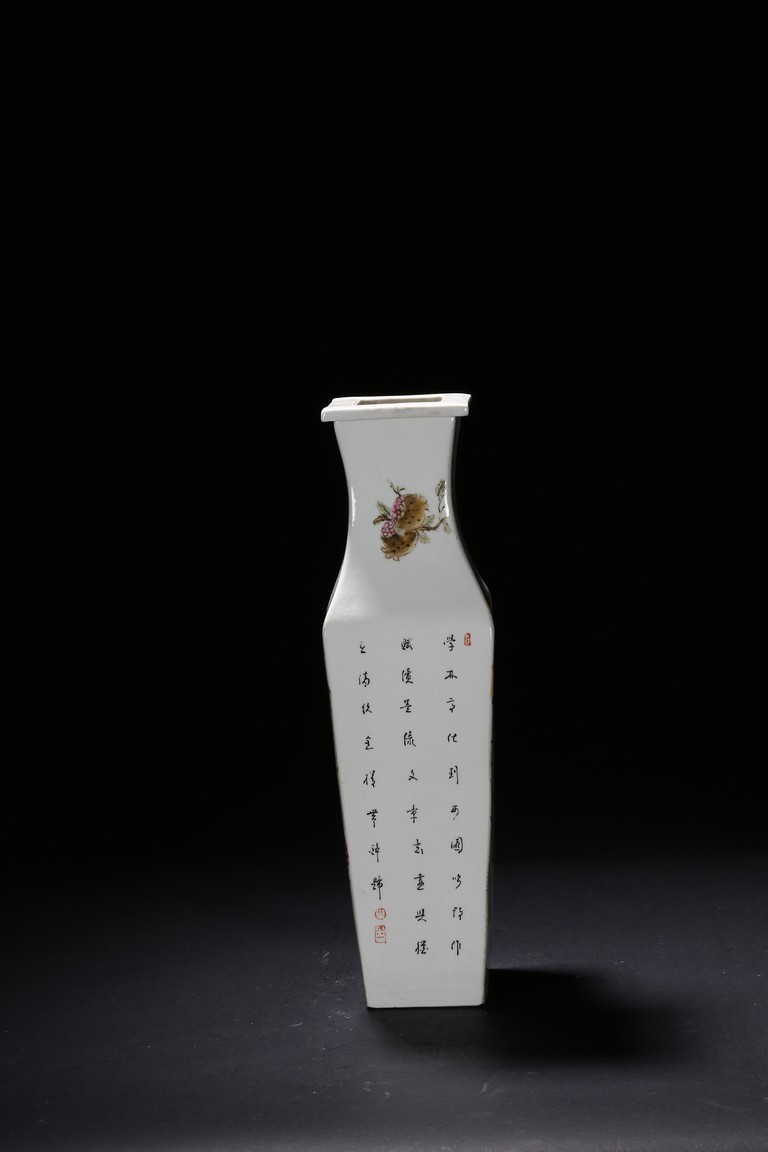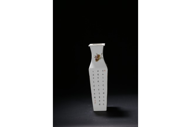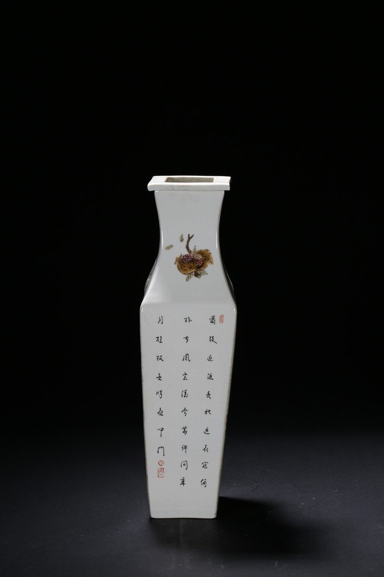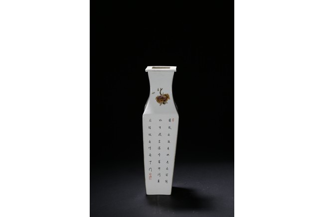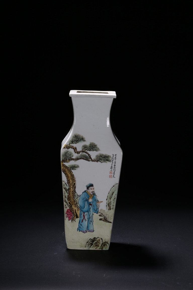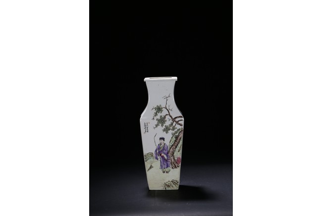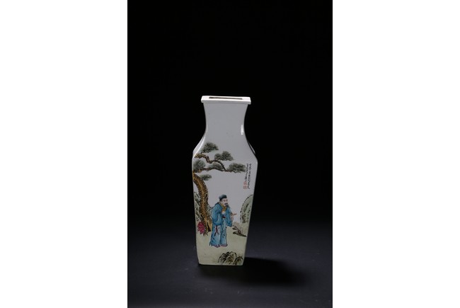 Modelled in square shape, with gently narrowed neck and flattened square opening. Two exterior surfaces are painted with two different scenes of a scholar standing under the tree, and inscribed. On the other two sides, wrote two poems, and painted pomegranates on their top. With a seal mark on the bottom.