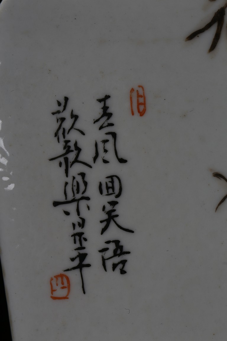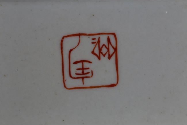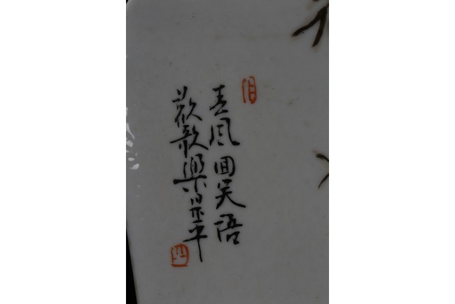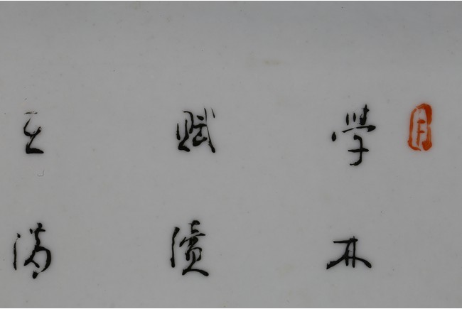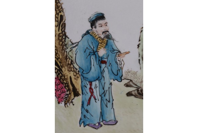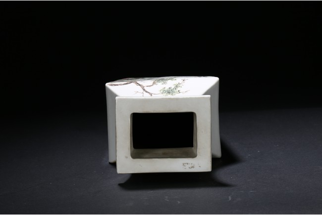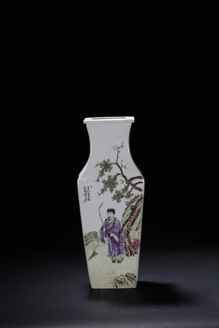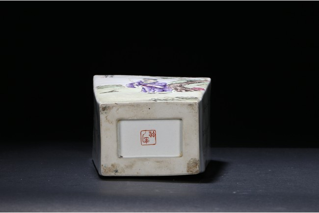 Modelled in square shape, with gently narrowed neck and flattened square opening. Two exterior surfaces are painted with two different scenes of a scholar standing under the tree, and inscribed. On the other two sides, wrote two poems, and painted pomegranates on their top. With a seal mark on the bottom.
