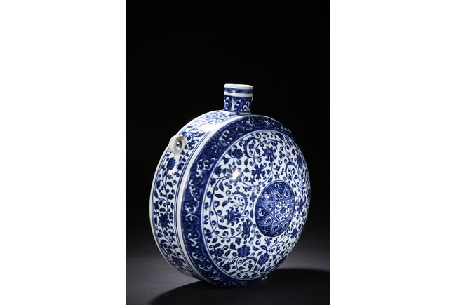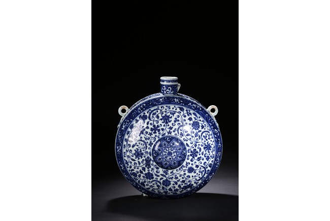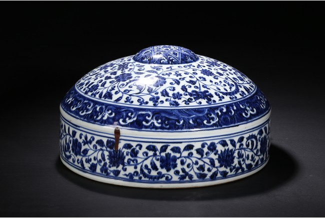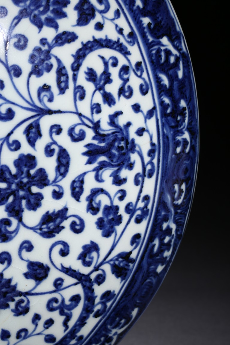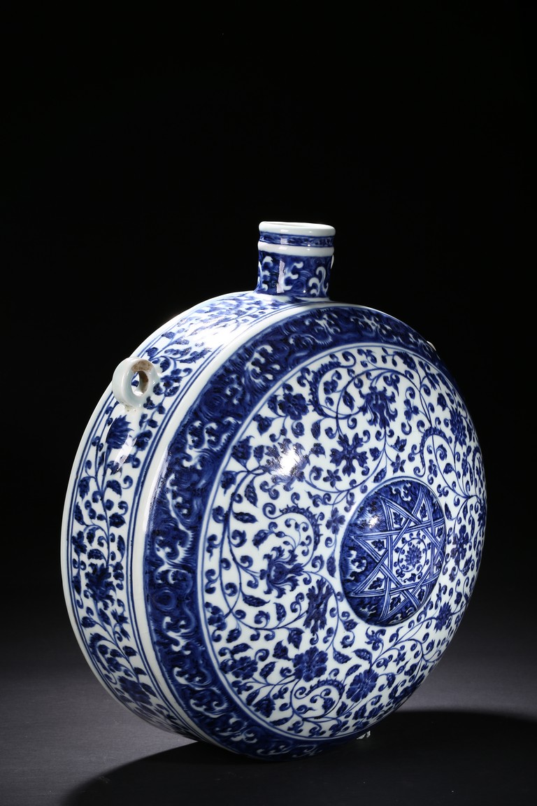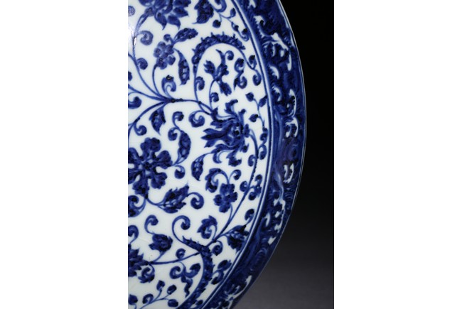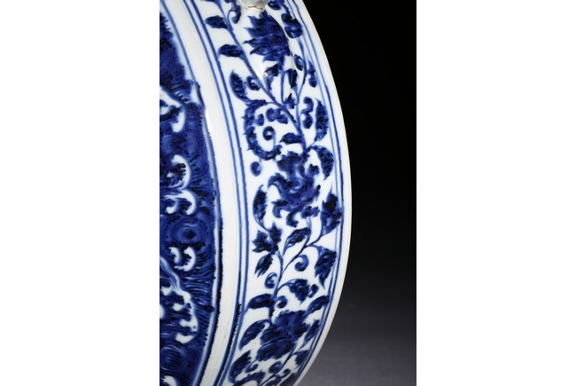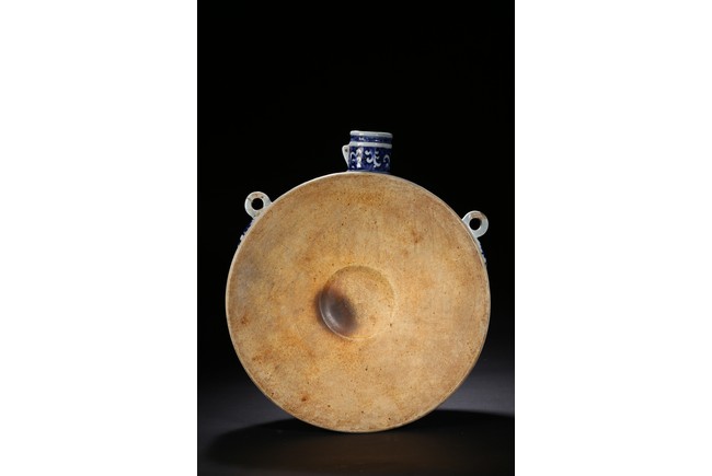 Of flattened circular shape, the exterior finely enamelled to the outermost border with crashing waves, the inner border finely painted with scroll lotus foliate pattern, the central raised boss further enamelled with intricate geometric motif. The reverse unglazed.