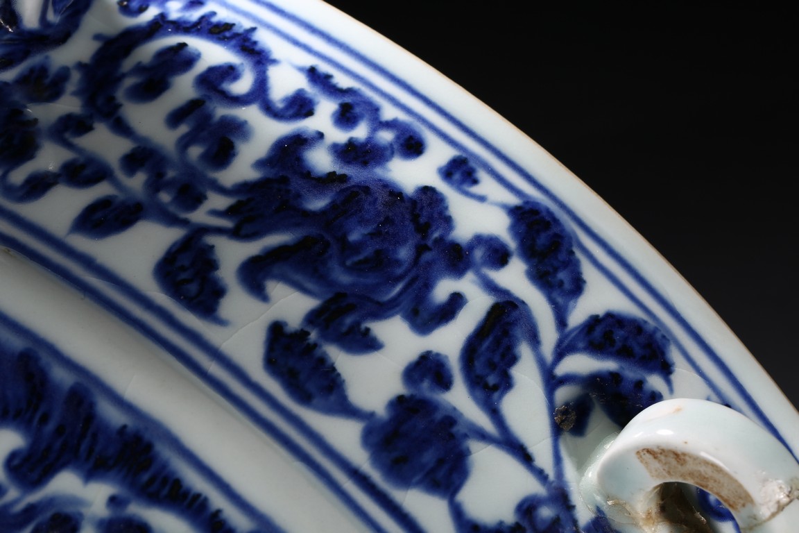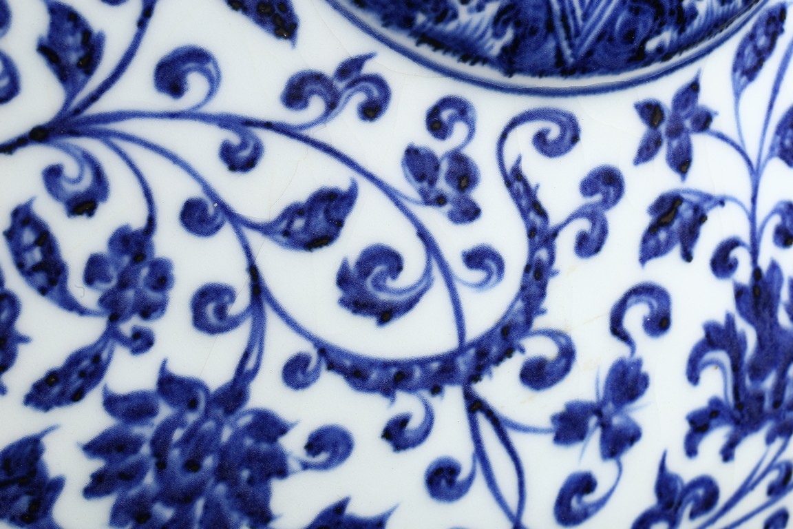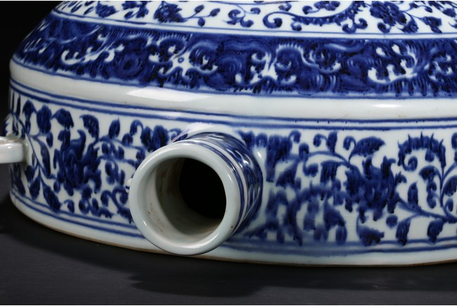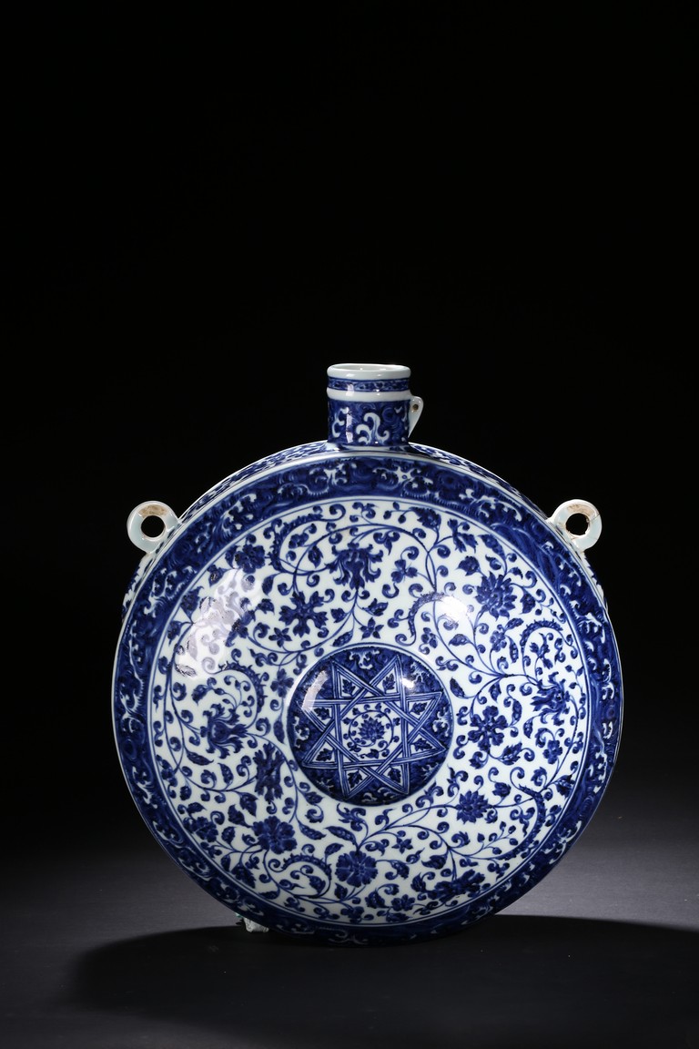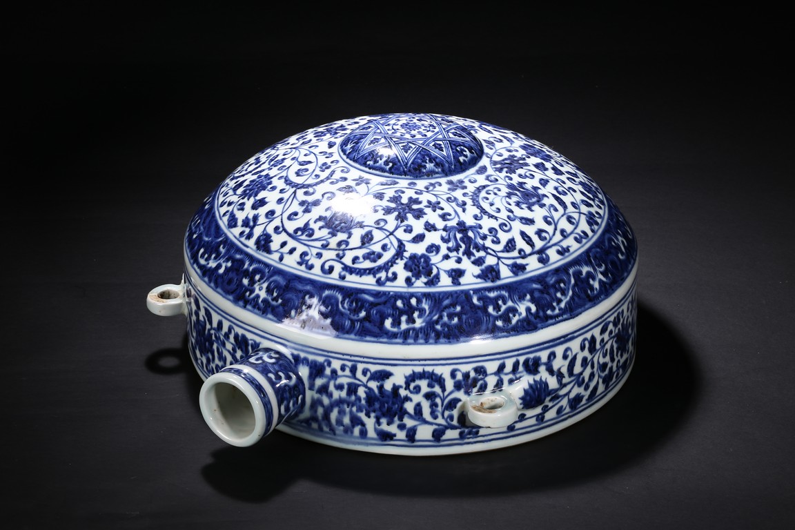 Of flattened circular shape, the exterior finely enamelled to the outermost border with crashing waves, the inner border finely painted with scroll lotus foliate pattern, the central raised boss further enamelled with intricate geometric motif. The reverse unglazed.