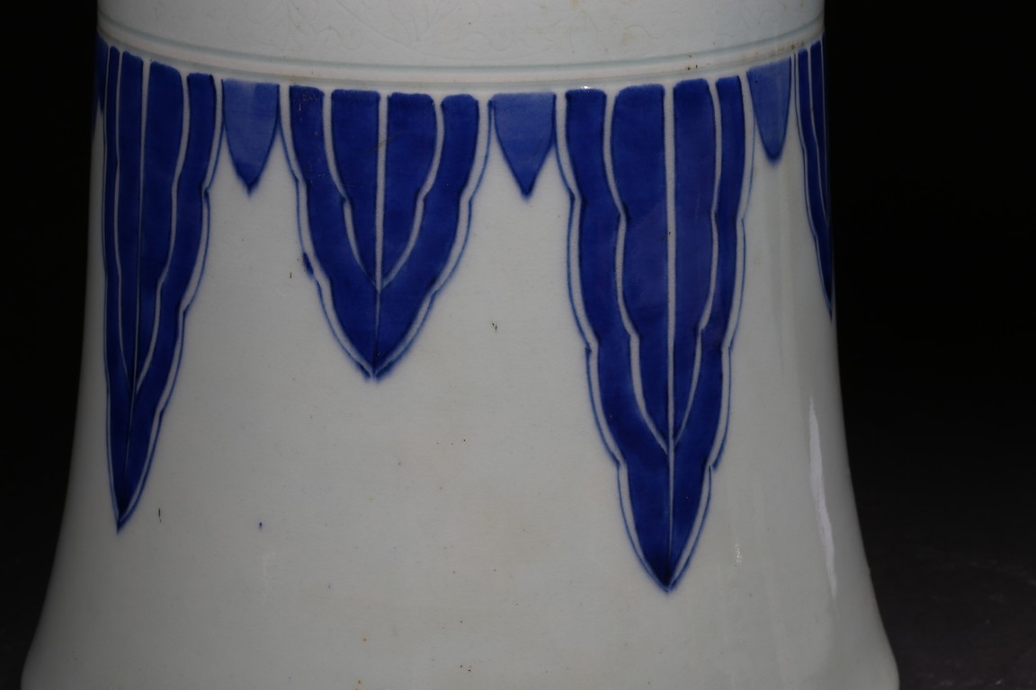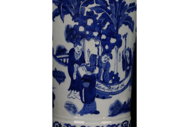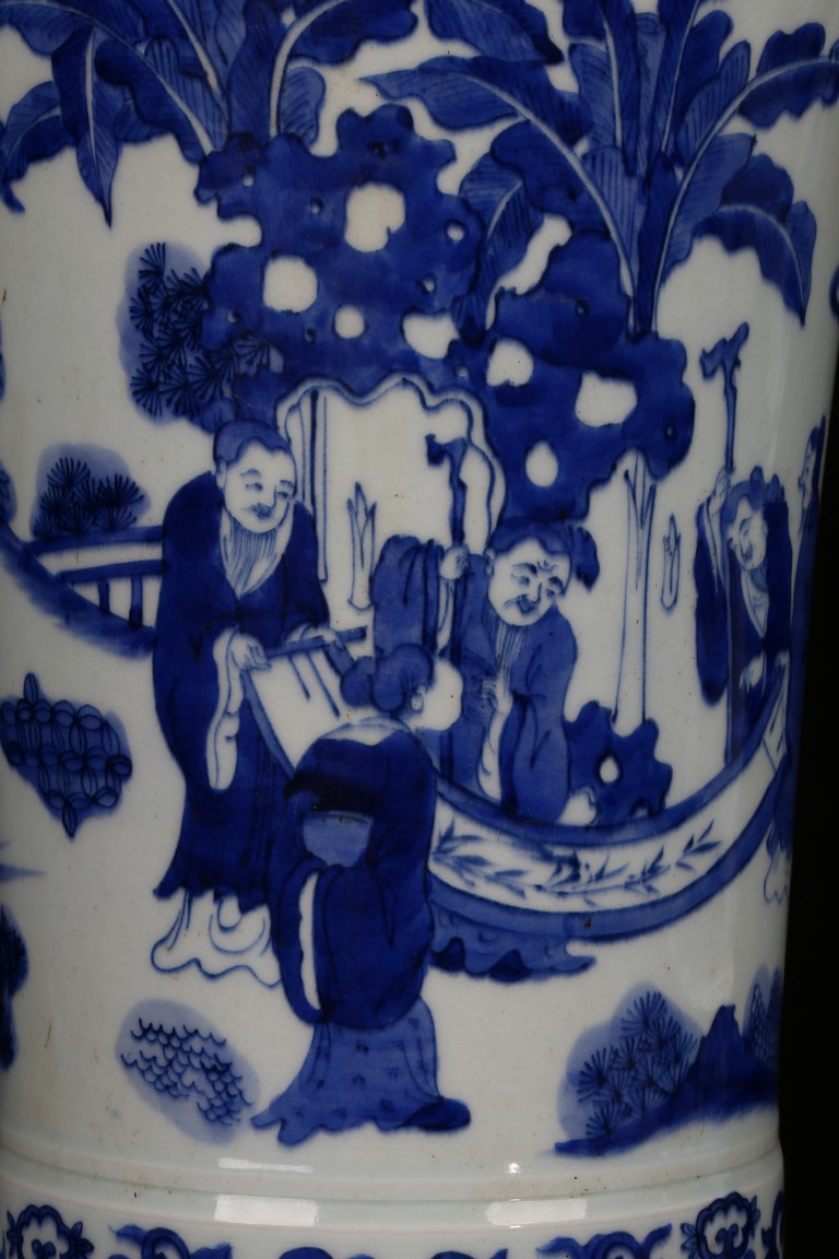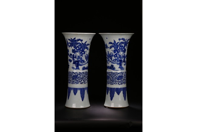 Each of flared rim, the top main part fainly painted group of elder officials appreciating a flower painting under tall trees in a garden setting, the middle section decorated with band of meandering lotus and auspicious ruyi emblems, the bottom section with band of floral lappets. 20th century.
