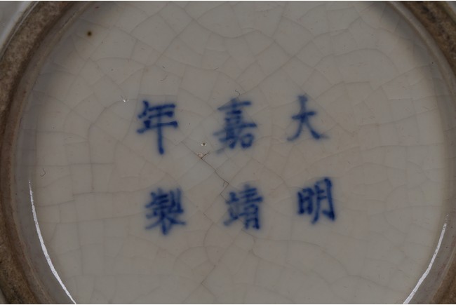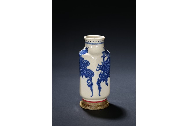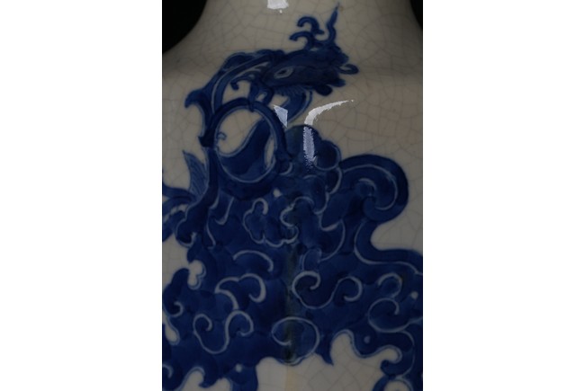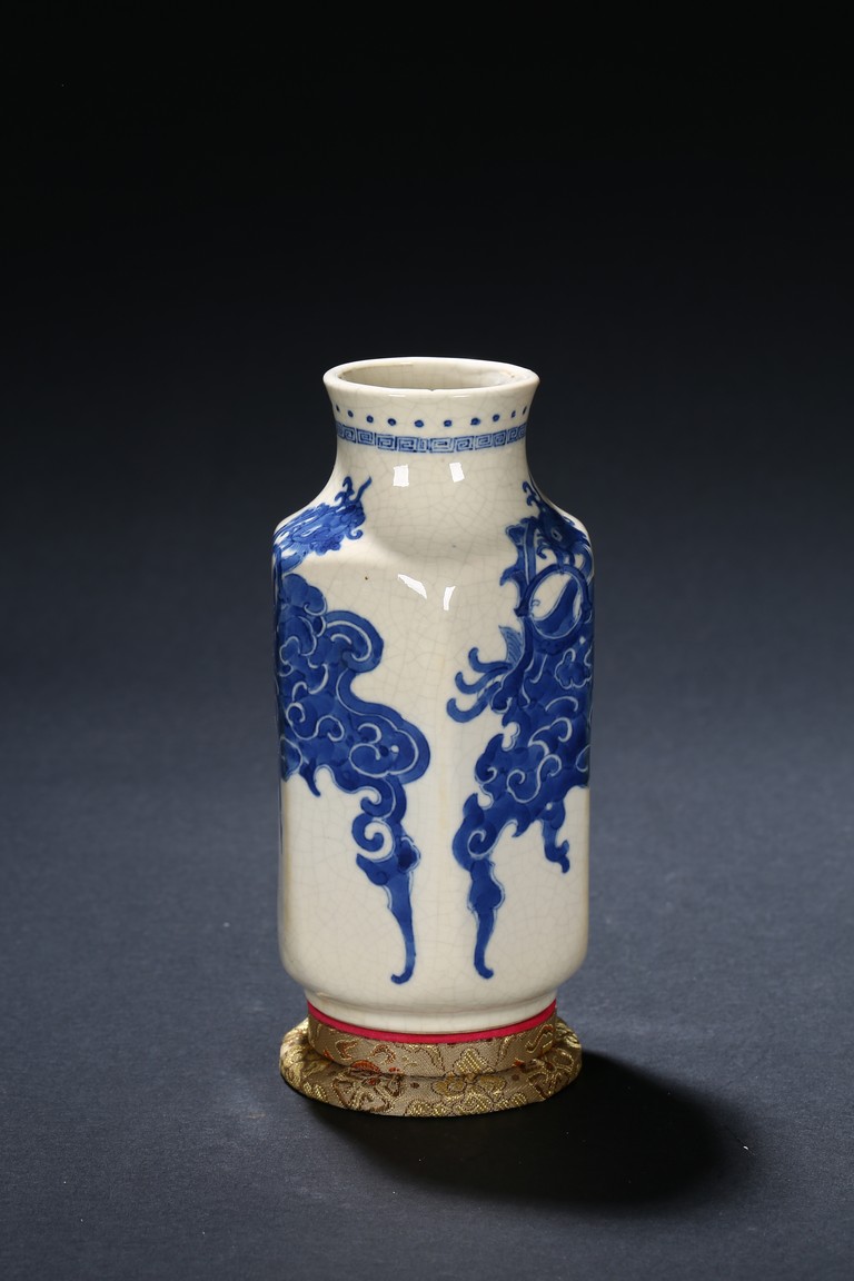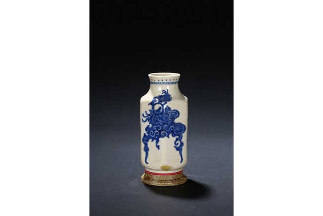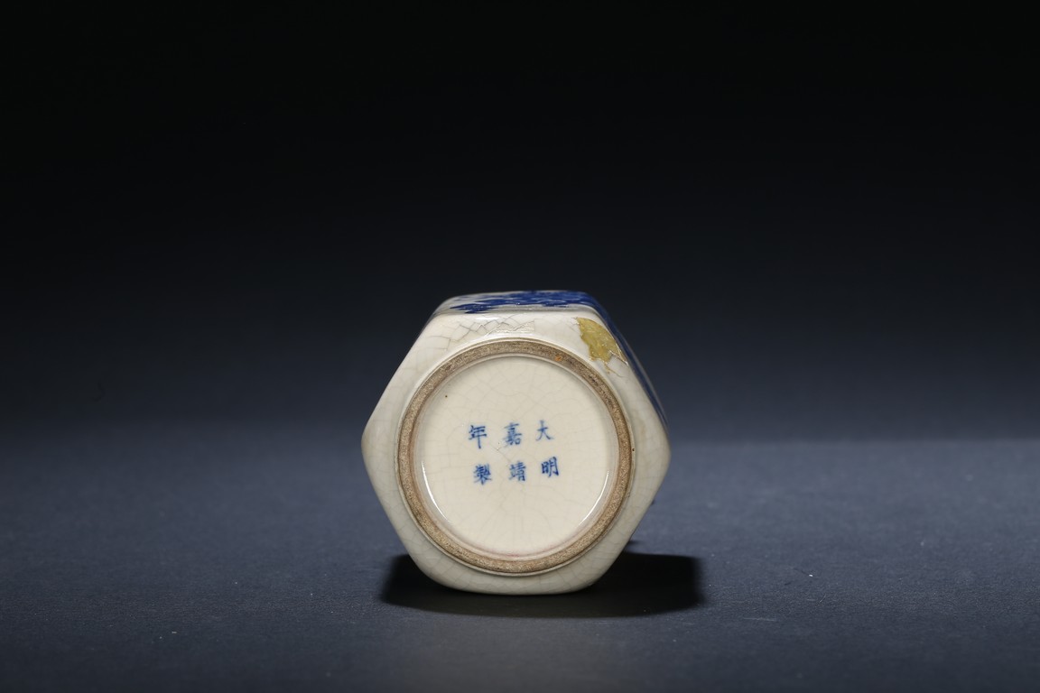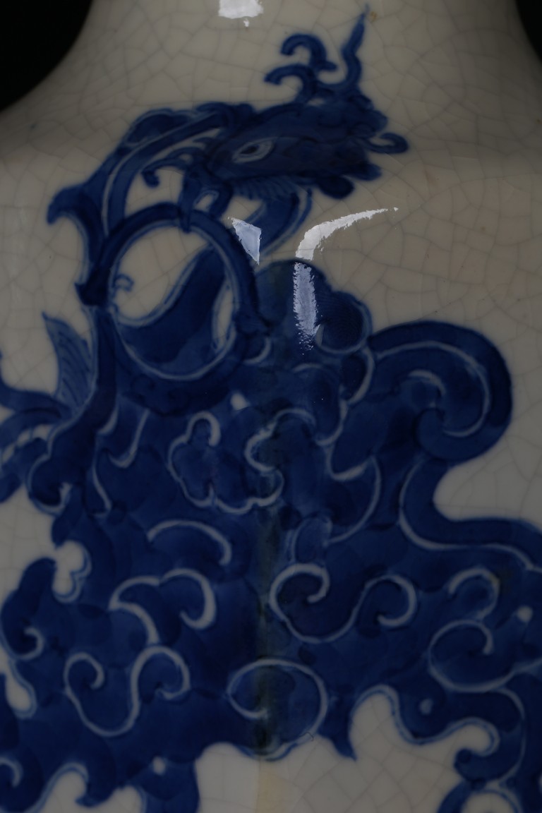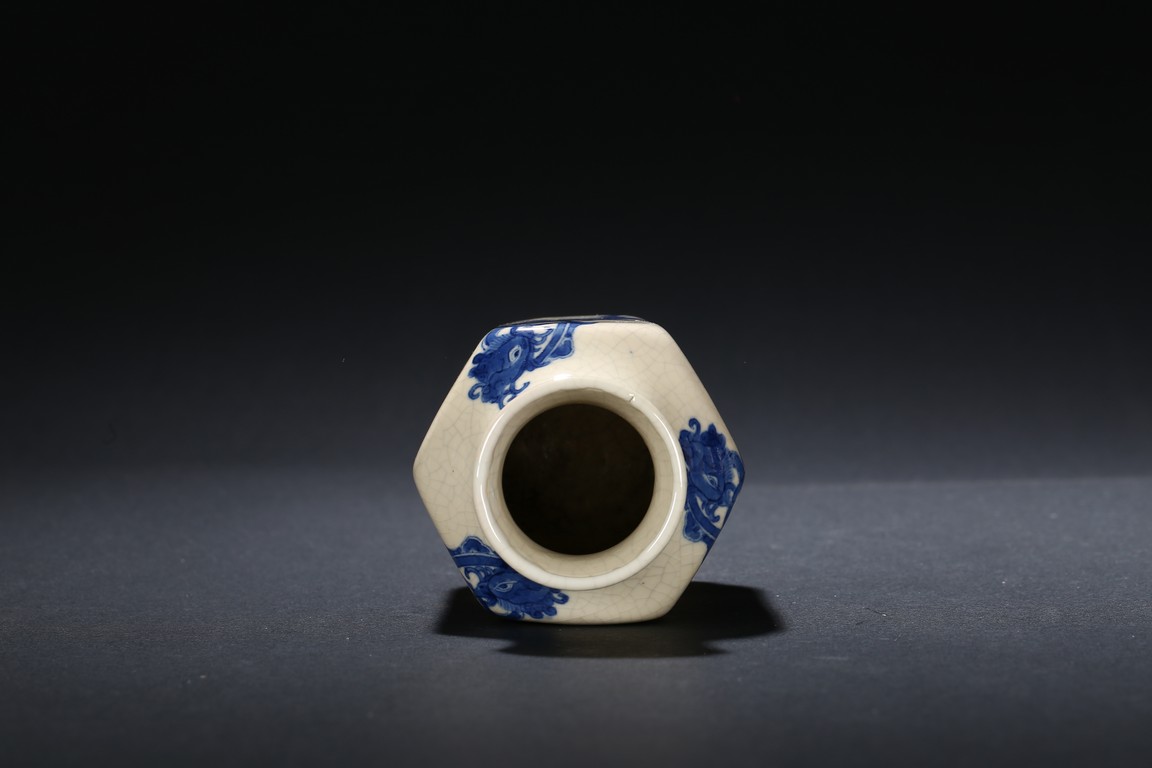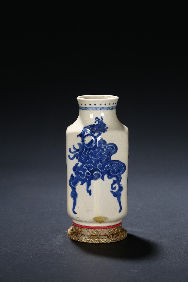 Of pentagonal form, painted around the body with phoenix emerging from clouds, all reserved on white ground with fine crackles. Qing Dynasty period.