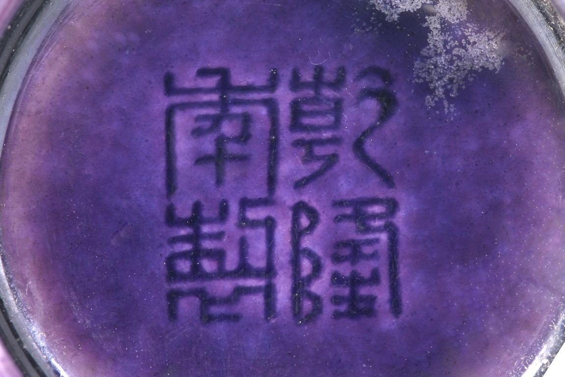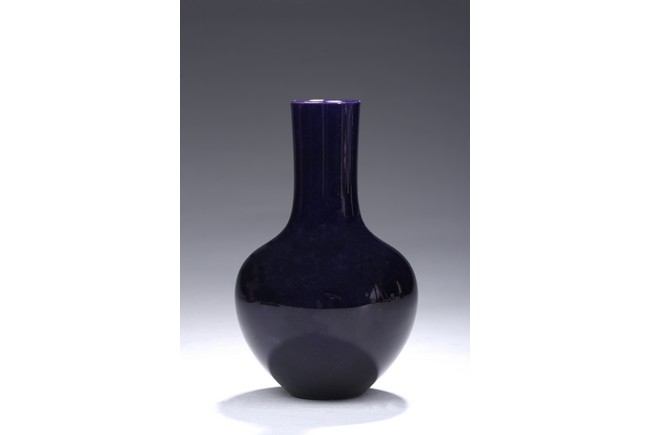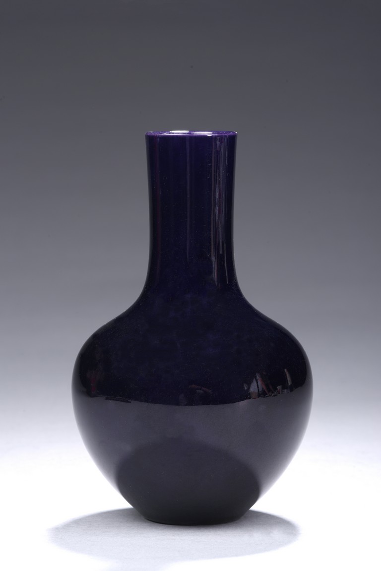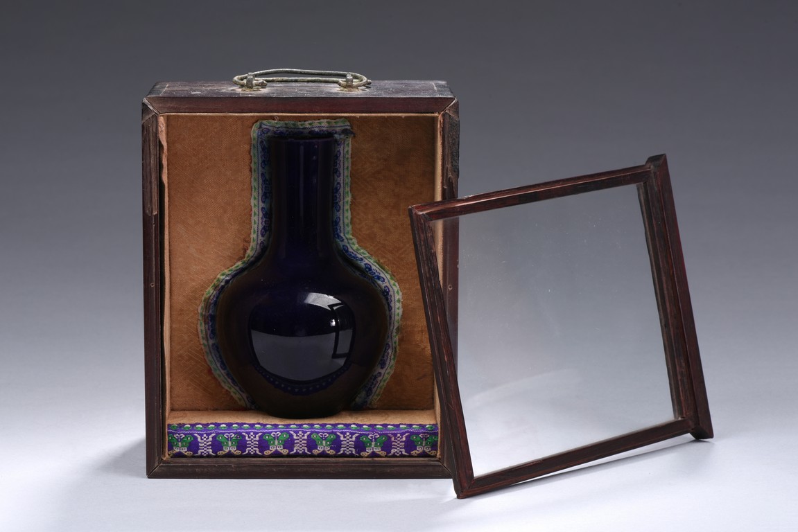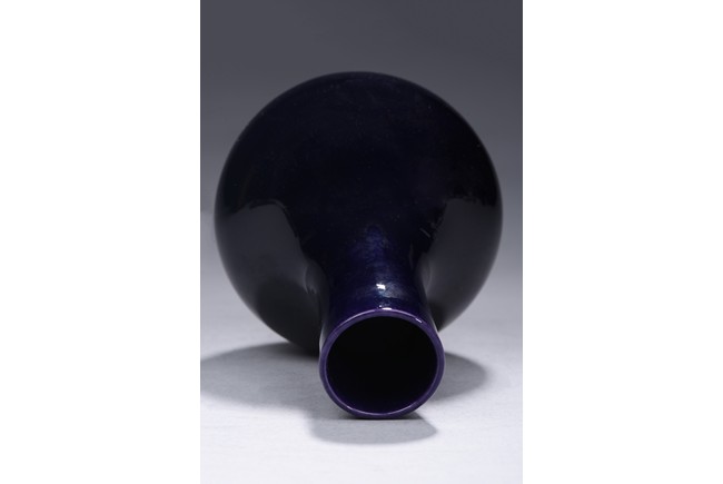 The globular body rising from a recessed base to a tall cylindrical neck,covered overall with a polished dark blue glaze,the base inscribed with the four character mark,original hardwood box. Qing Dynasty period.
