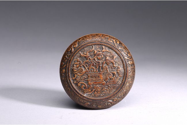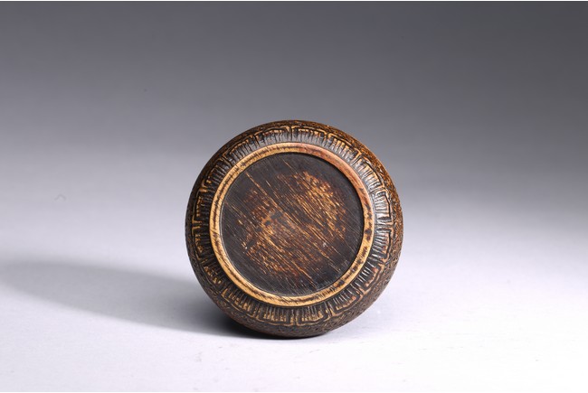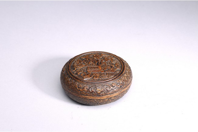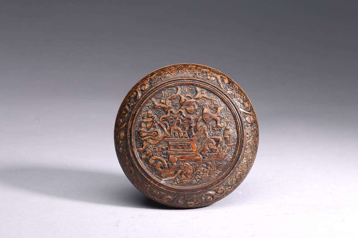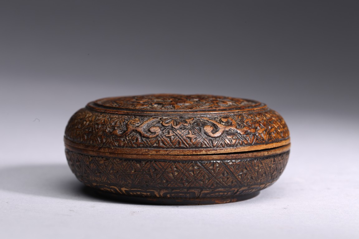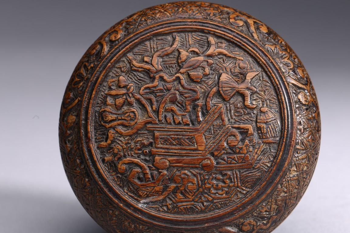 A CARVED WALNUT WOOD ROUND BOX 清 核桃木雕花圓蓋盒