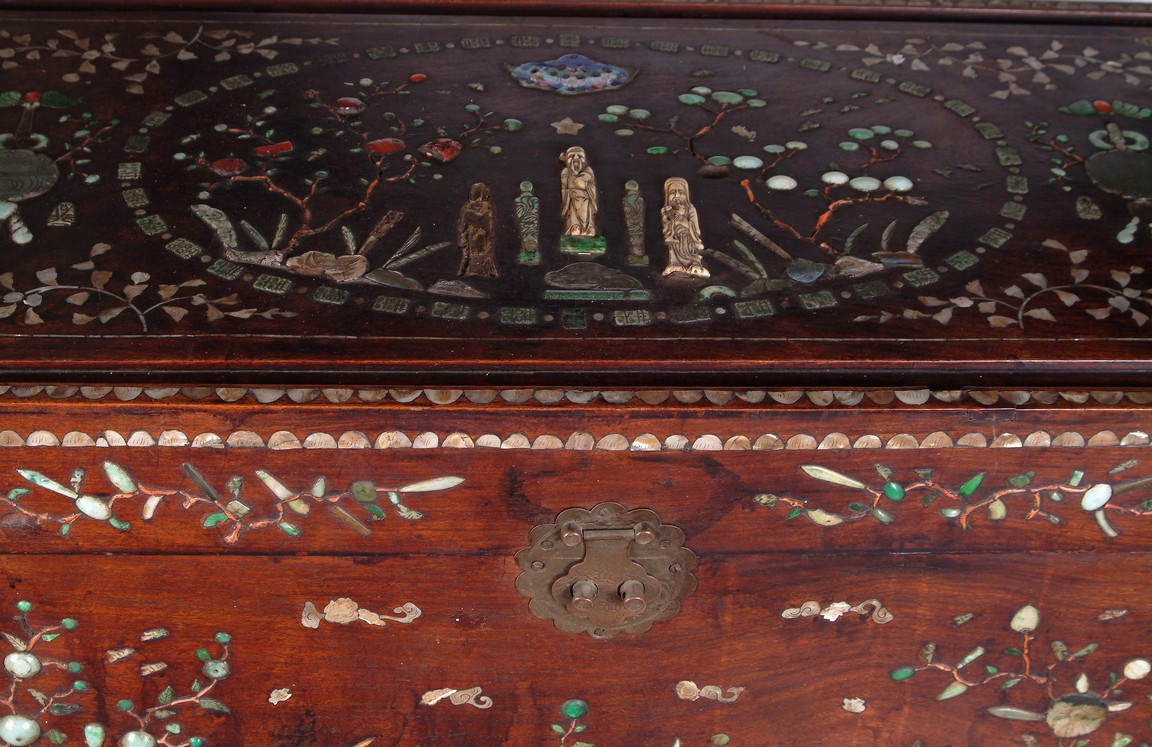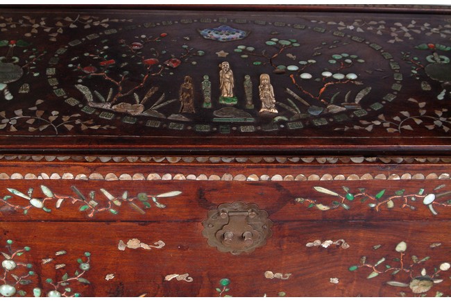 This hardwood trunk is embellished with coral,jade,jadeite,mother of pearl,agate,and soap stone,to depict a story scene with warriors engaging in a battle. The chest sits on top of four legged wooden base inlaid with mother of pearls. Qing Dynasty period.