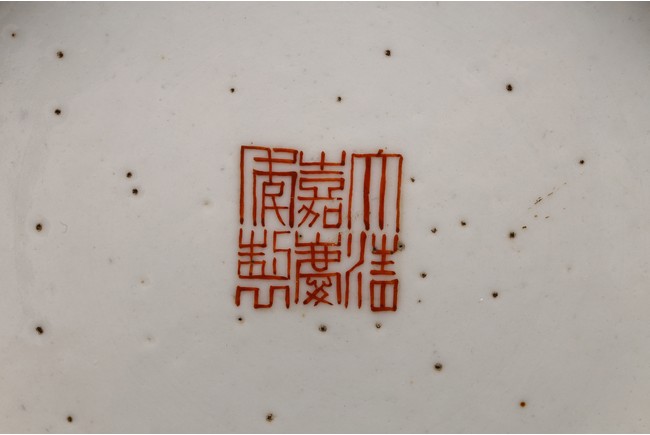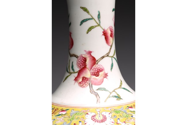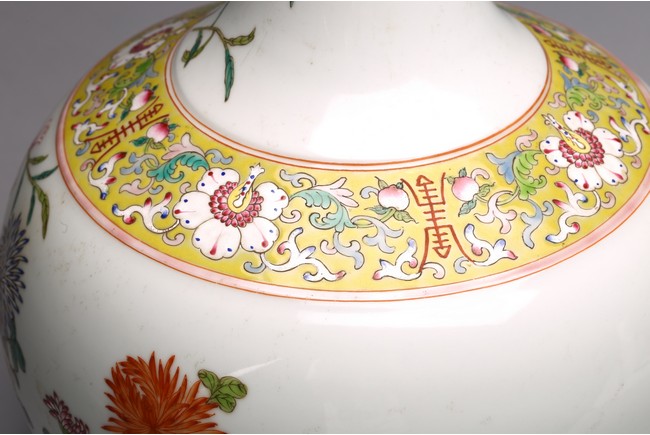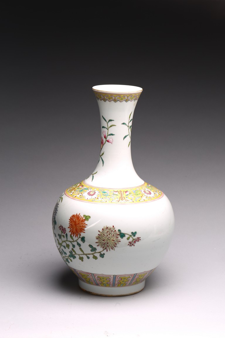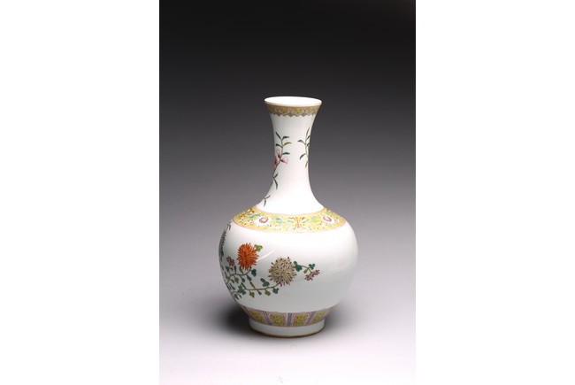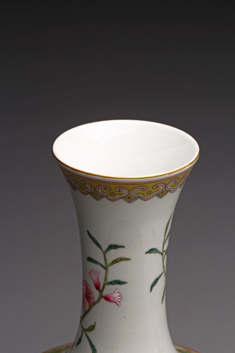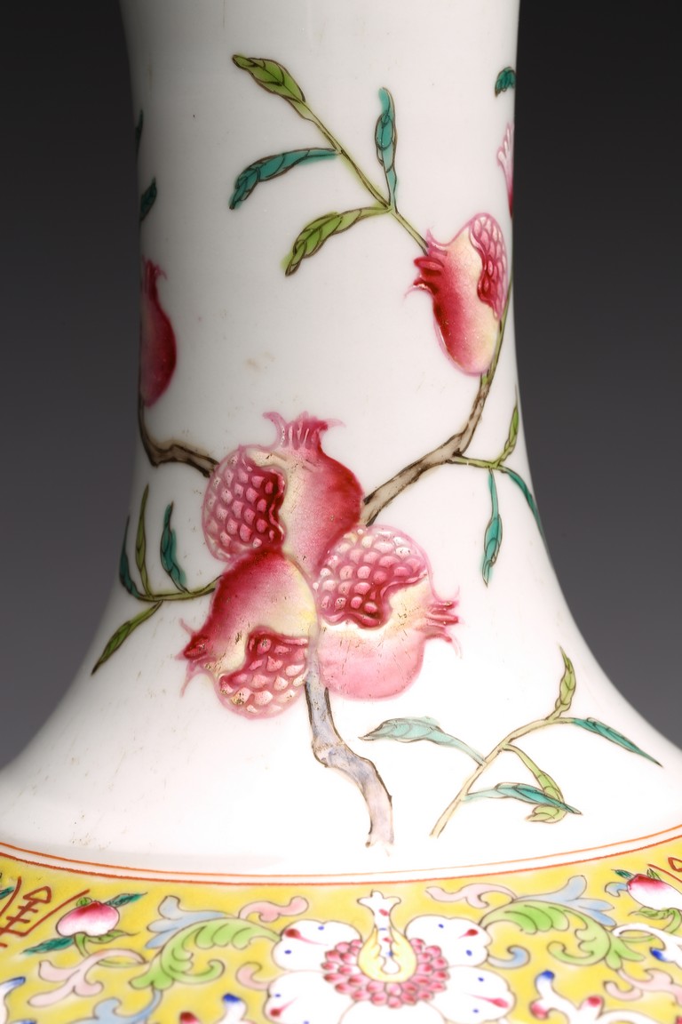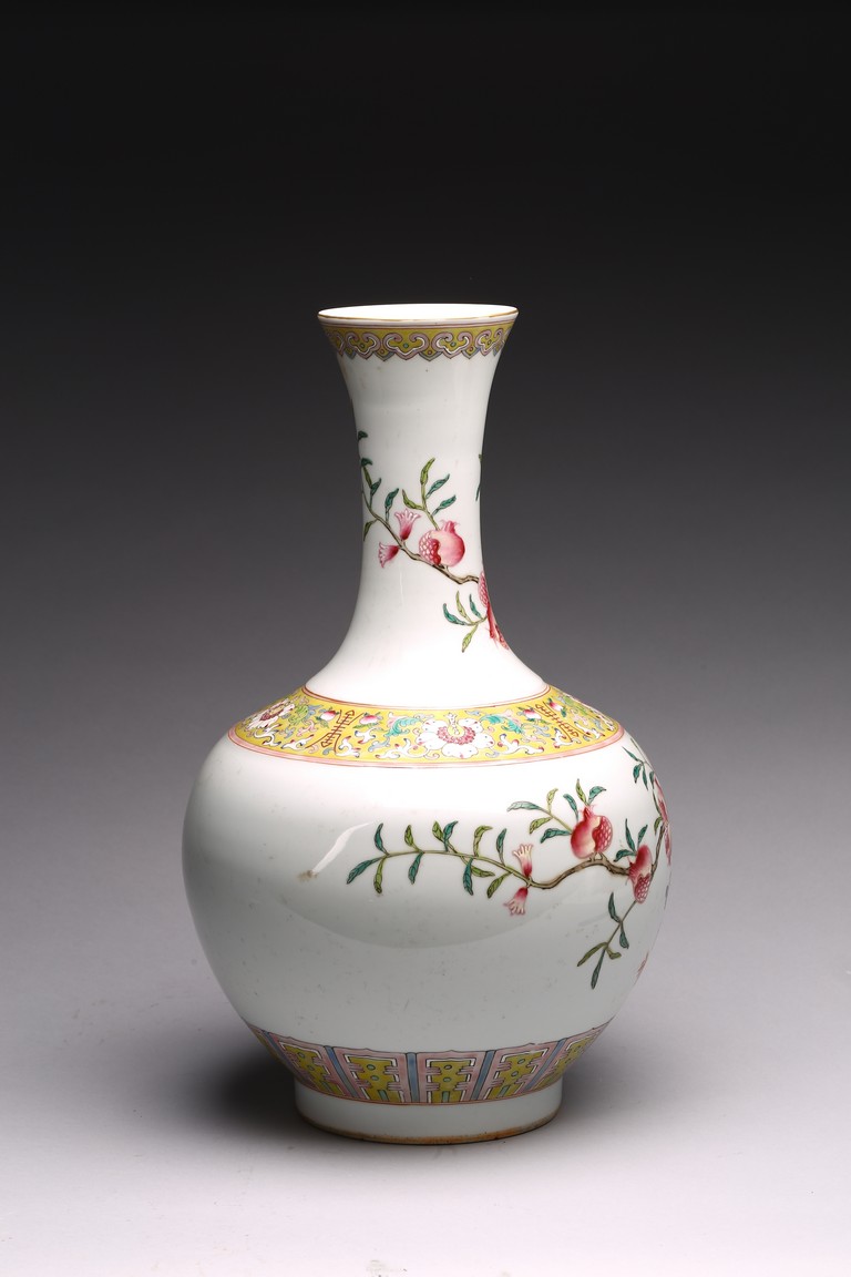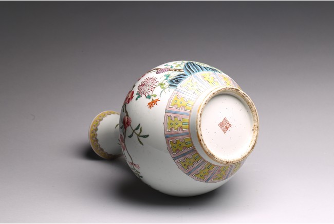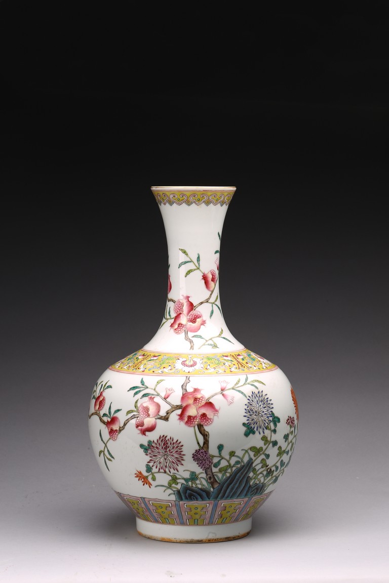 Raised by a cylindrical ring foot, modelled with circular body and long neck. Painted with pomegranates and chrysanthemums on white glaze ground. The base with six character Jiaqing mark. Qing Dynasty period.