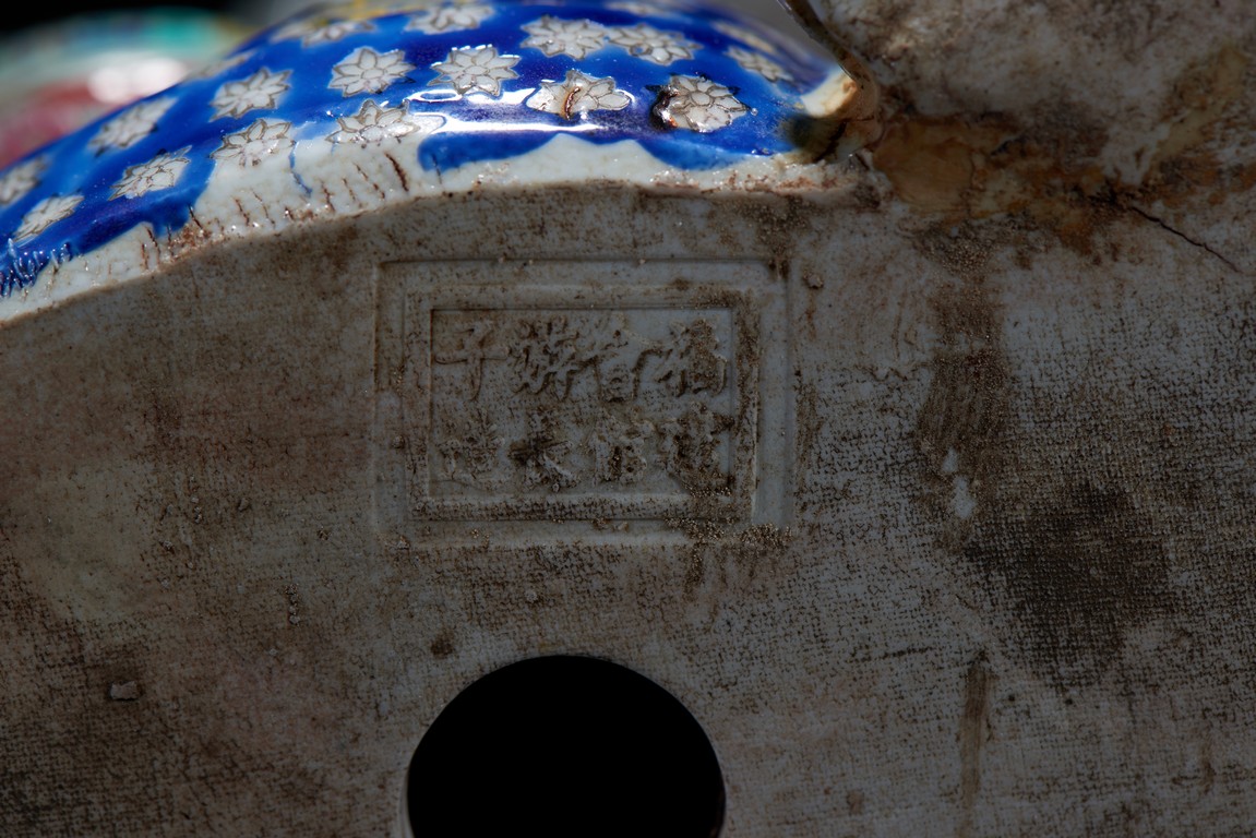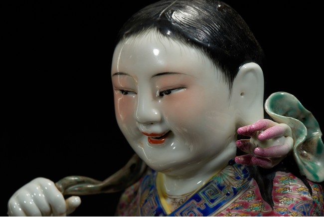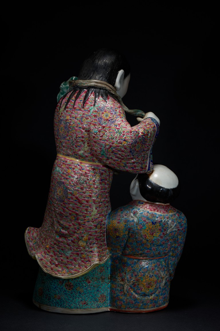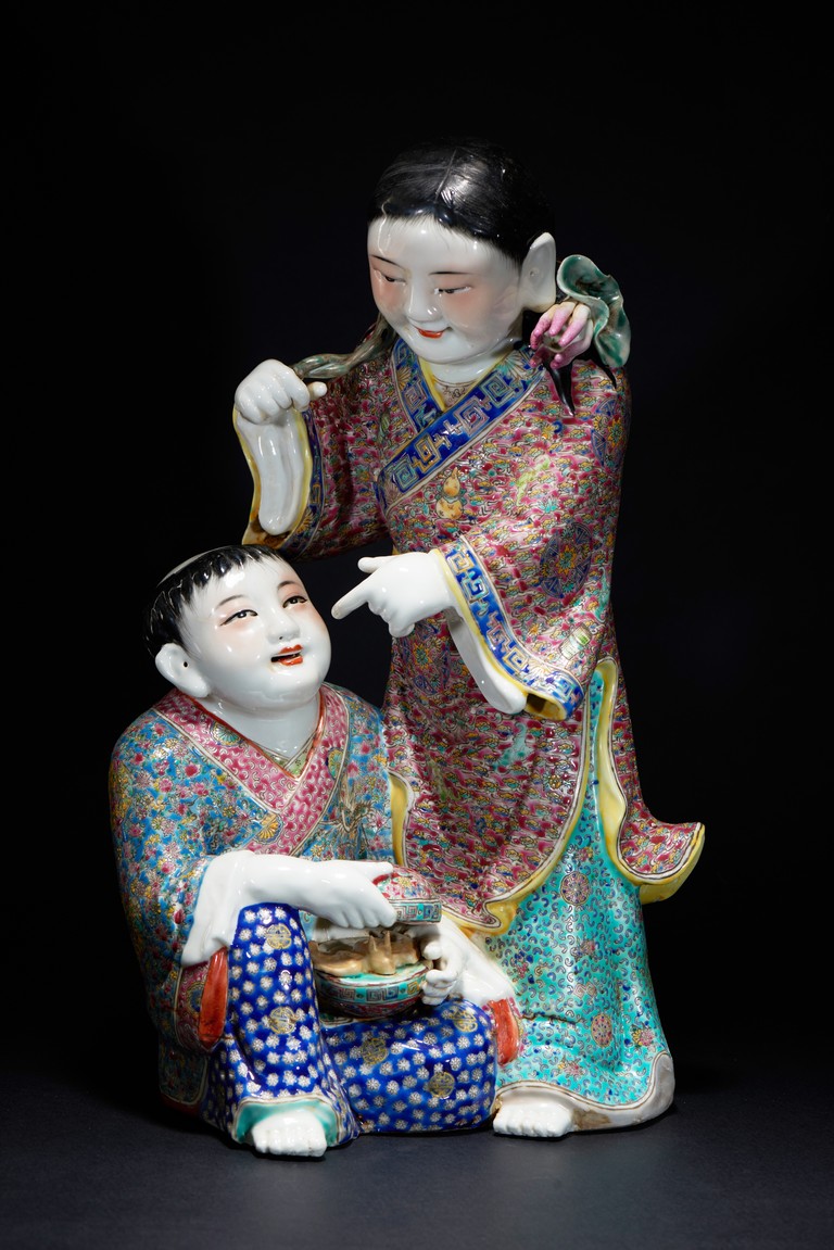 The figural group is shown with one immortal holding a lotus spray over his shoulders, looking downward at his companion, the other seated holding a open box with a bat to the interior, both shown with smiling expressions, the robes adorned with elaborate floral design. The base with an eight character mark 'Fu Jian Hui Guan You Chang Zi Zao' (made by You Chang Zi of Hokkien Association) Late Qing Dynasty period.