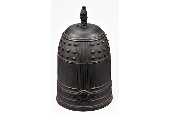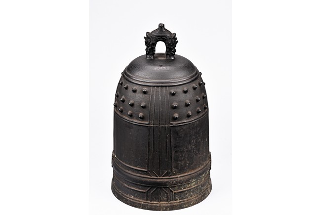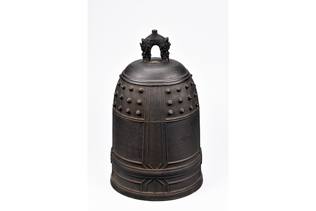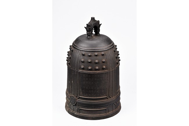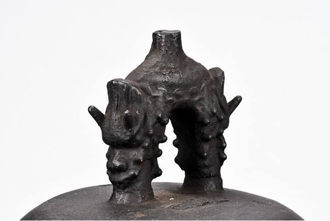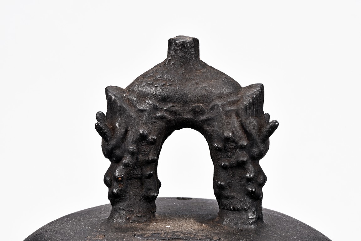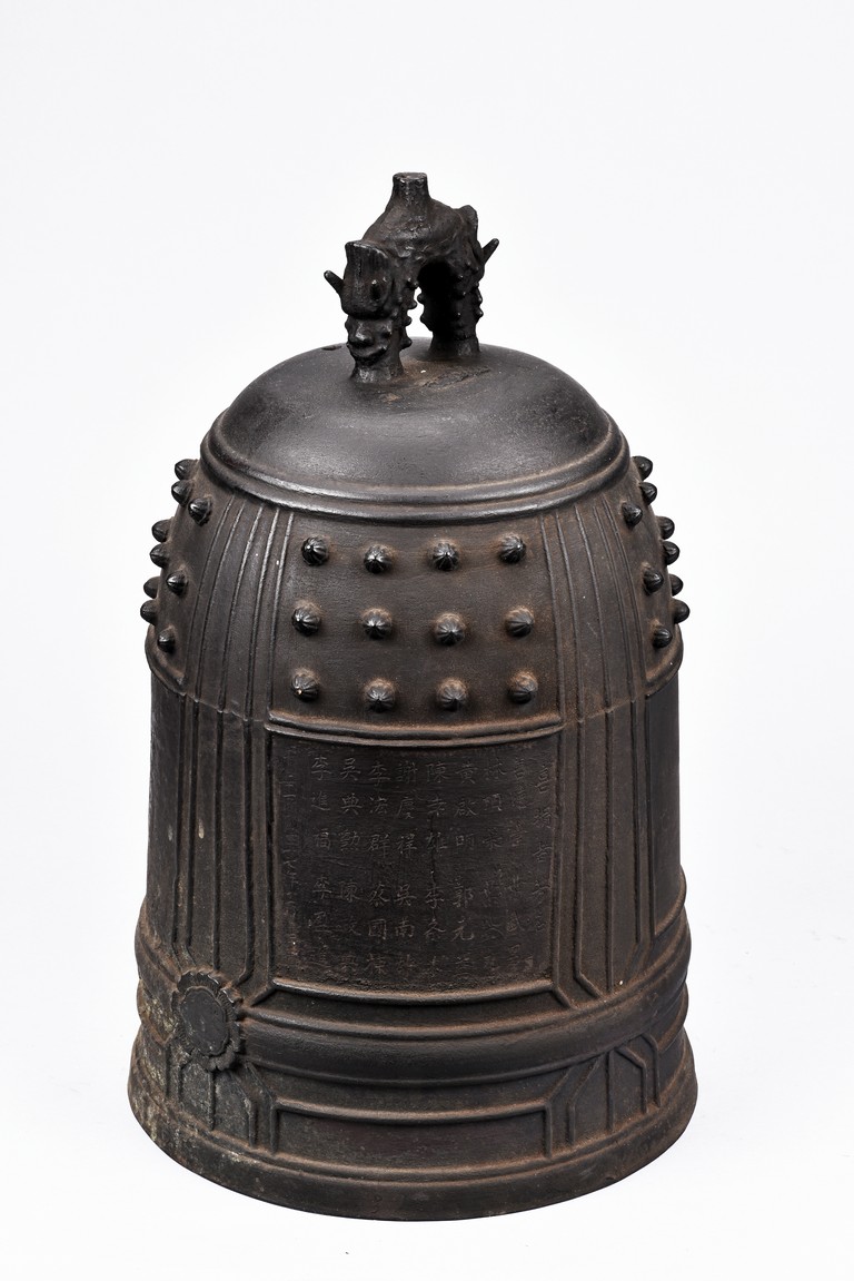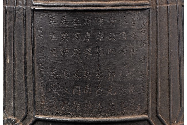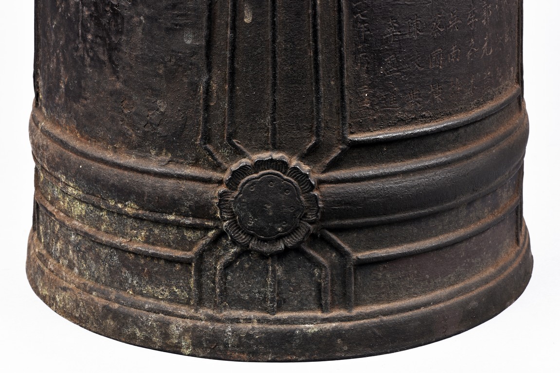 Cast with an double mythical beast loop handle,the deep sides slightly flaring,the body decorated with raised stubs and incised with names of donors for establishment of an Buddhist temple.