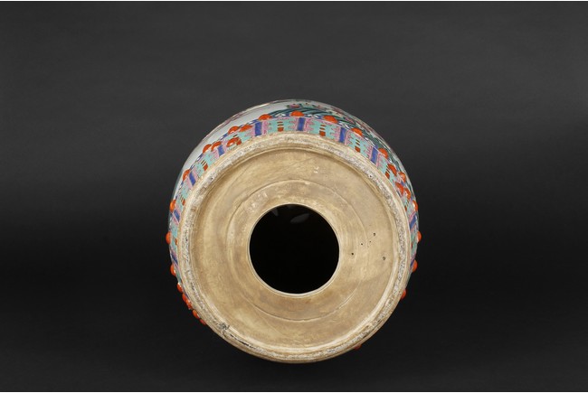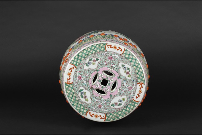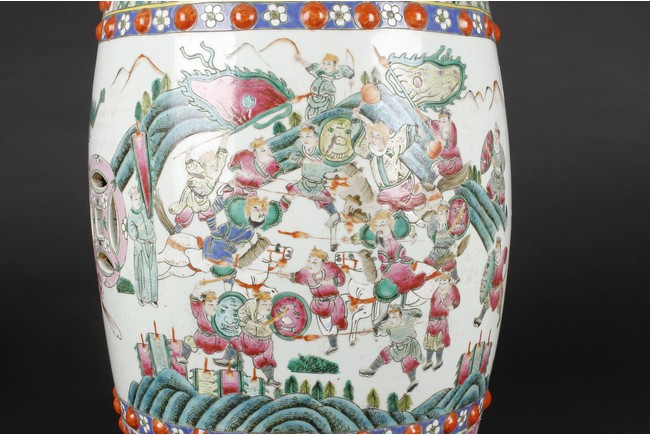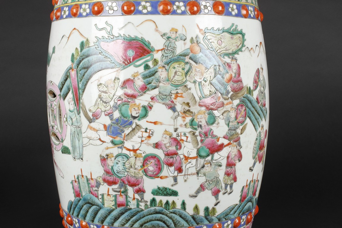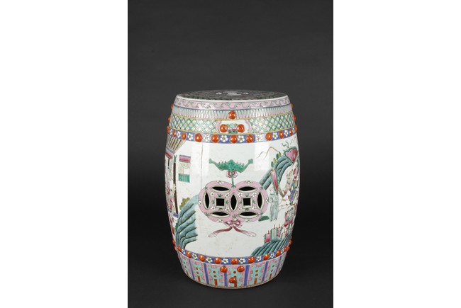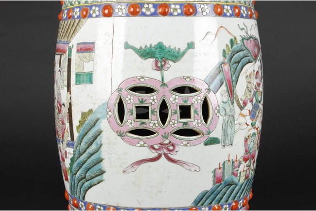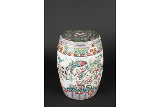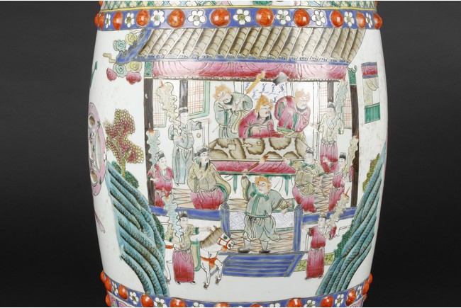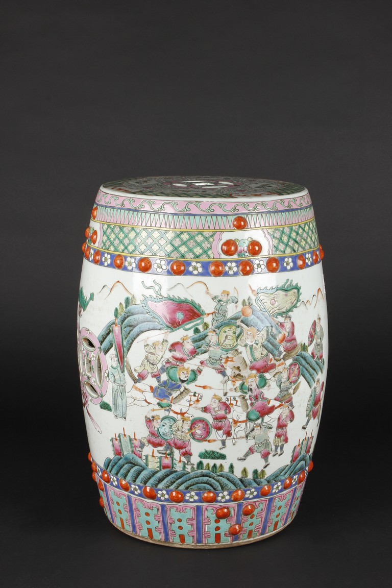 This round stool is in the oval shaped, made of decorated porcelain, blossoming flowers and Chinese window design motifs on the top round panel, leiwen and 36 wooden knots near the rims of top and bottom, body beautifully decorated with depicting motifs of war exercise game in a garden setting with figures on the battleground and commanding officers in the commanding post. Qing Dynasty period.