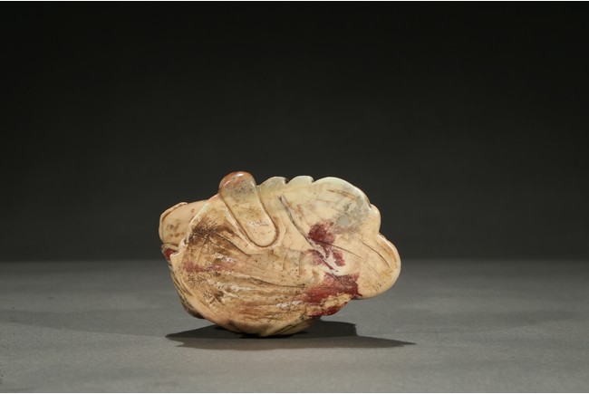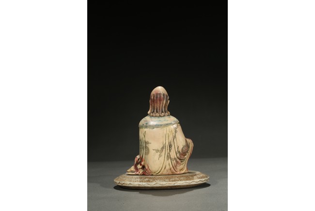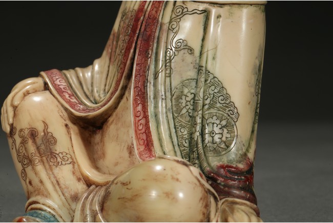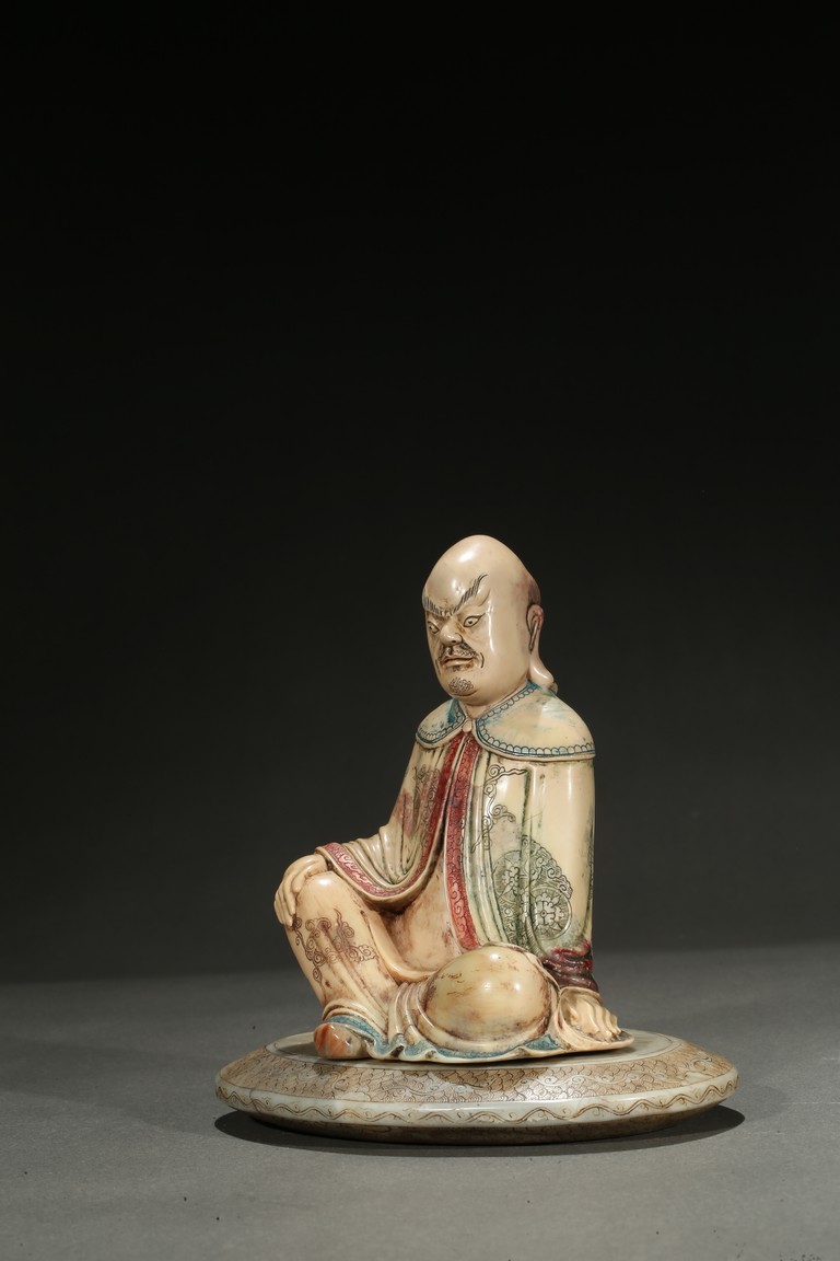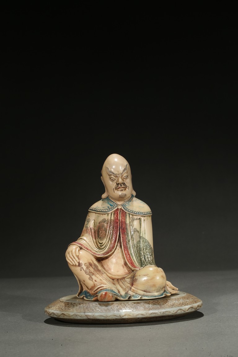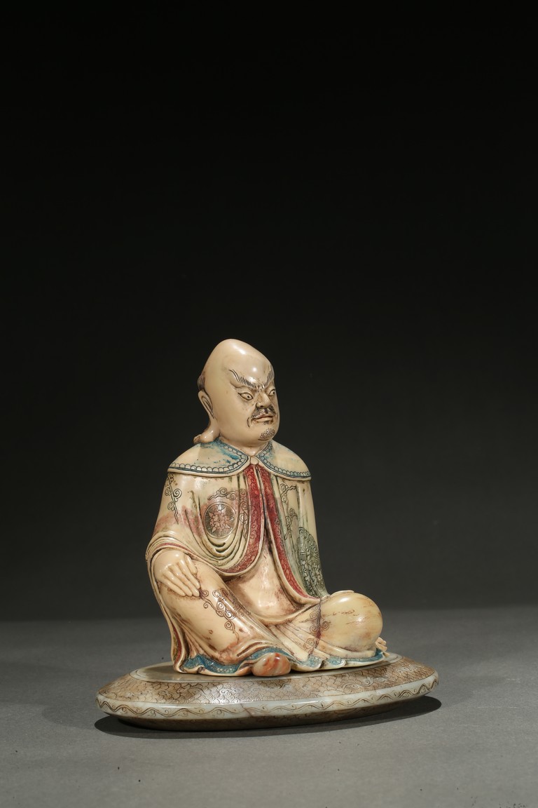The figure carved seated with right knee raised where his right hand rested upon, wearing an elaborate robe finely incised with scrolled floral design, the face showing a stern expression with raised eyebrow, body with traces of pigments, further supported on a flattened disc-shaped soapstone stand.