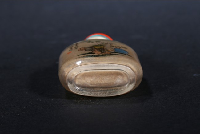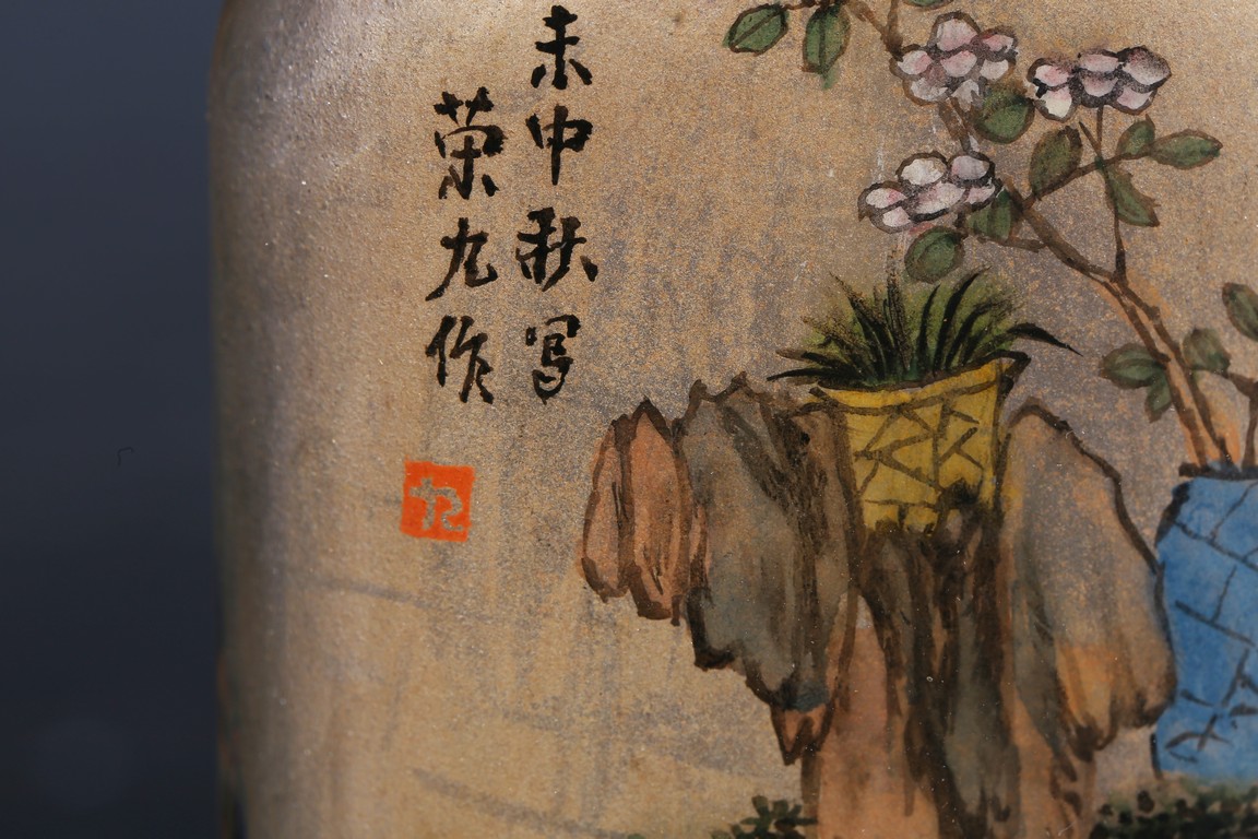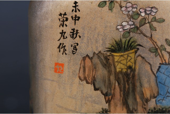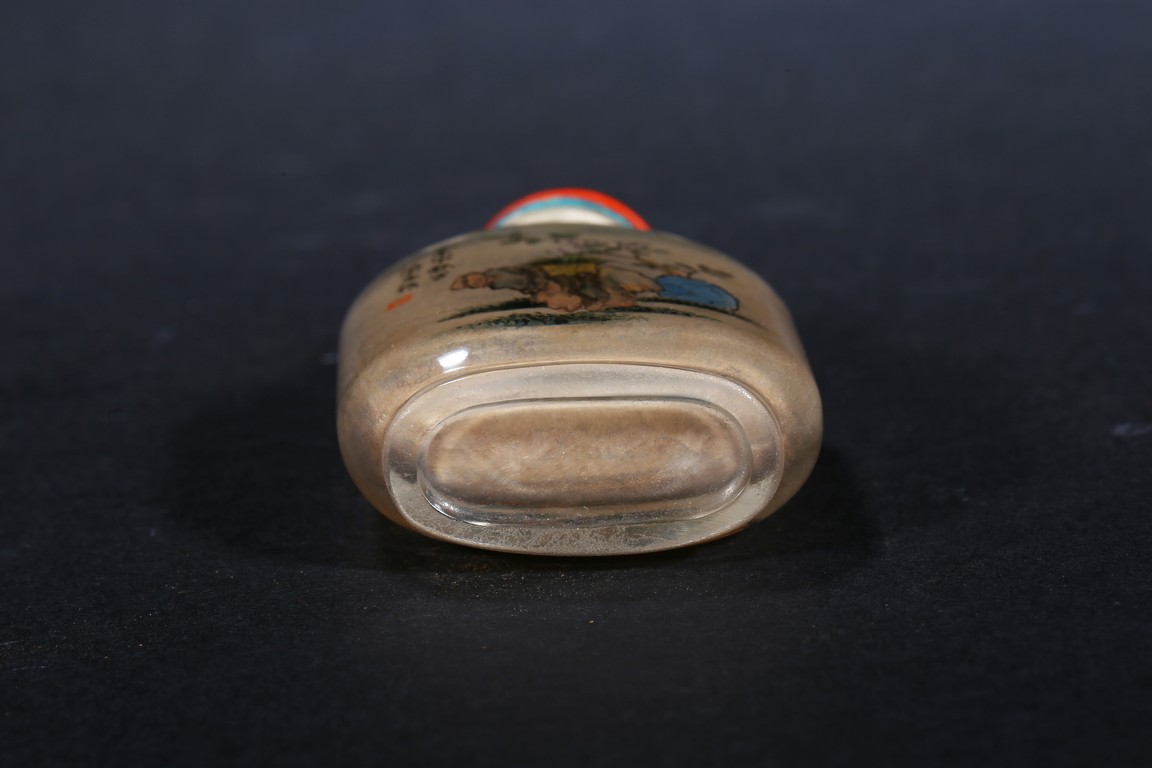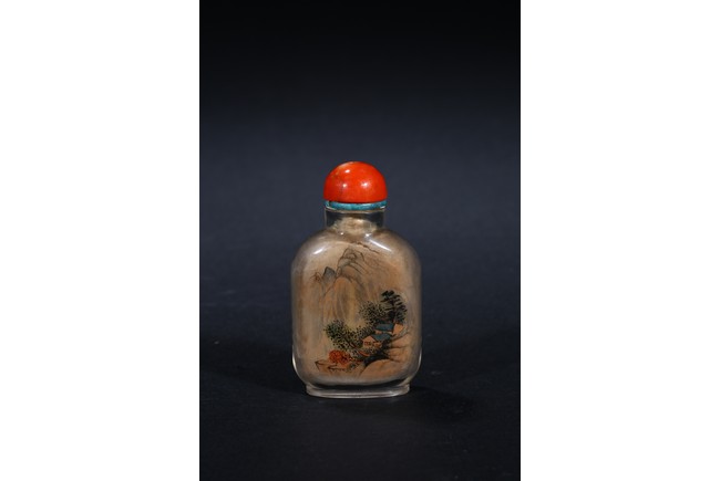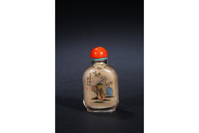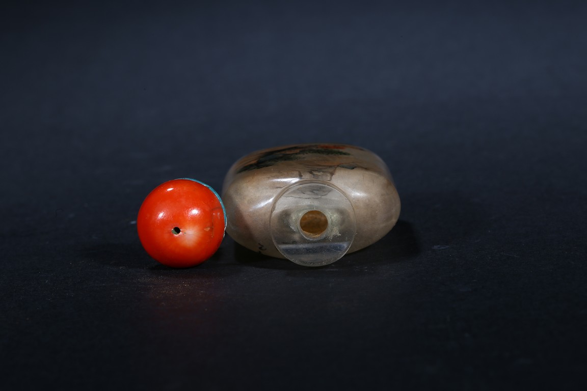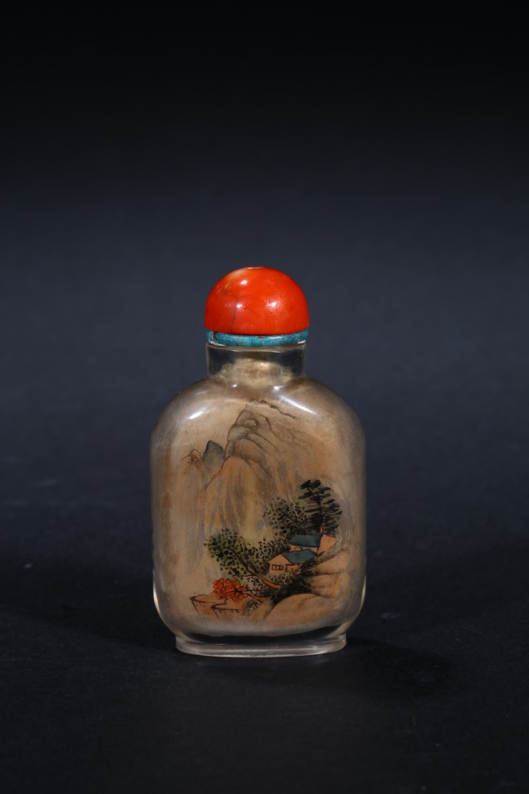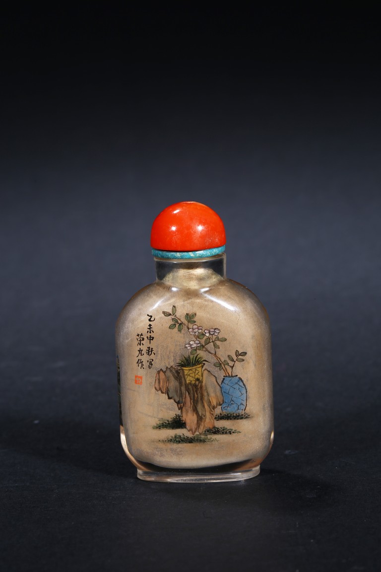 Modelled in flattened square form,inside painted plants on one side, and a landscape scene on the reverse. Inscribed and signed by Rongjiu, with a seal mark. Accompanied with a coral cover. Qing Dynasty.