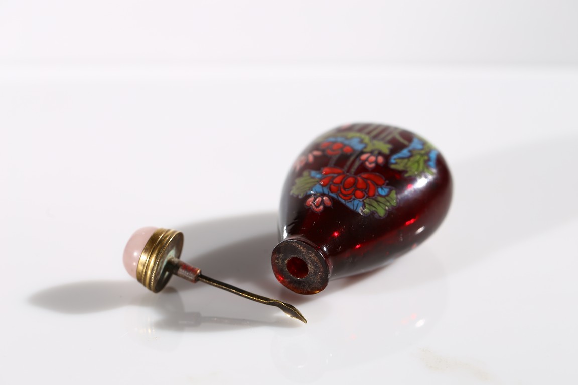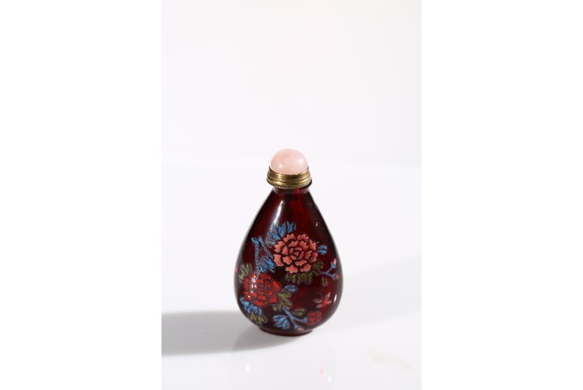 Modelled in flattened ovoid shape, on purple-red transparent glass body, painted lotuses on one side, and peonies on the other side.
