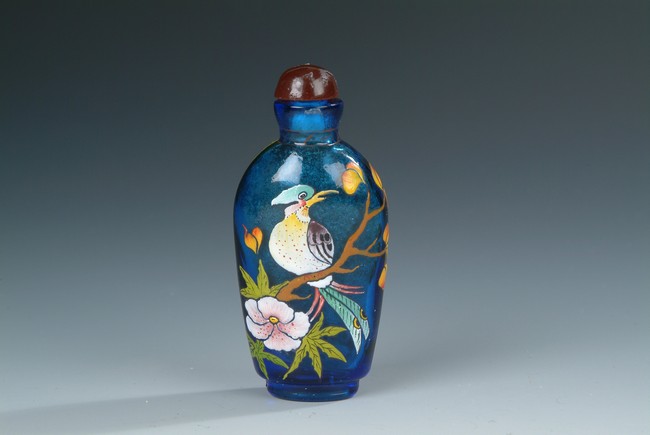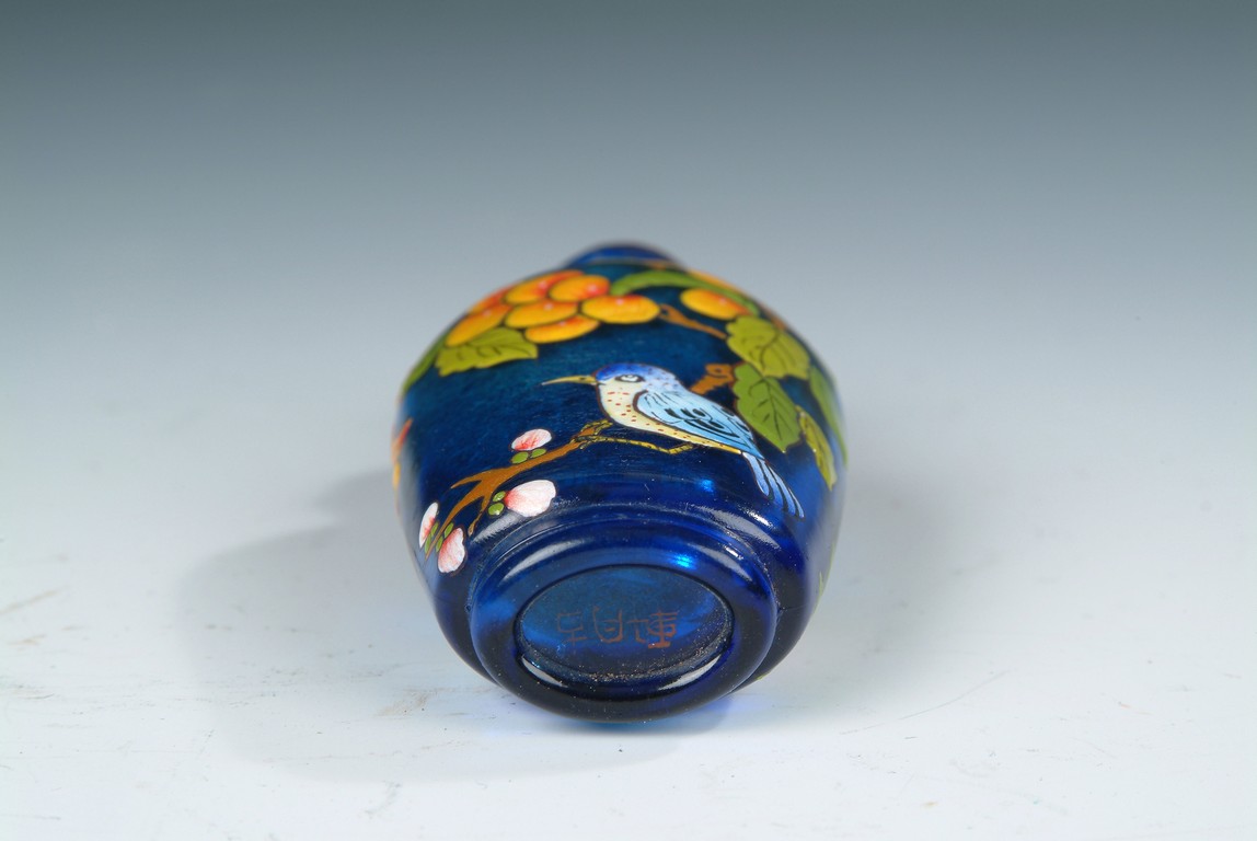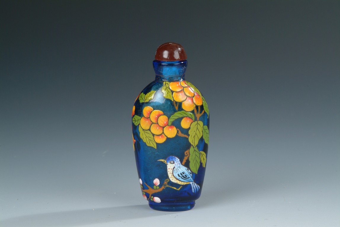 Of elongated cylindrical form, tapering down from shoulder to a round foot, body depicts two colorful bird perched on fruit and flower trees over blue colored glass, capped with brown color glass stopper. Missing spoon. 19th century.