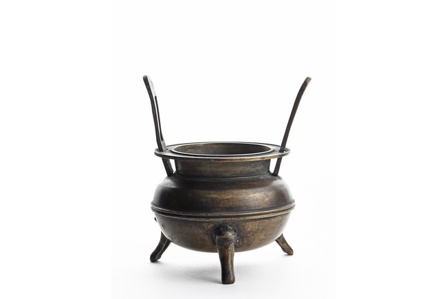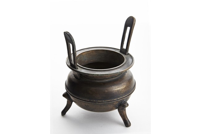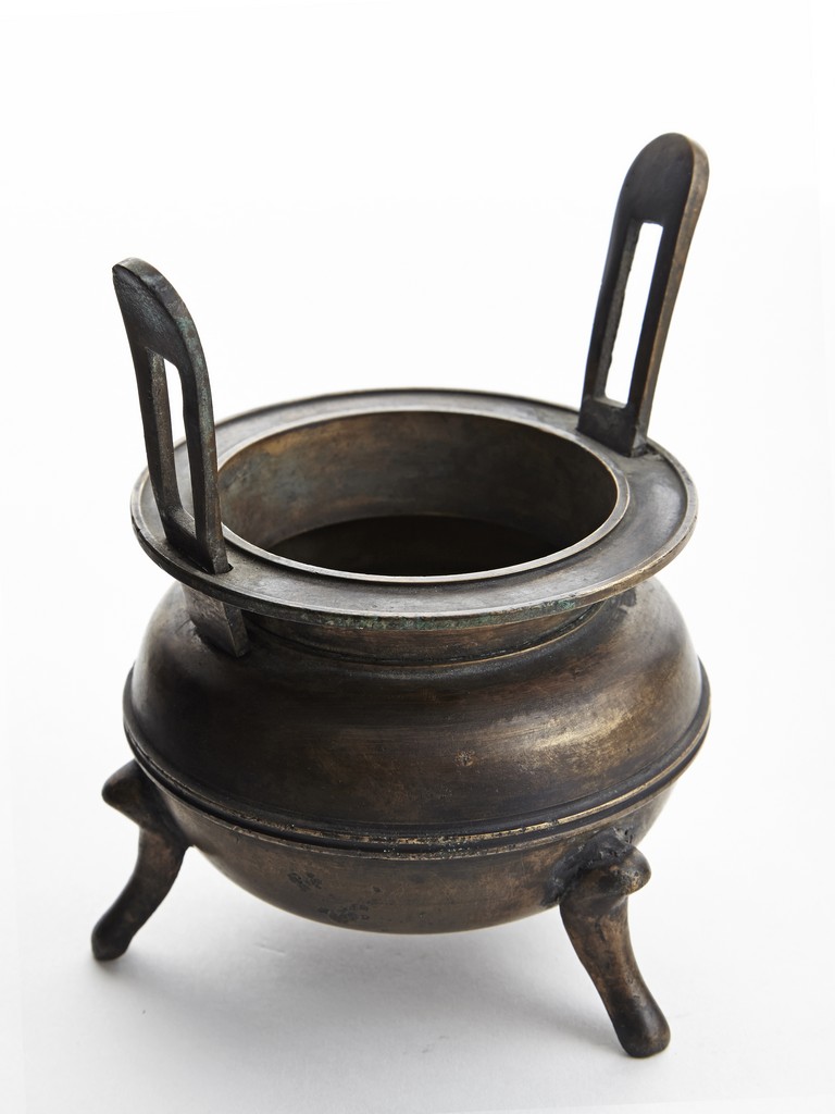 Of compressed globular form, the censer is supported on three splayed feet, the cylindrical neck rises to wide everted rim, flanked by two handles with rectangular opening through the rim. Qing Dynasty period.