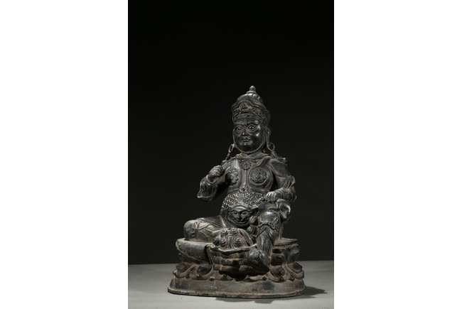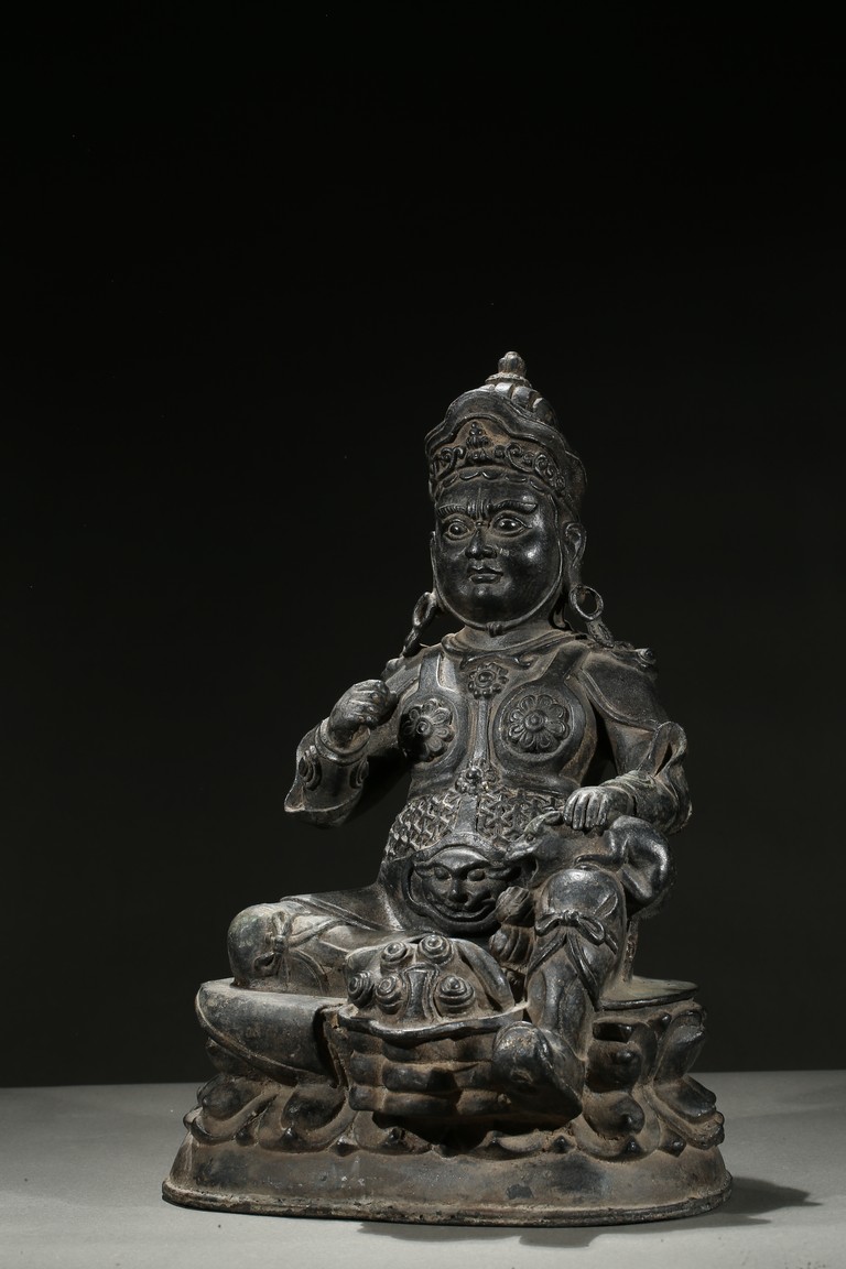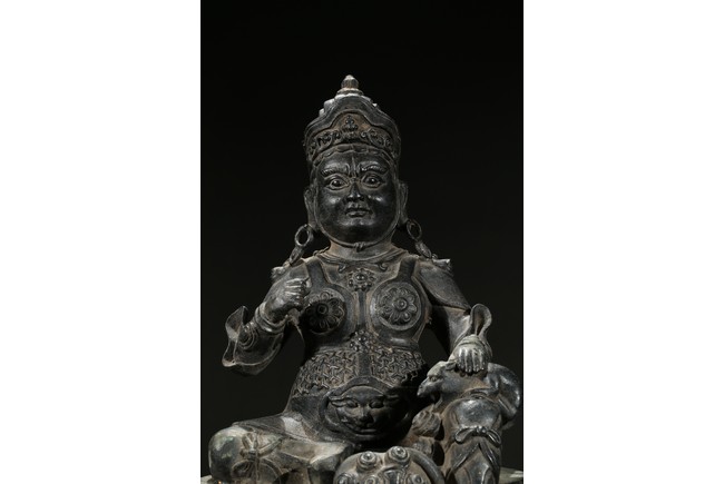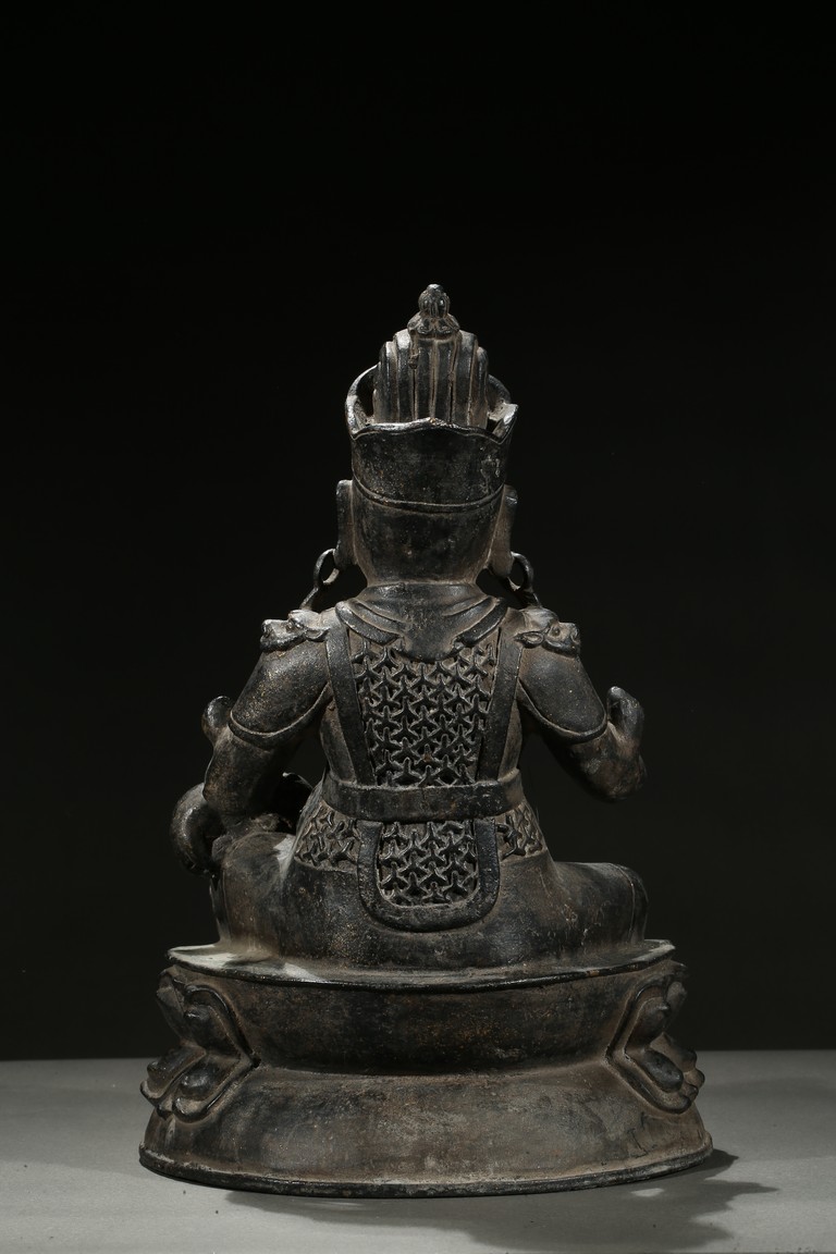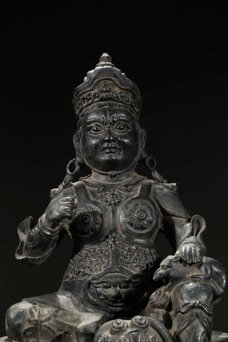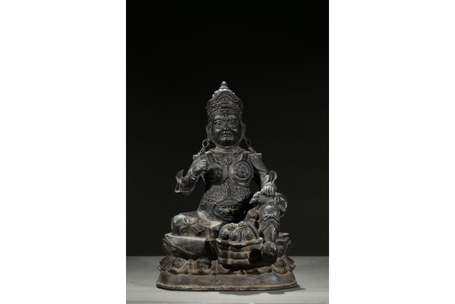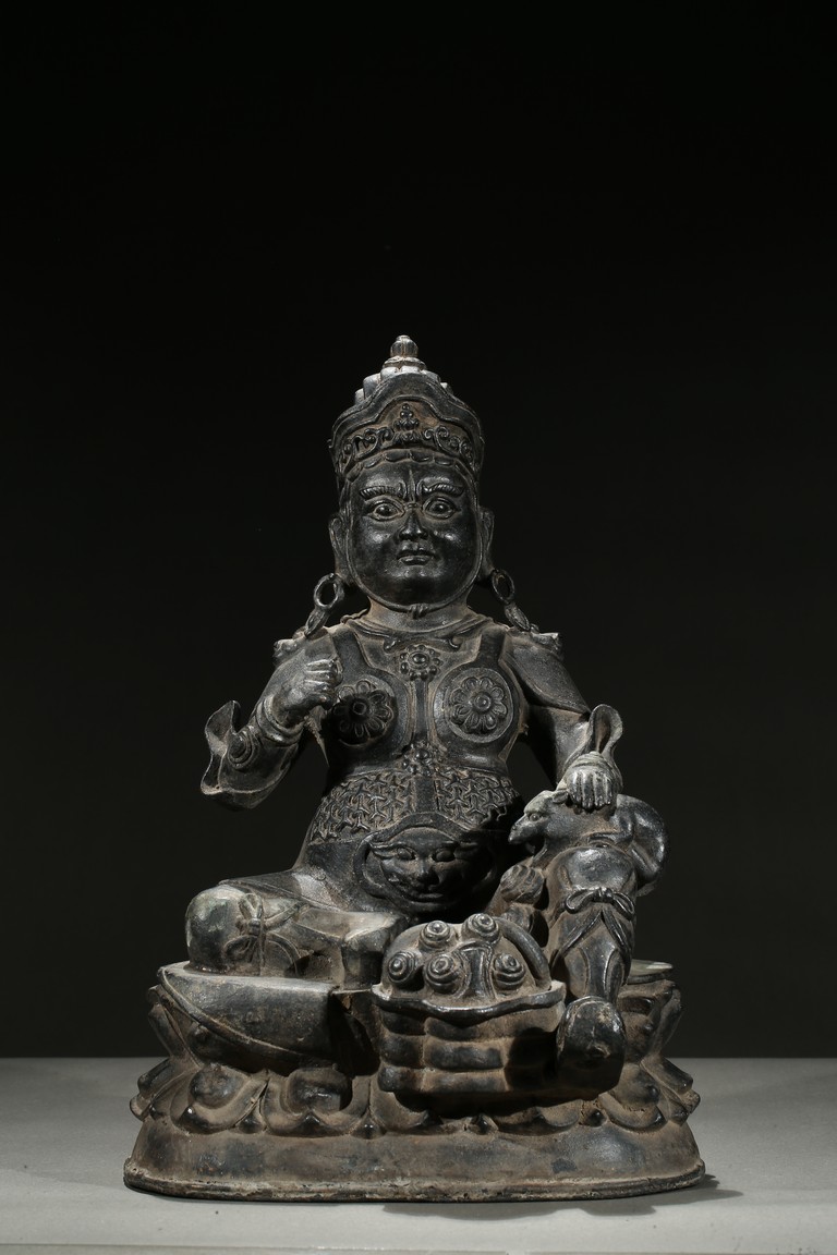 Seated in Royal Ease clad in armour and wearing an ornate crown and body jewellery, holding a mongoose on one hand, the other hand raised in front of chest, with one foot resting upon a kalasha.
