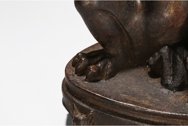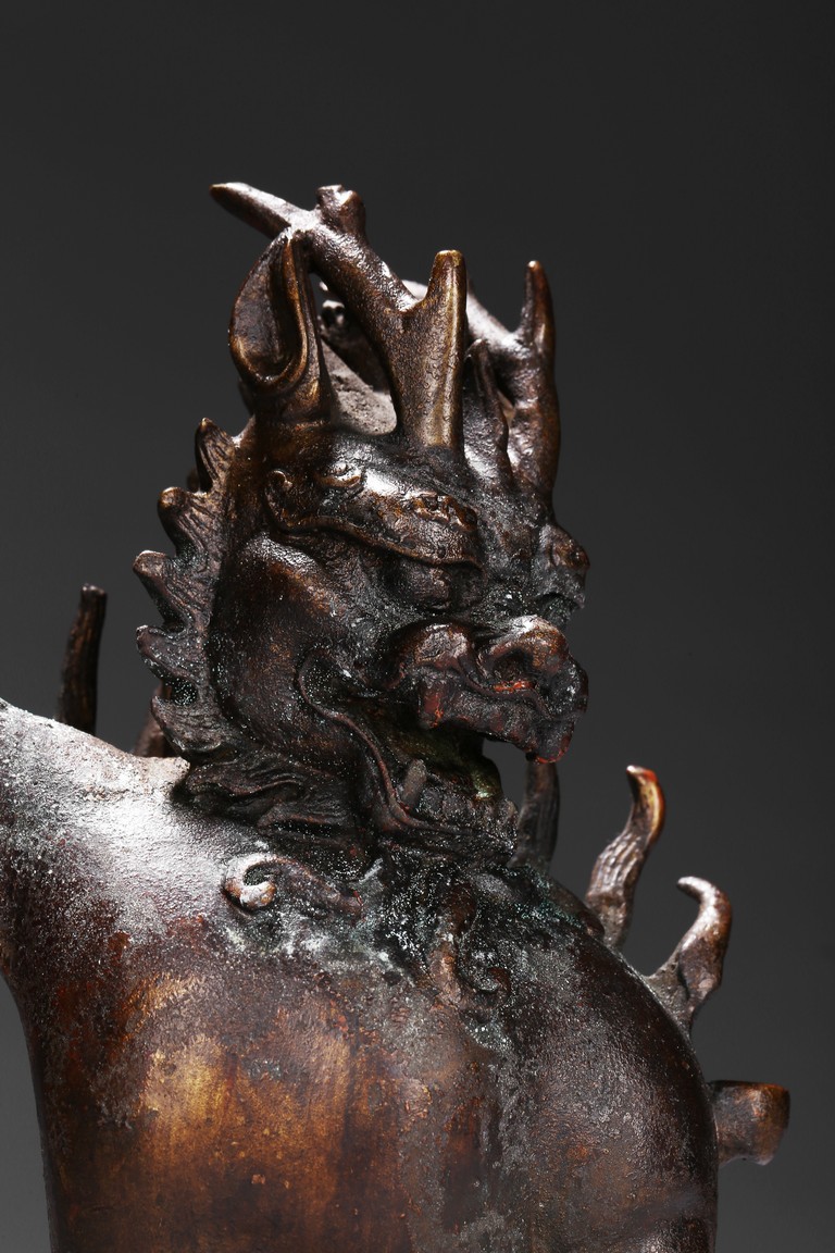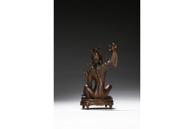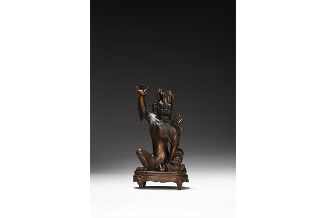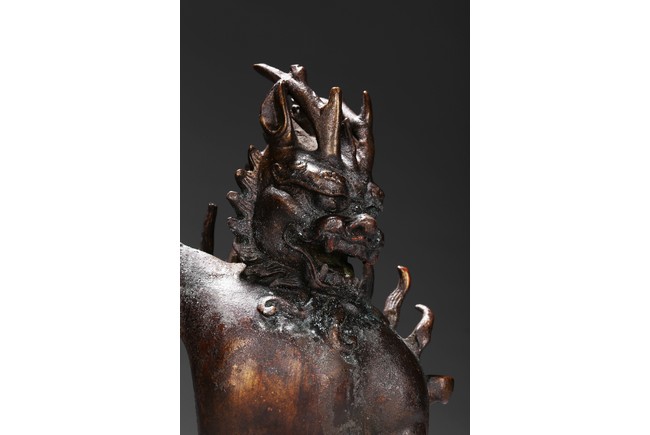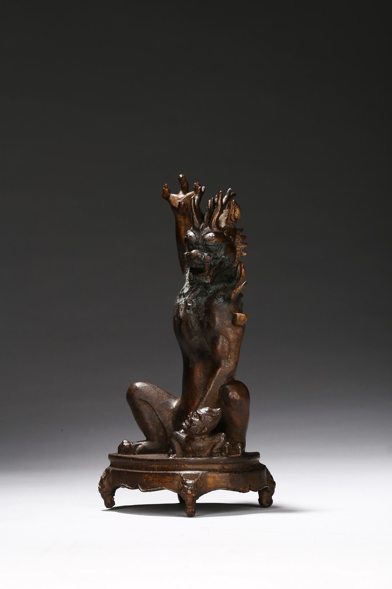 The Dragon King of the South Sea is shown seated on a stand with four claw feet, right claw raised over the shoulder, face modelled in the form of characteristic Dragon head and with ferocious expression. Qing Dynasty period.