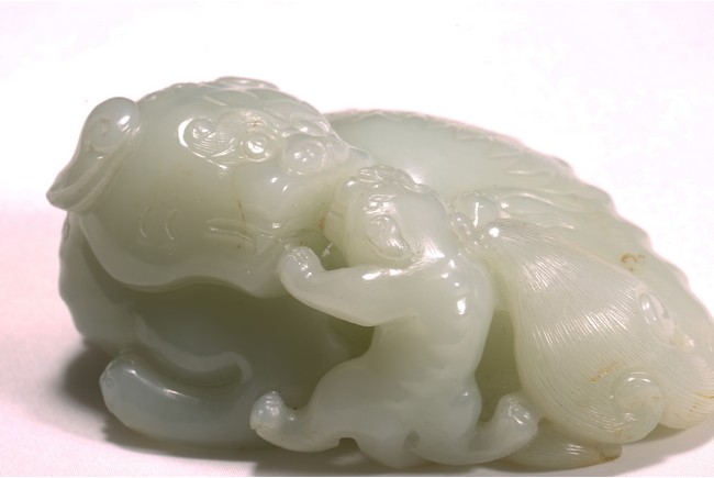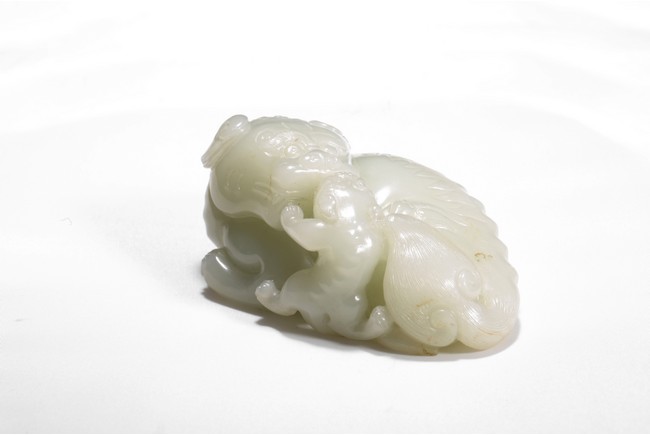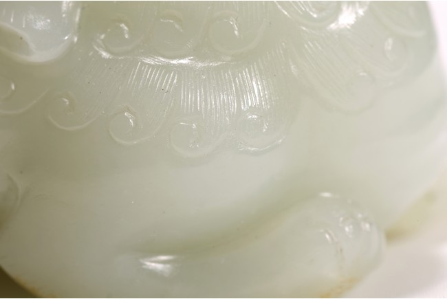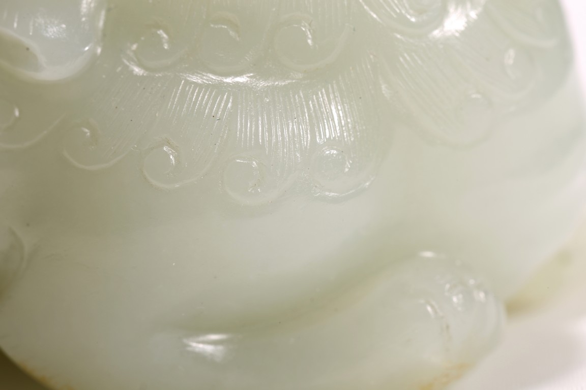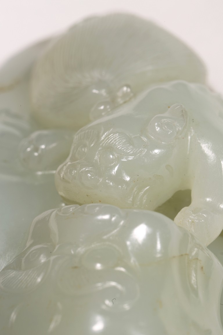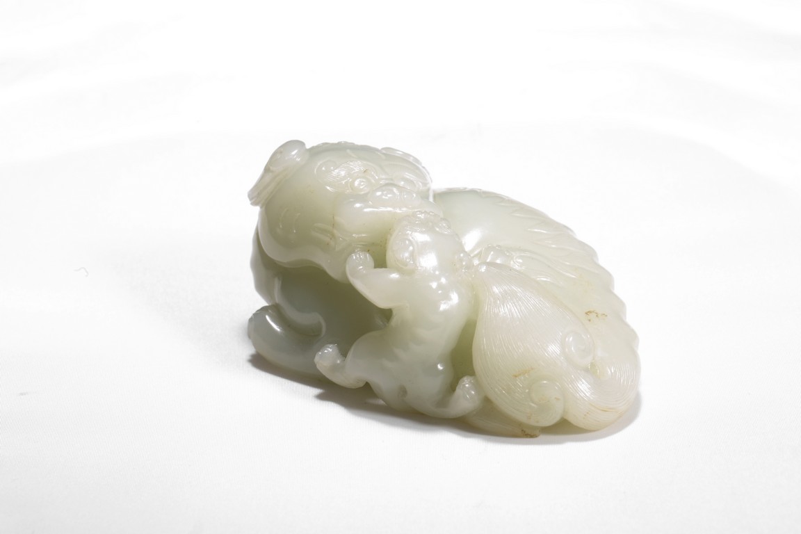 This white jade is exquisitely carved as an older crouching mythical lion with its younger lion cub tucking its paw in its wide-open mouth, its massive head is highlighted by the bulbous eyes, the mane and tail finely detailed with incised lines. The stone is of smooth polished white jade overall. Qing Dynasty Qianlong period.