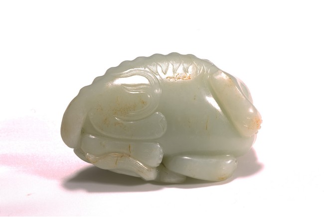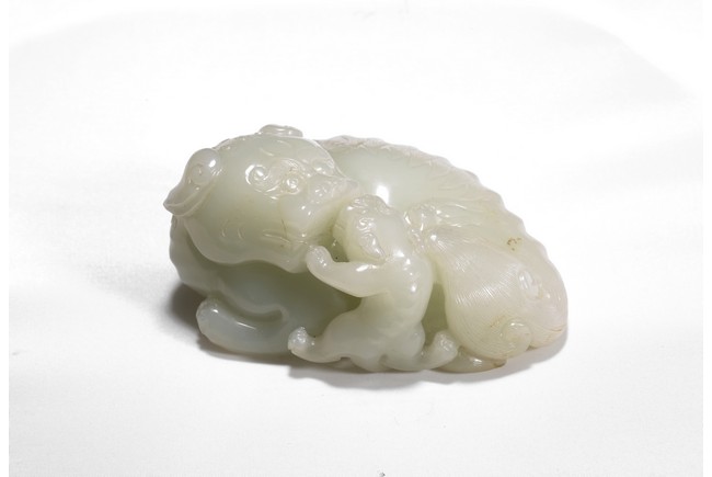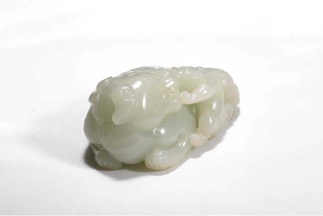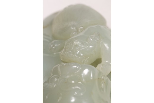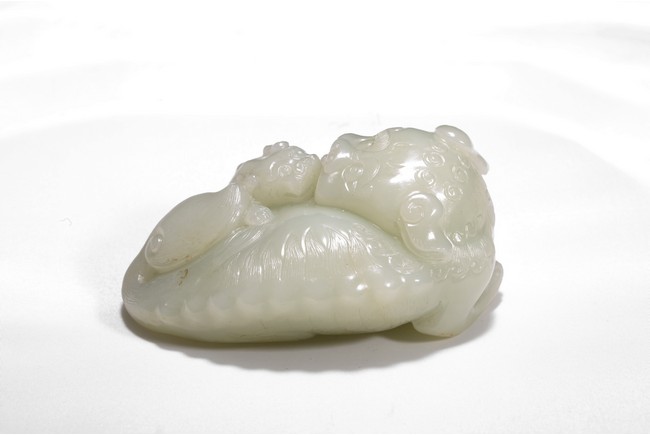 此件拍品為和闐白玉所刻,玉質白皙,溫潤細膩。圓雕大小雙獅,大獅呈俯臥狀,前肢交合,體型肥碩,頭部側扭,雙目圓睜,鼻作如意形,口闊而微張露齒,威猛中略見祥和之神,鎮定中又含起躍之勢。小獅與大獅相向而行,呈親暱嬉戲之態,活潑生動,為清中期圓雕不可多得之精品。
