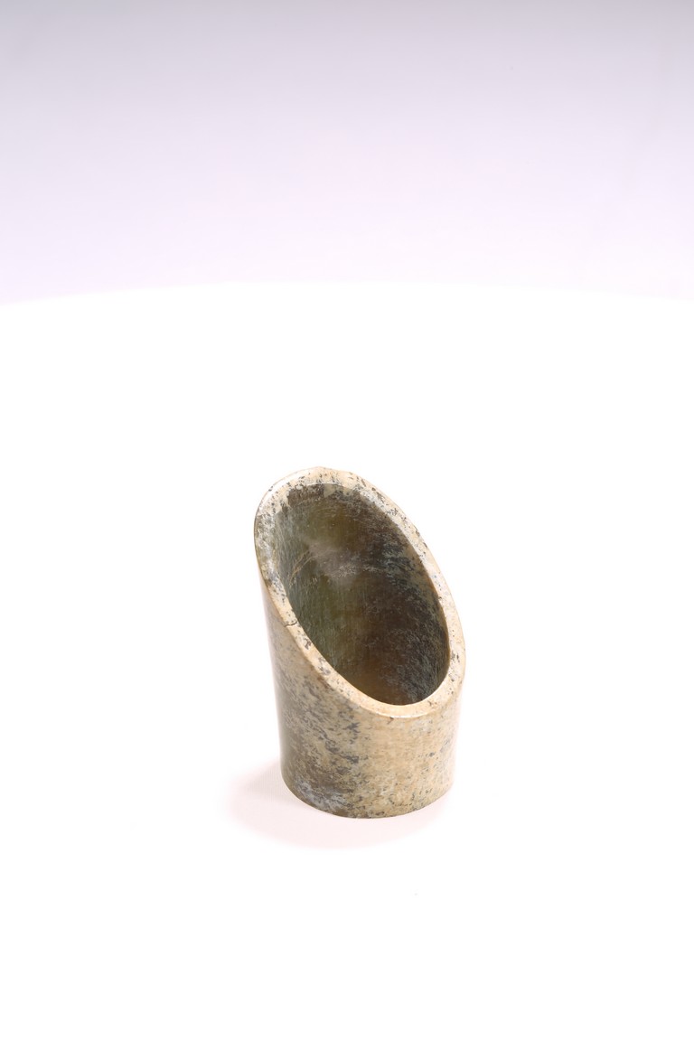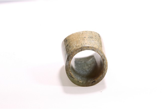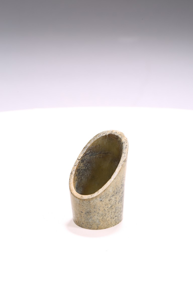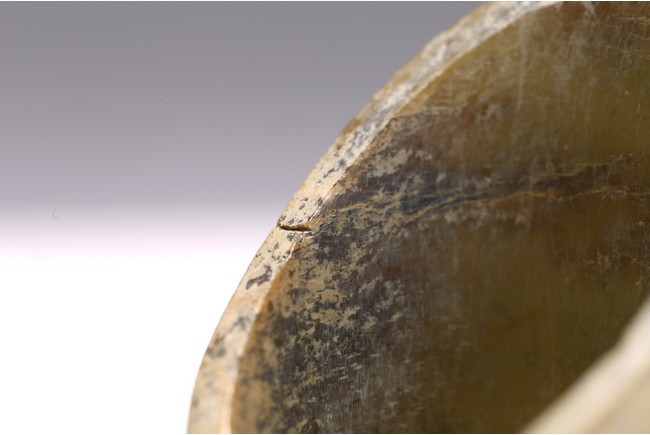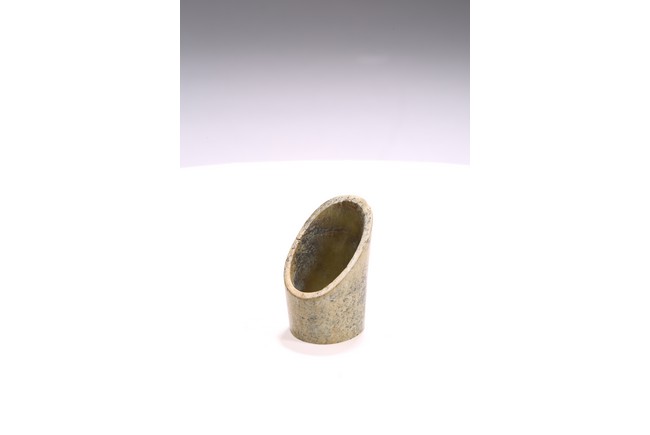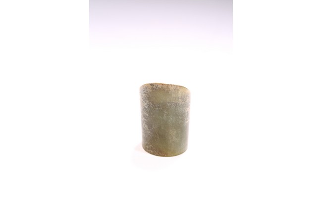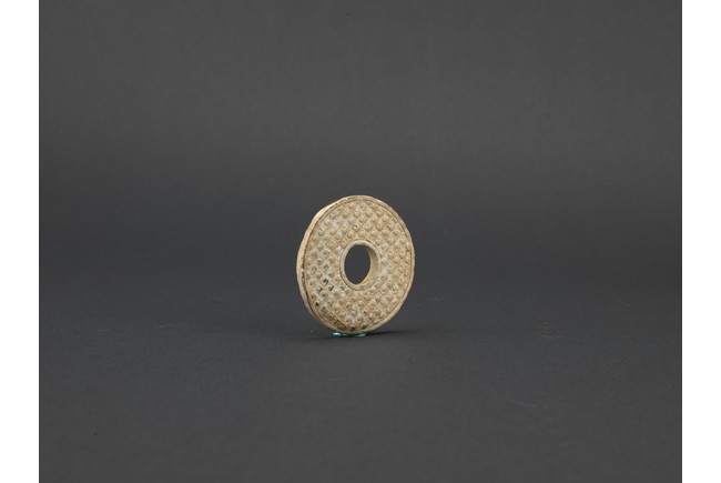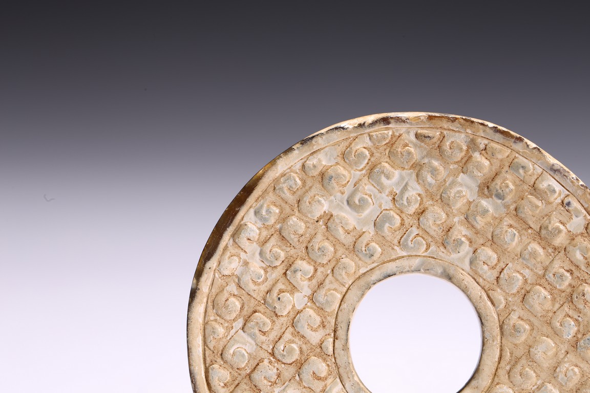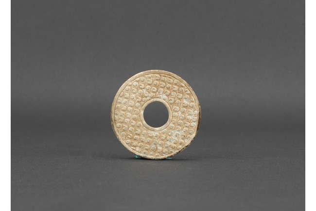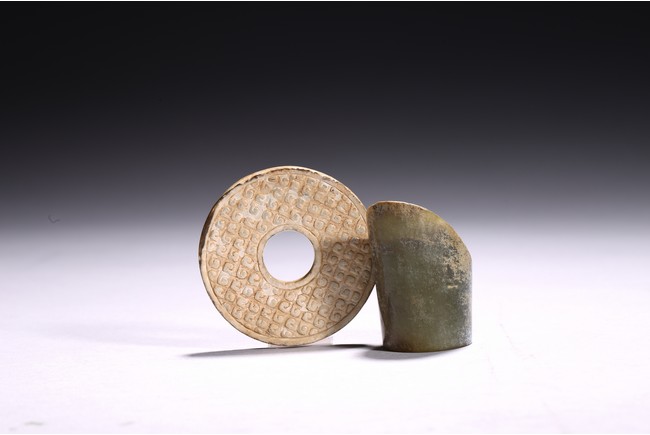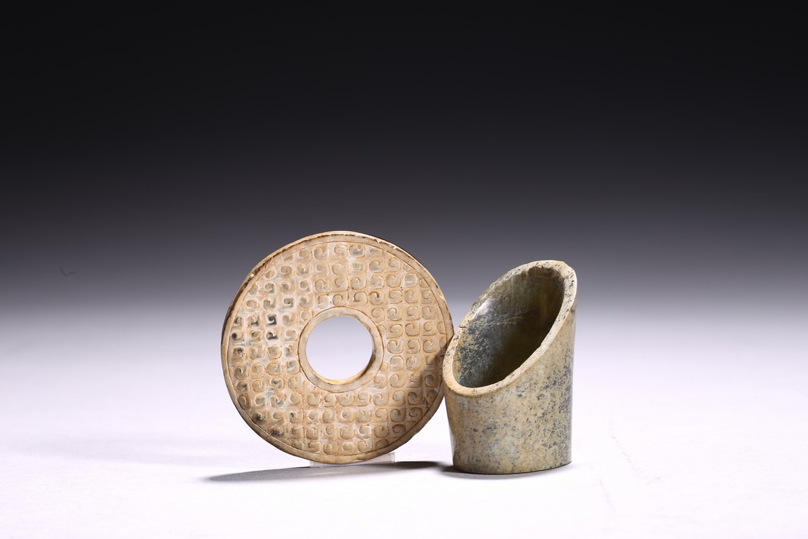 Consists of a small calcified archaic jade bi disc; and a celadon jade carving. Shang/Zhou Dynasty period.