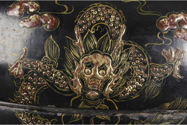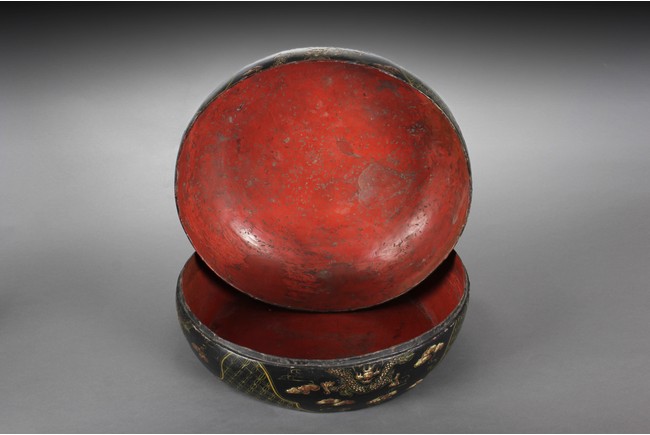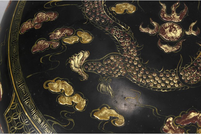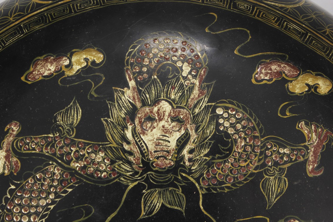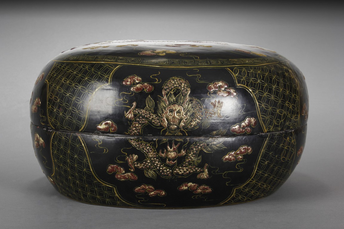 Of compressed globular form, the cover depicts a gild flying five-clawed dragon amidst clouds, surrounding a single flaming pearl, the edges with key-fret pattern, applied over black lacquer, the sides of similar dragon design, with additional Chinese coi