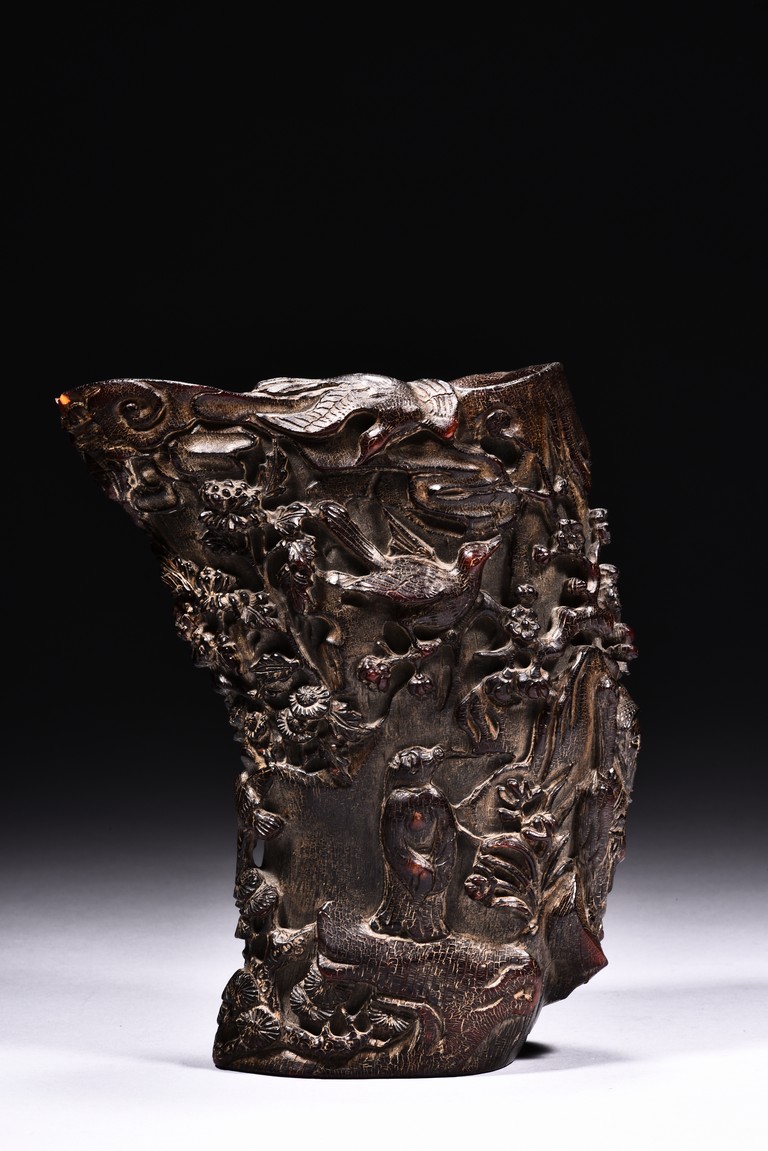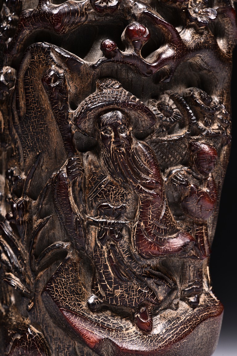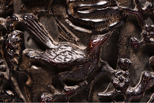 Crisply carved in high relief with figures in a mountain setting strewn with rockwork, pines, chrysanthemum under auspicious cloudline, with a figure standing atop a cliff looking over crane and birds in flight; a figure sleeping under a tree below various birds; a elderly man accompanied by an attendant under a plum tree. The base carved with four character 'CHONG ZHEN' mark.