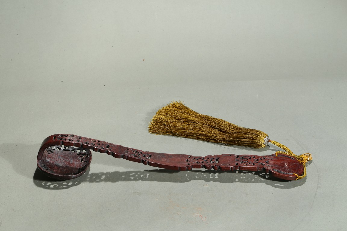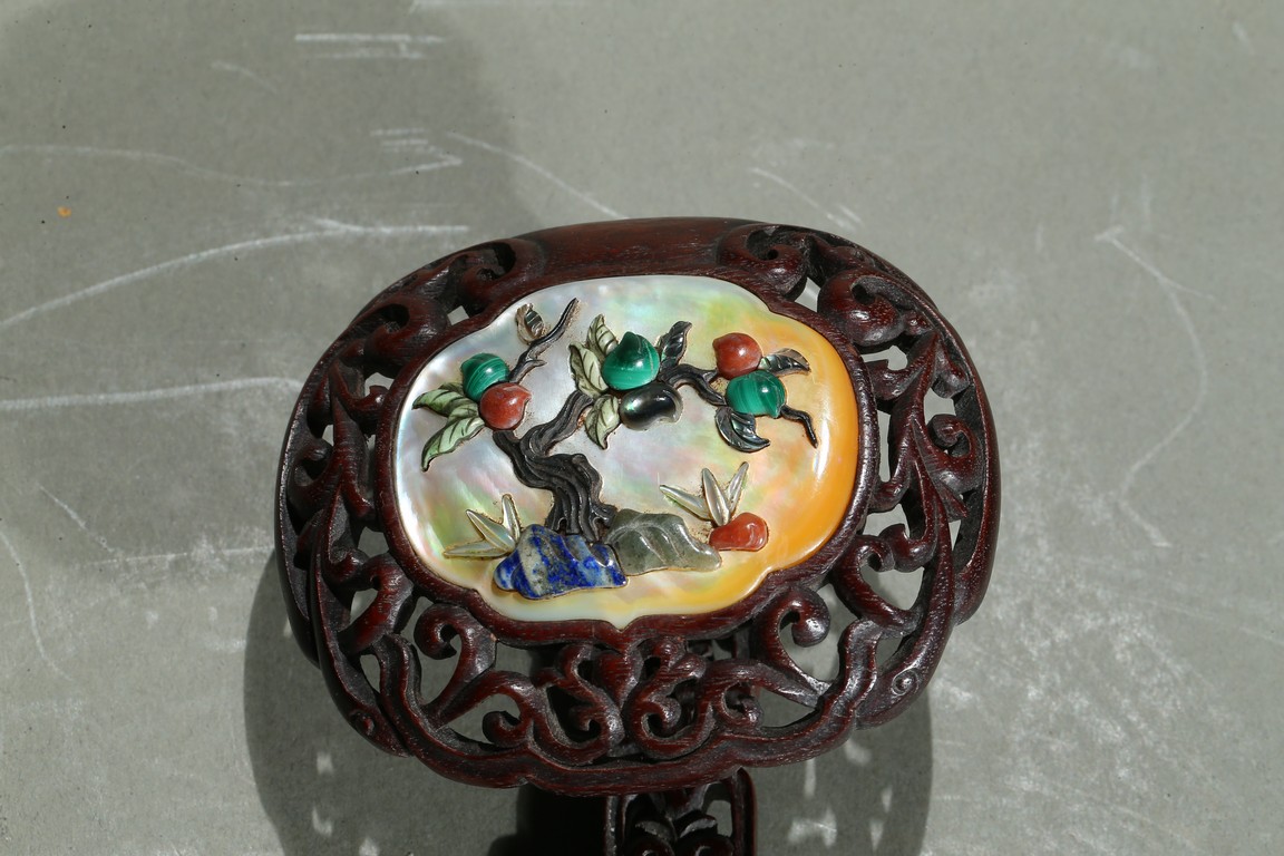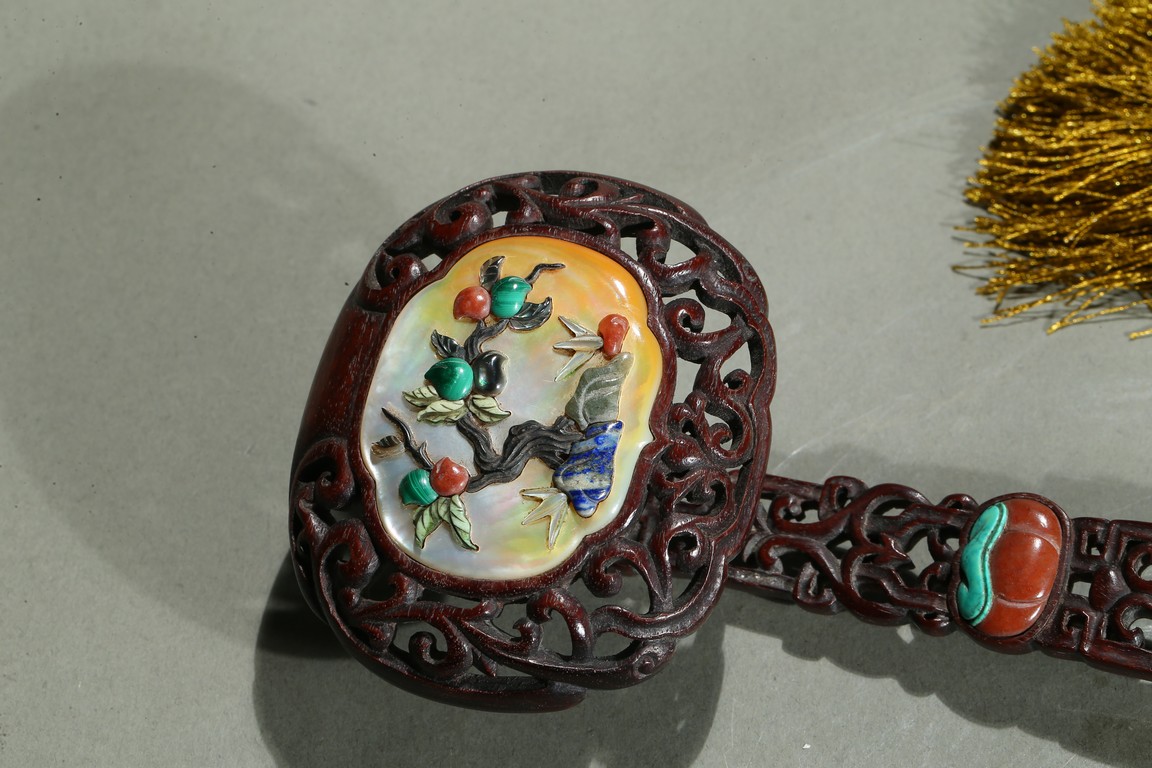 The ruyi scepter finely embellished with mother of pearl to the head, middle section, and the end, all further inlaid with various semi-precious gems to depict peach tree and longevity god.