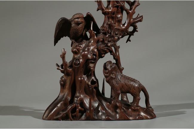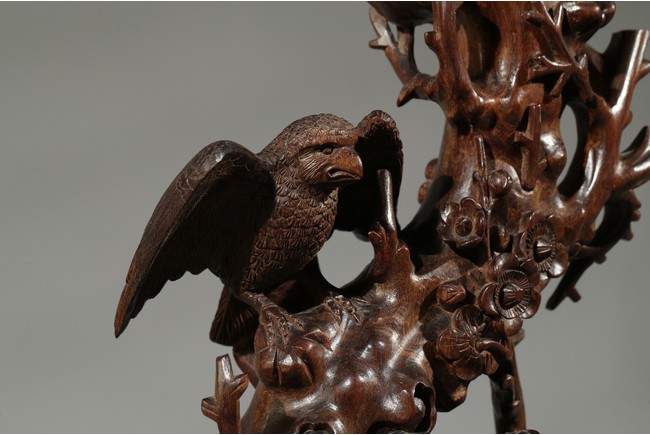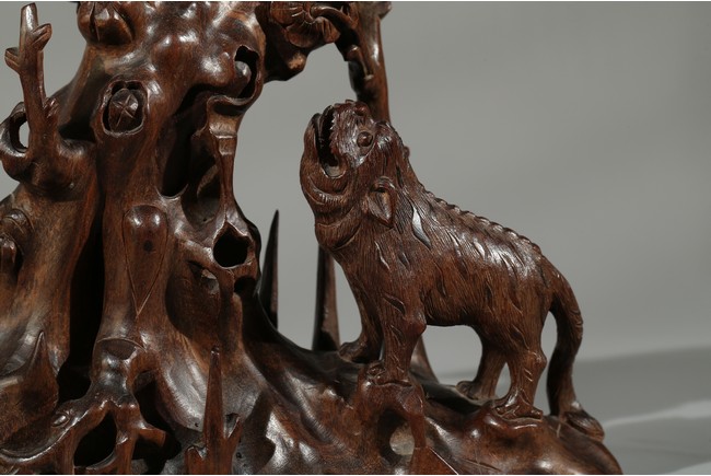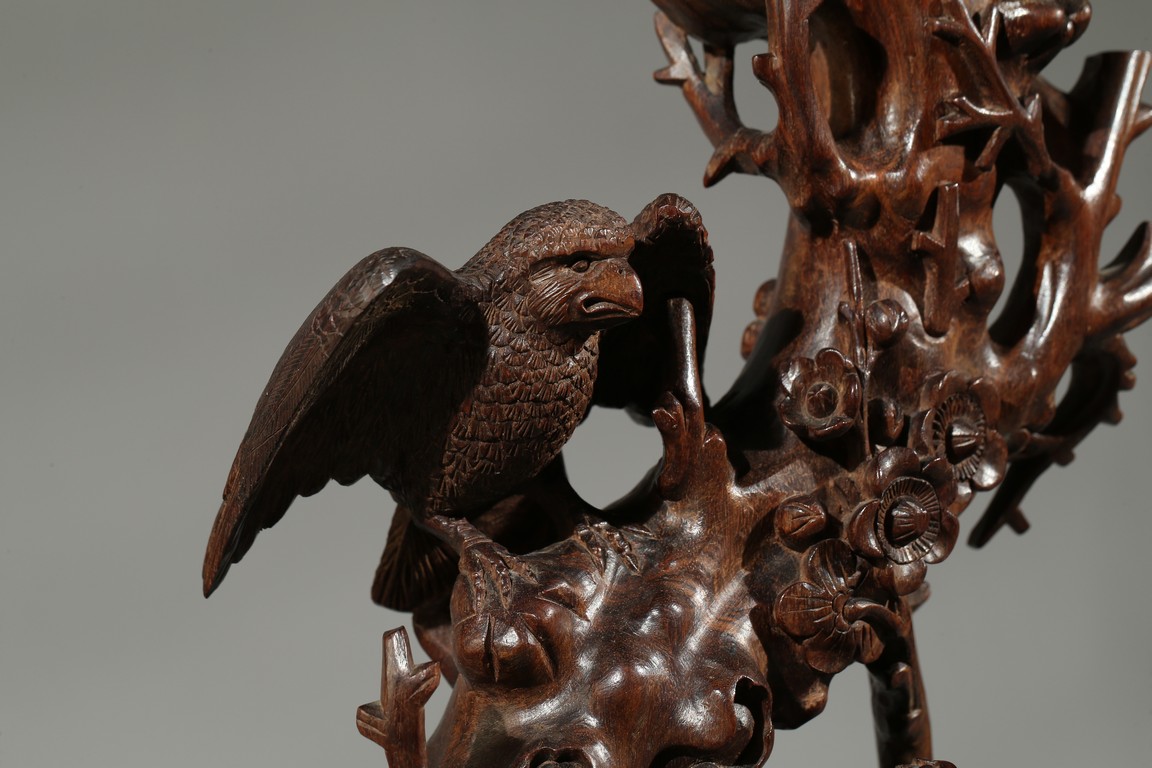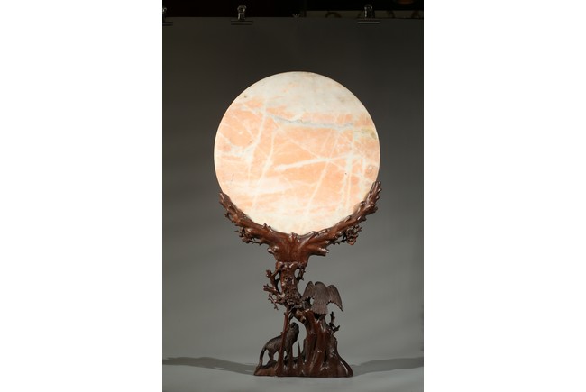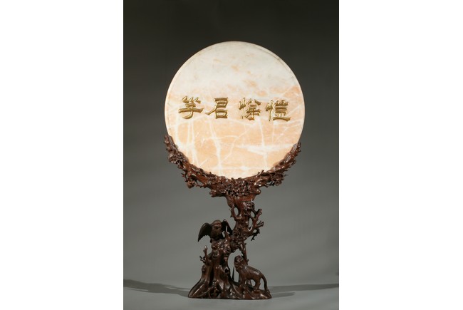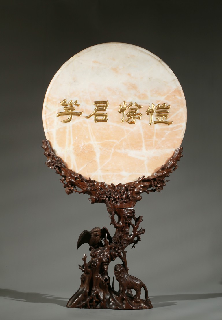 The marble disc is carved in flattened circular shape with four gilt Chinese characters, all supported by a well carved hardwood stand. Republic period.