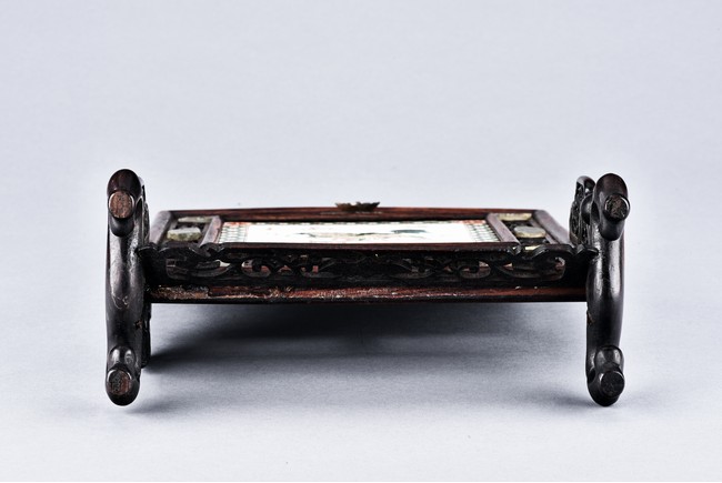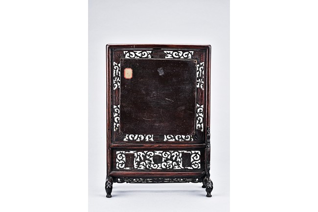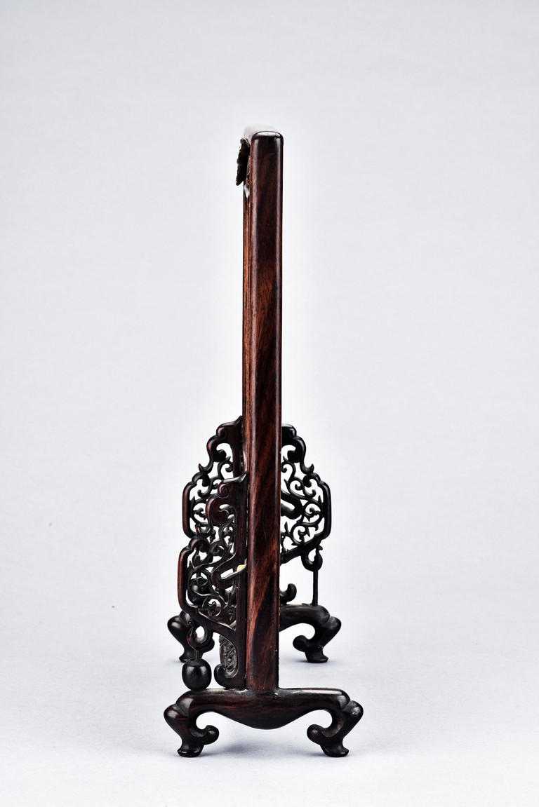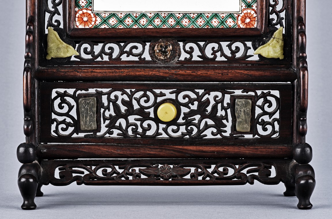 Of rectangular form, the wucai decorated porcelain panel is inset on the table screen, with depiction of a Buddhist lion playing ball, with openwork scrolling floral pattern and various jades embellished outside the plaque.
