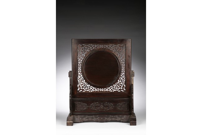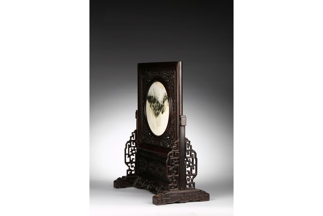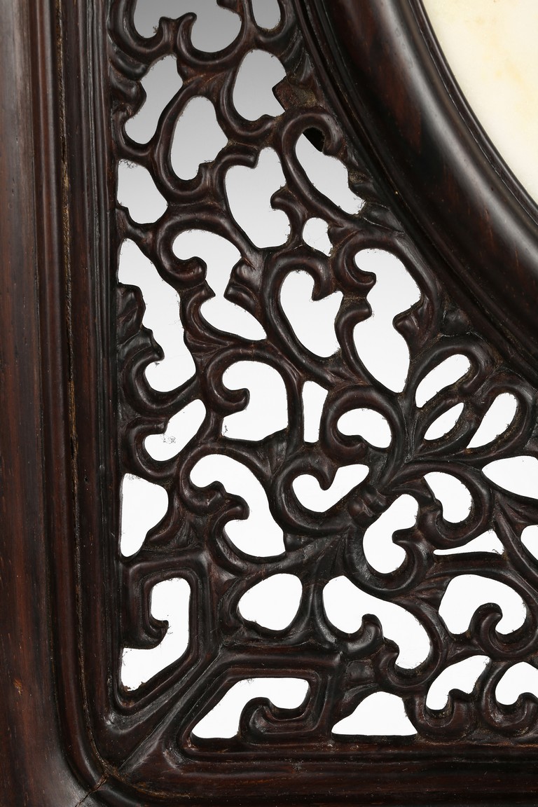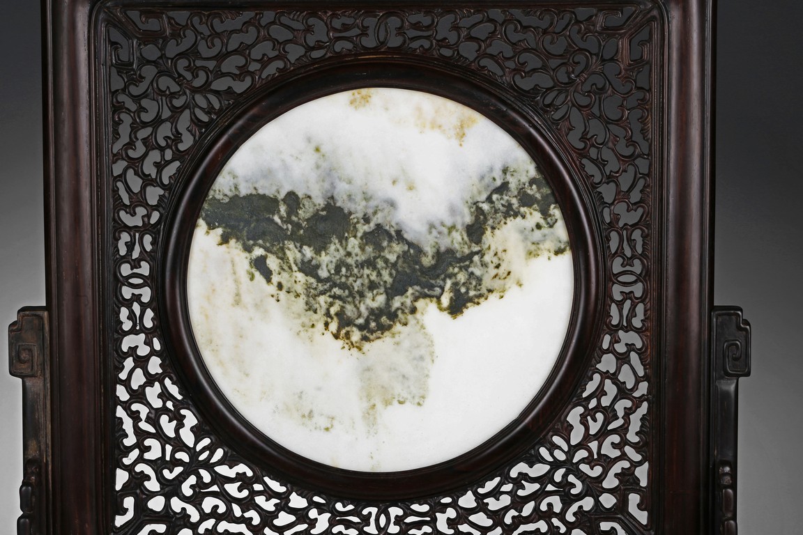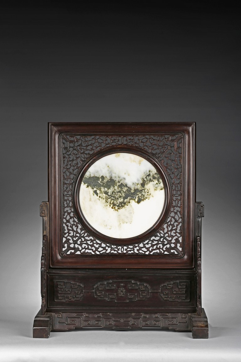 The rectangular wood frame holding a striated marble circular plaque with markings that resemble a horizontal mountain, the frame fitting into a wood stand with key-fret decorations. Republic period.