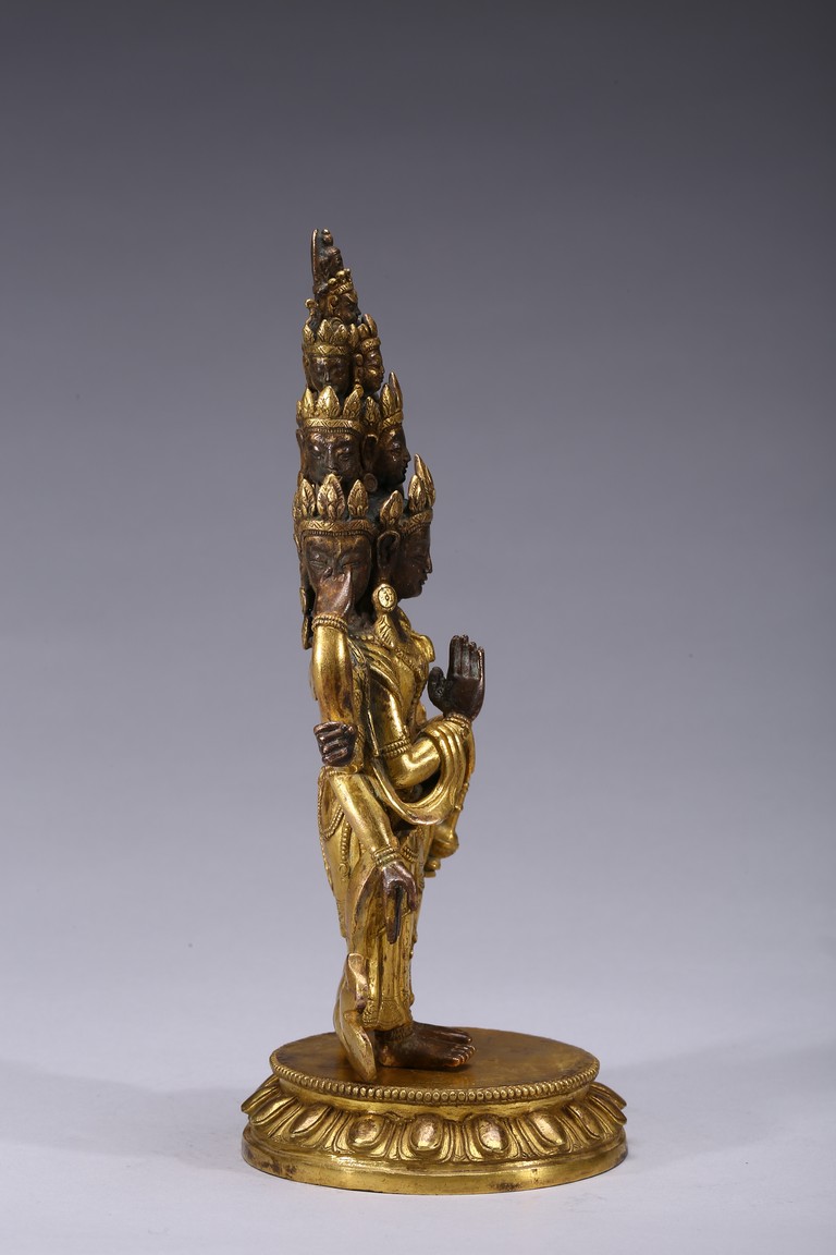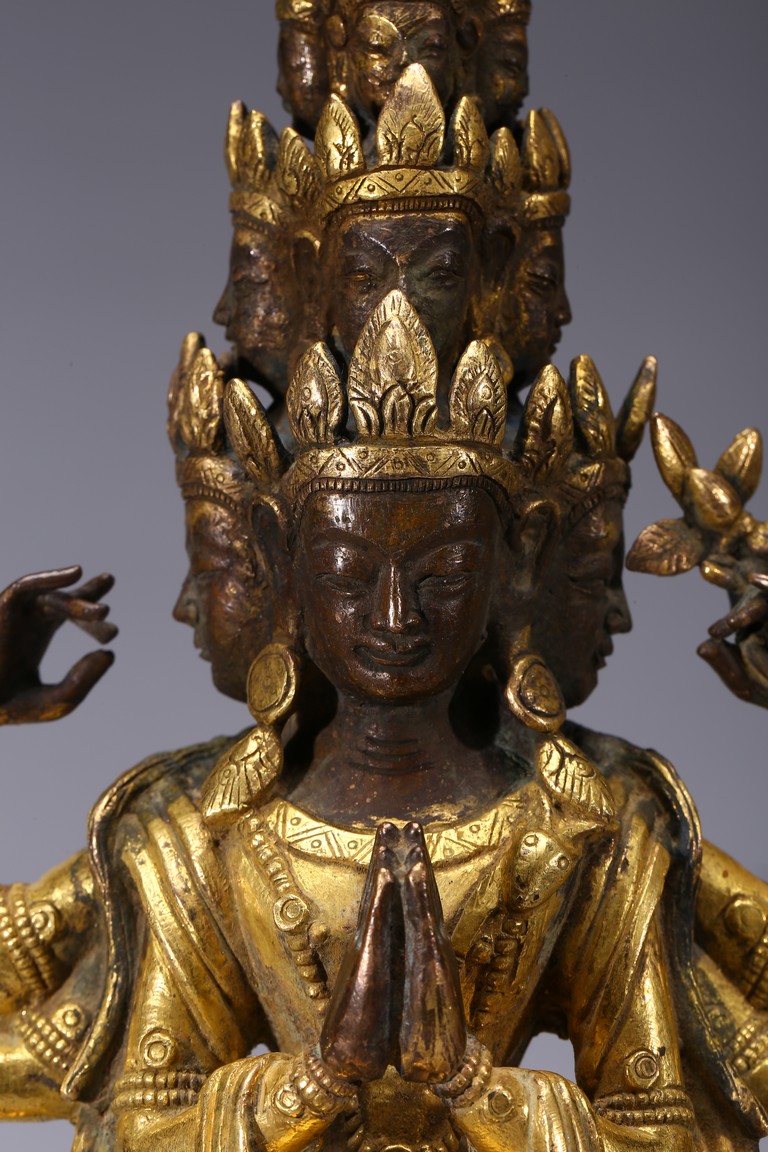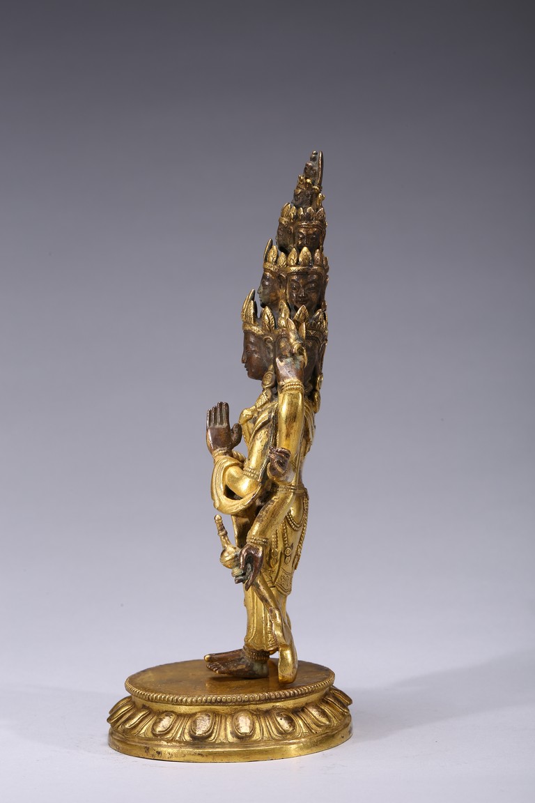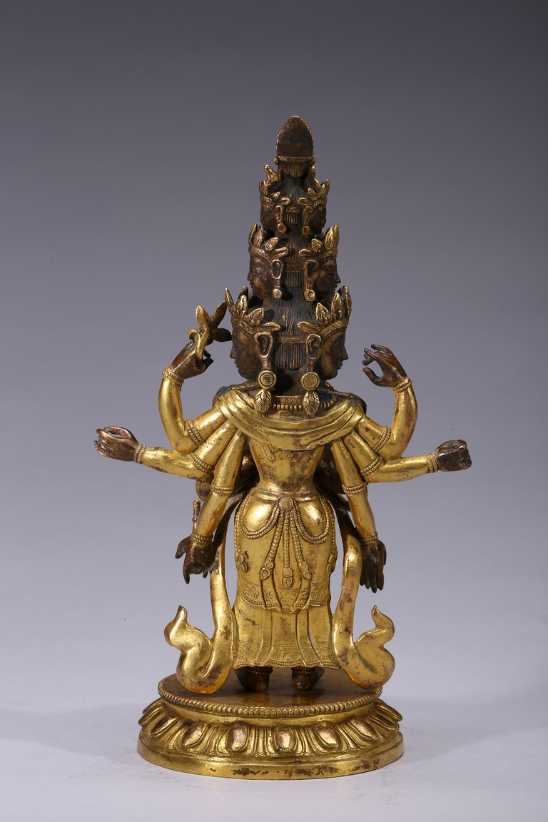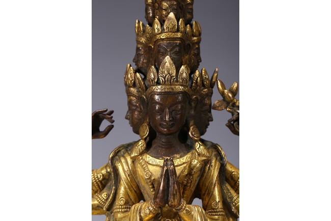 The bodhisattva is shown standing upon a lotus throne, with primary hands clasped together and six arms extending out, wearing robe with incised hem and billowing scarves around arms and shoulder, with eleven faces each framed with pointed crown. Qing Dynasty period.